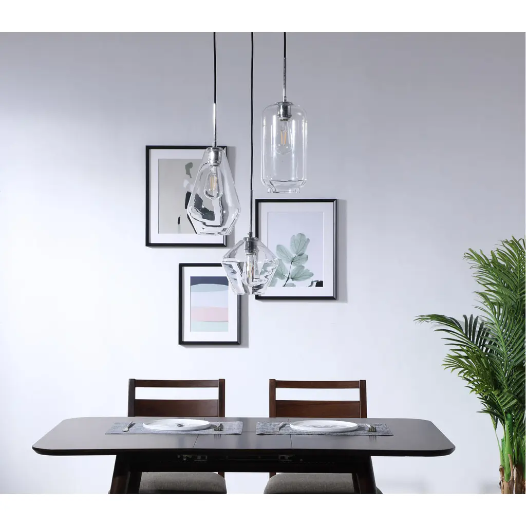 The Gene Collection of lights will be sure to have your guests admire your modern sense of style with the beautiful simplicity of its shape and form. The canopy supports three pendant lights that can be adjusted to different heights in order to create dramatic levels of lights and shadows. The pendant's clean lines created by the cords and diamond shaped shades makes this the perfect lighting addition to any home that is in need of a chic modern flair. Available in a brass, chrome, or black finish, with either a clear or frosted diamond glass shade, enhance your dining room, living room, or bedroom with the Gene Collection hanging pendant and live in sleek contemporary style (light bulbs not included).