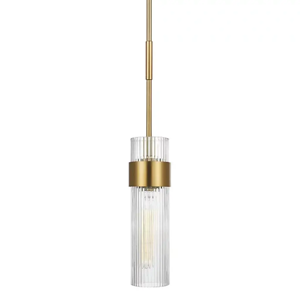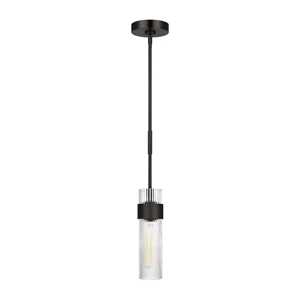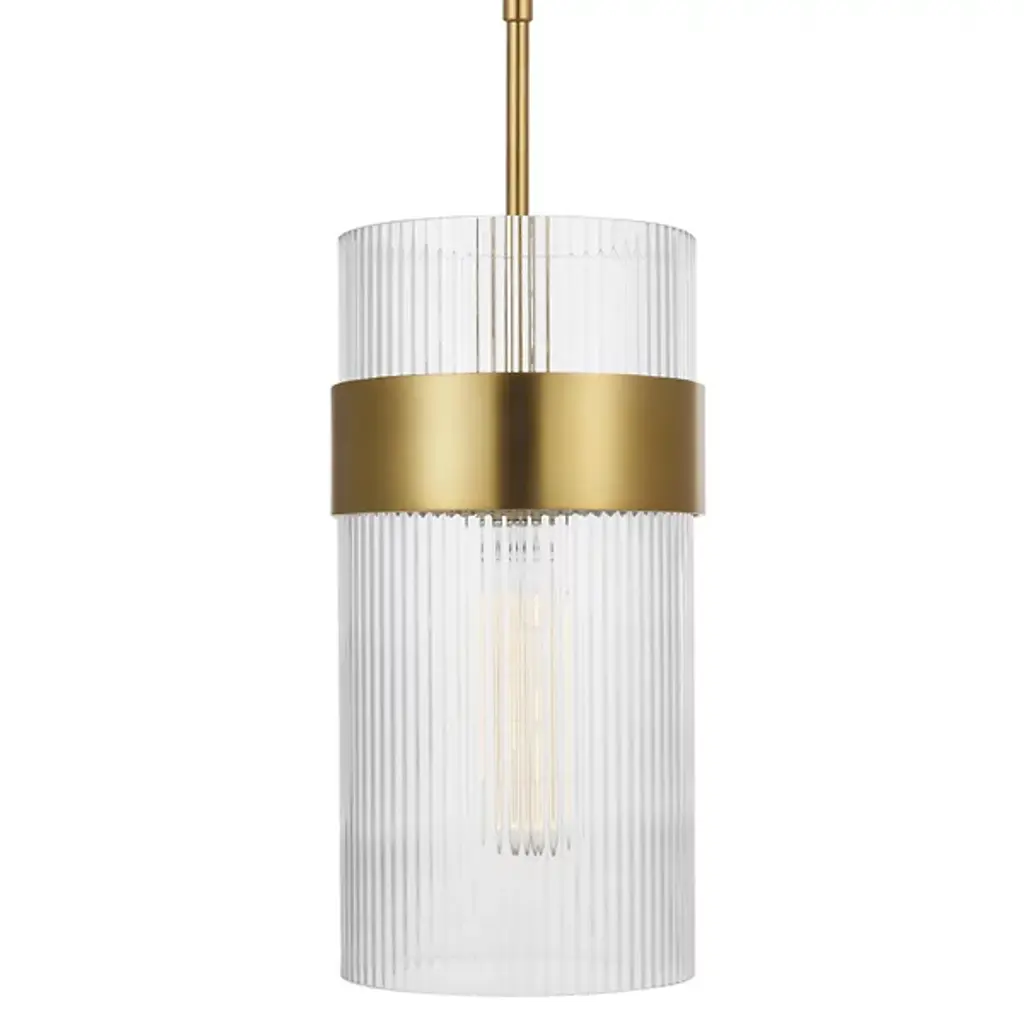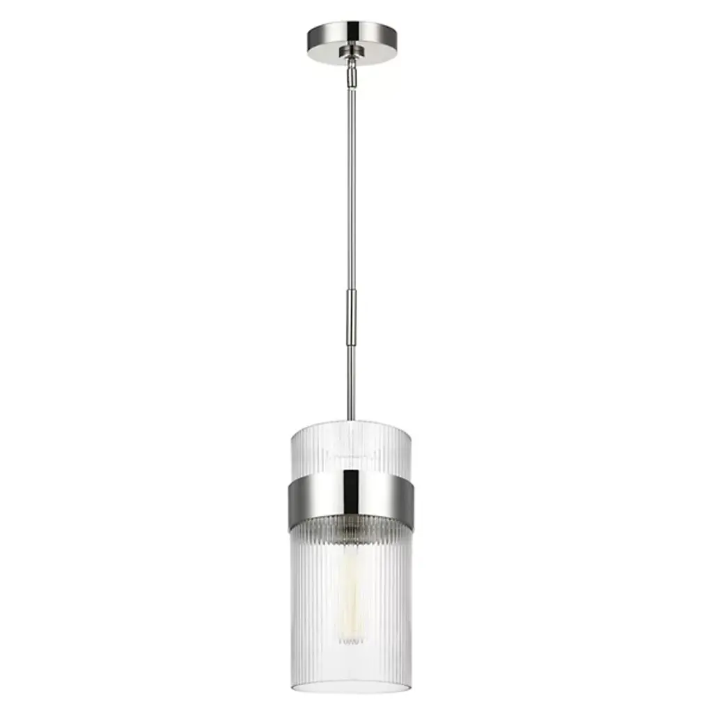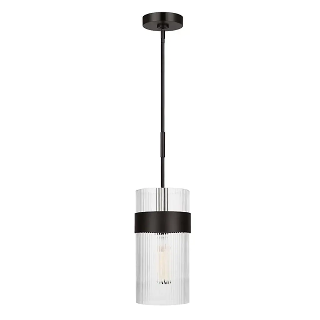 The Geneva Mini Pendant by Visual Comfort Studio, formerly known as Chapman & Myers, is a small, simply structured, and sophisticated addition to spaces. Wrapped with a sleek metal band that has a beautiful finish, a tall, rippled glass shade filters a warm and welcoming layer of light onto surroundings as it is suspended by a single down rod and round canopy. This textured, cylindrical shade has an elegant and dynamic look that keeps this piece tailored, ready to make a statement in whatever space it brightens.
