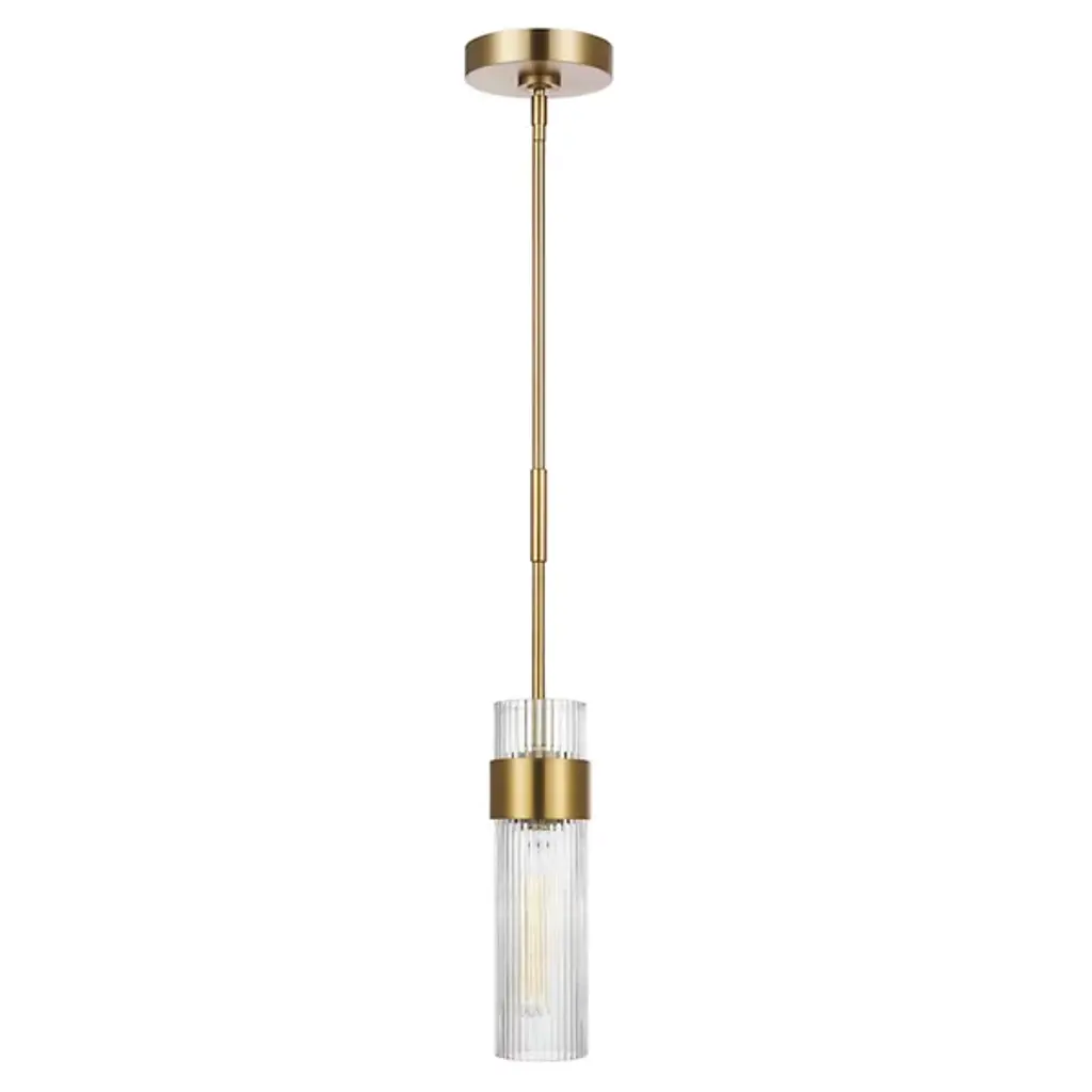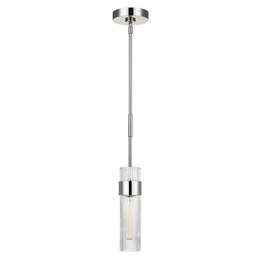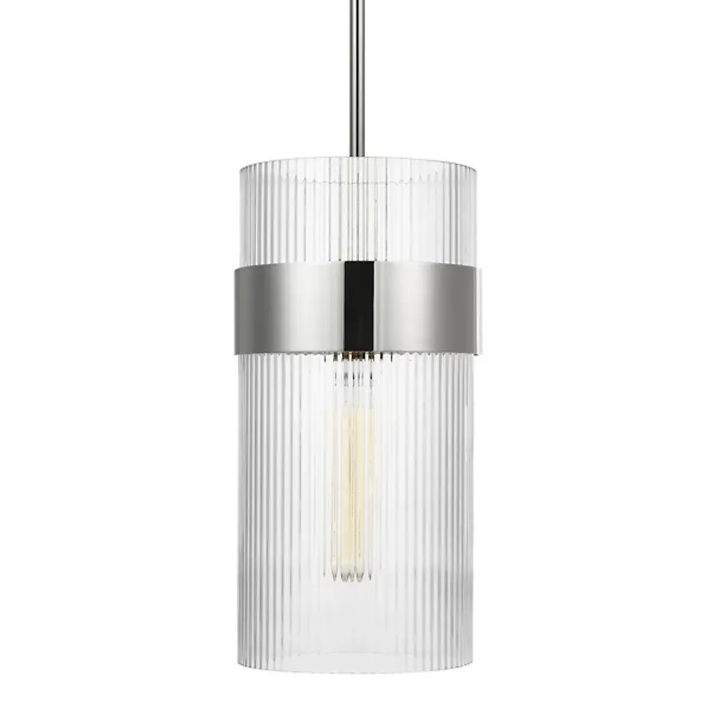 The Geneva Mini Pendant by Visual Comfort Studio, formerly known as Chapman & Myers, is a small, simply structured, and sophisticated addition to spaces. Wrapped with a sleek metal band that has a beautiful finish, a tall, rippled glass shade filters a warm and welcoming layer of light onto surroundings as it is suspended by a single down rod and round canopy. This textured, cylindrical shade has an elegant and dynamic look that keeps this piece tailored, ready to make a statement in whatever space it brightens.