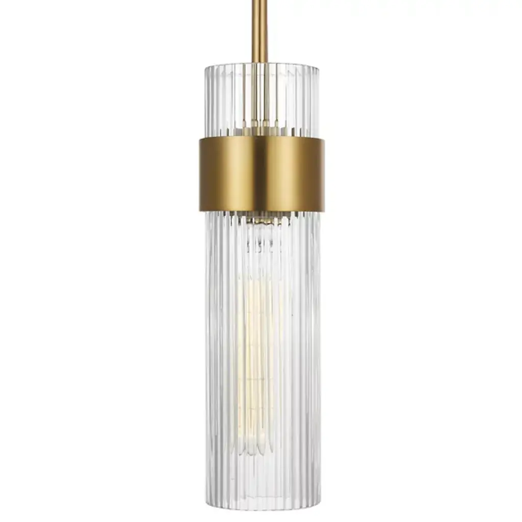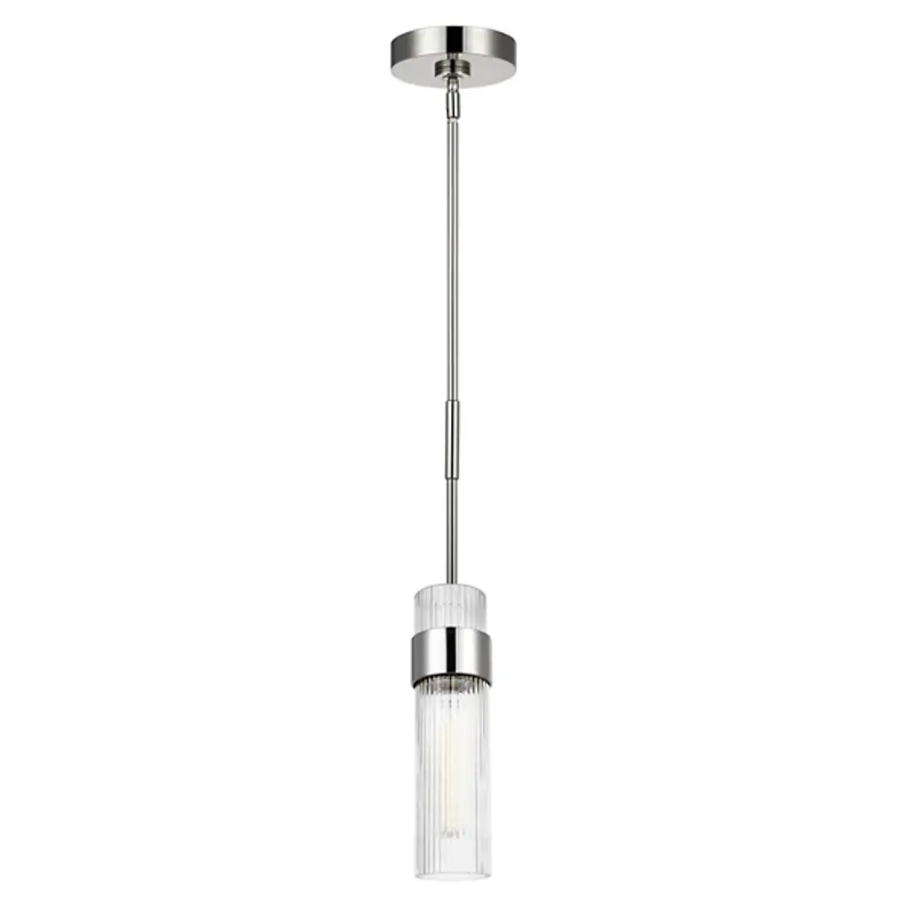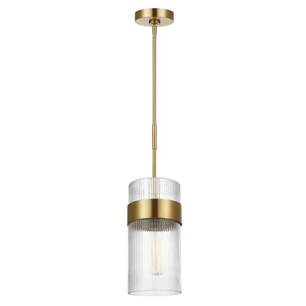The Geneva Mini Pendant by Visual Comfort Studio, formerly known as Chapman & Myers, is a small, simply structured, and sophisticated addition to spaces. Wrapped with a sleek metal band that has a beautiful finish, a tall, rippled glass shade filters a warm and welcoming layer of light onto surroundings as it is suspended by a single down rod and round canopy. This textured, cylindrical shade has an elegant and dynamic look that keeps this piece tailored, ready to make a statement in whatever space it brightens.