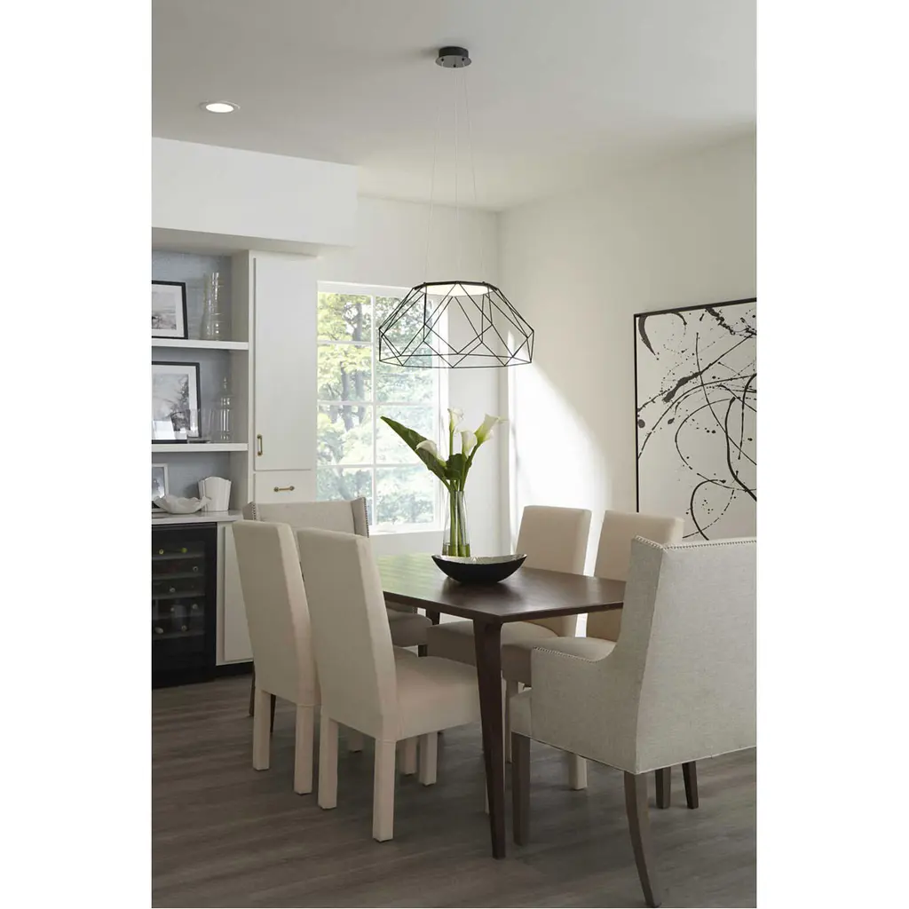 Take a contemporary space to a new level with the Geodesic LED Collection Matte Black LED Mid-Century Modern Large Pendant Hanging Light. The open diamond-patterned frame is coated in a classic matte black finish and is suspended from cables attached to a round ceiling plate. A uniform, continuous disc of light glows through the airy frame.