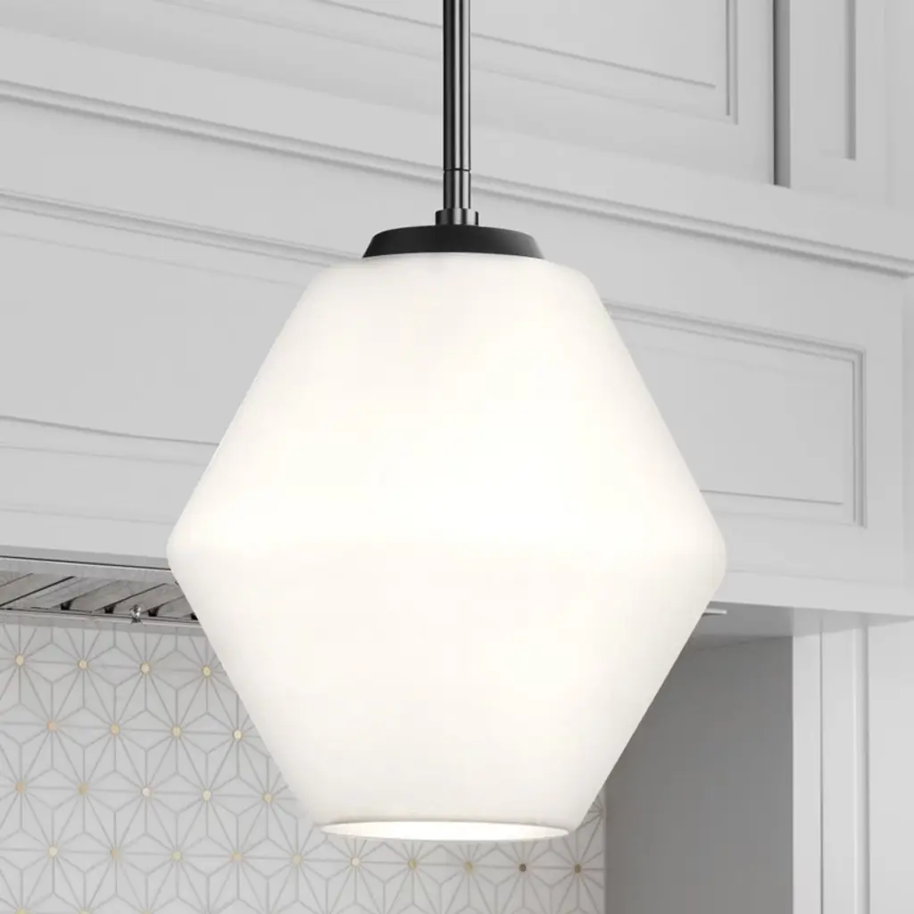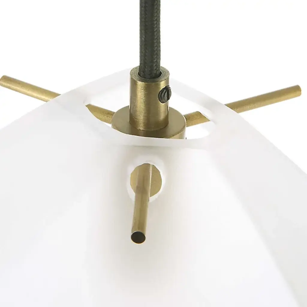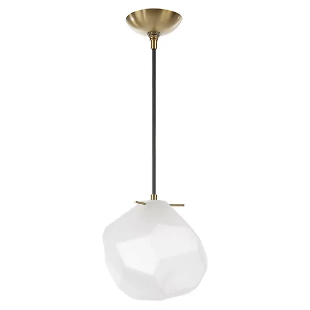 The Geodesic Mini Pendant from Uttermost features a striking 8-inch frosted geometric-shaped glass, serving as the focal point of its elegant design. The pendant is beautifully accented with a rich matte antique brass finish, adding a touch of sophistication to any room. It comes with 15 feet of black fabric-covered wire, allowing for adjustable installation to suit various ceiling heights. The fixture is equipped with a single 60-watt maximum candelabra socket, providing both style and functionality.