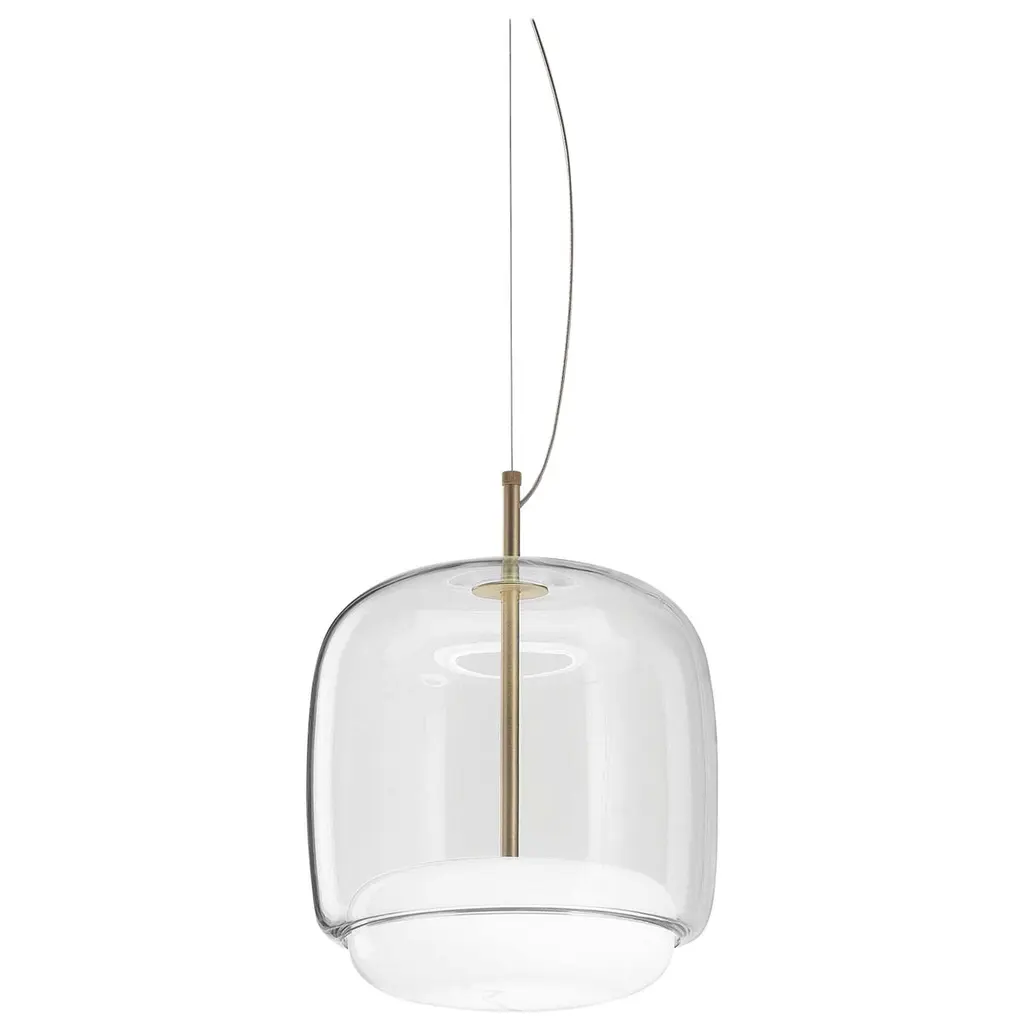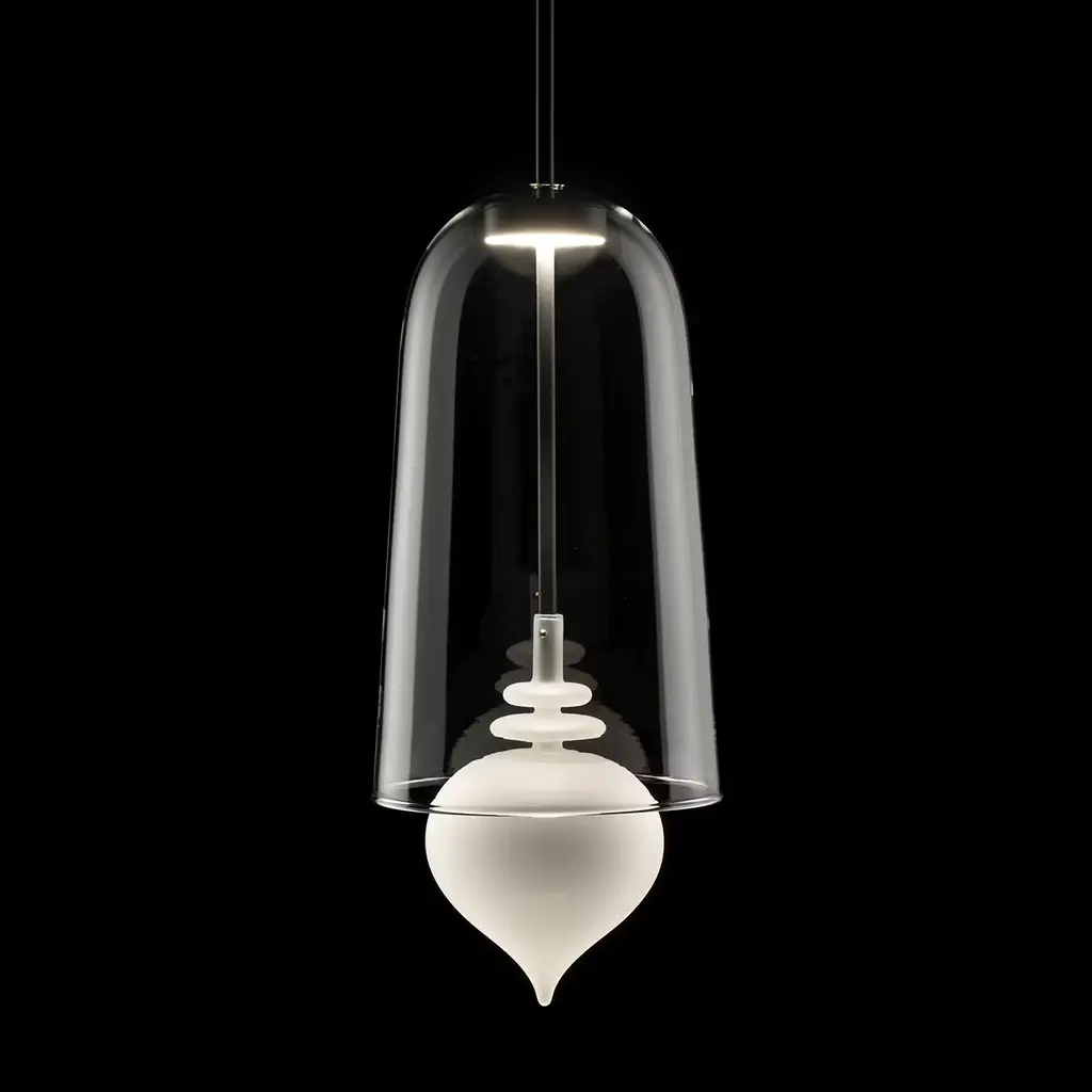 This ceiling lamp features a transparent glass shade with frosted white pendant. It is also available with a gold leaf pendant and/or a brown metalized glass shade. Its shape is inspired by the traditional ritual bells used in Tibet. The item is entirely crafted by hand by expert artisans. Made in Italy. Light source: 7 watt, LED module - 2700 K.