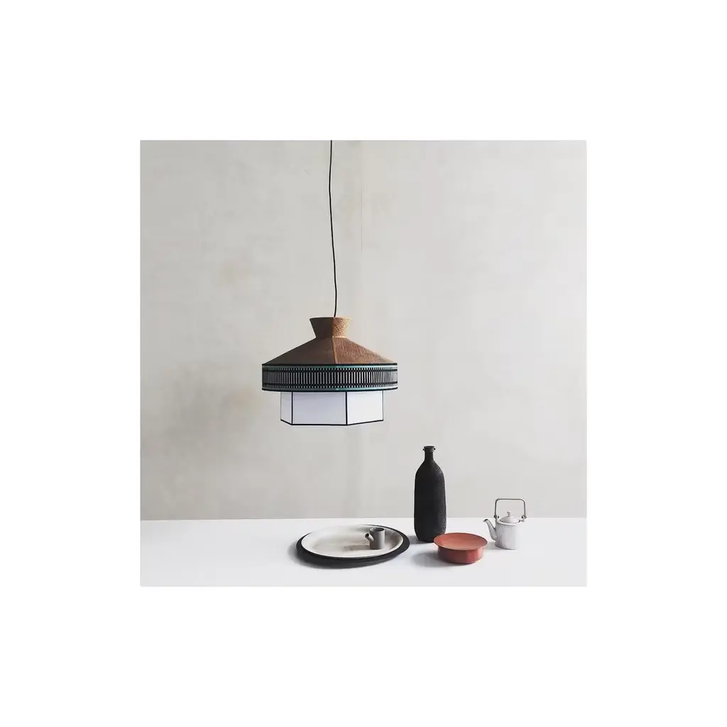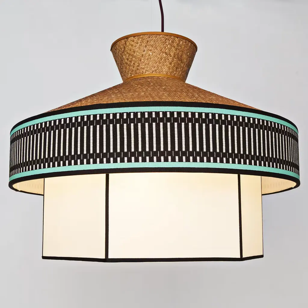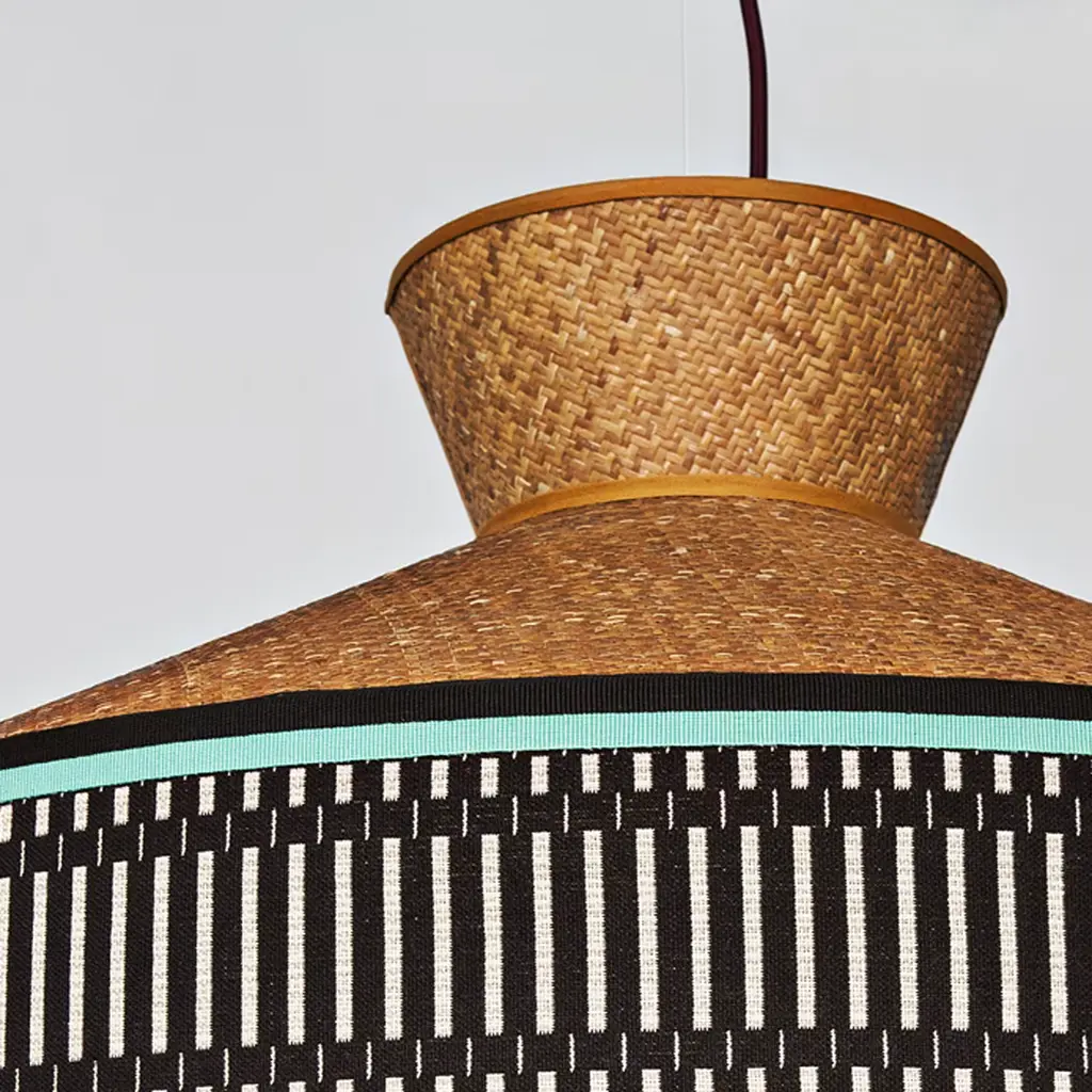 This chandelier has a structure crafted in rattan combined with the added component of a fabric featuring a geometric pattern on it. Its shape is similar to an old house with a straw roof. This piece was meant to give the feel of a lantern in a garden and was also inspired by Milanese restaurants of the 50s.