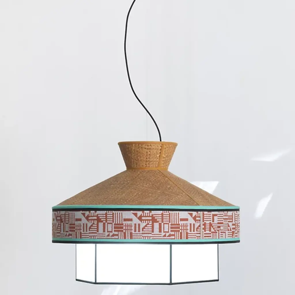The Giardino Pendant from Servomuto is made in Italy, celebrating the eclectic style of the 1950s, a time when design was truly flourishing. The Giardino Pendant is inspired by the Far East and the culture of outdoor living, which is reflected in the materials used in its construction. Rattan adds a natural and organic element to the design, while Jacquard fabrics, which are typically associated with more formal and luxurious textiles, are used to create a subtle yet intricate pattern on the pendant's surface. The contrasting finishes on the white parchment diffuser further add to the visual appeal of this piece.
