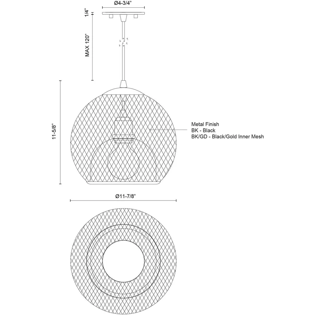 Single lamp pendant with spherical powder-coated wire mesh shade. Color configurations include uniform black or an exterior black mesh with inner gold mesh. Suspended by matching cable. Available in 2 sizes.
