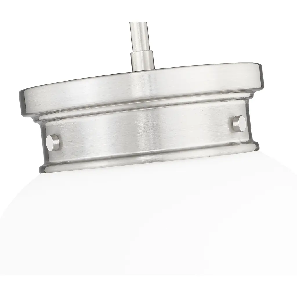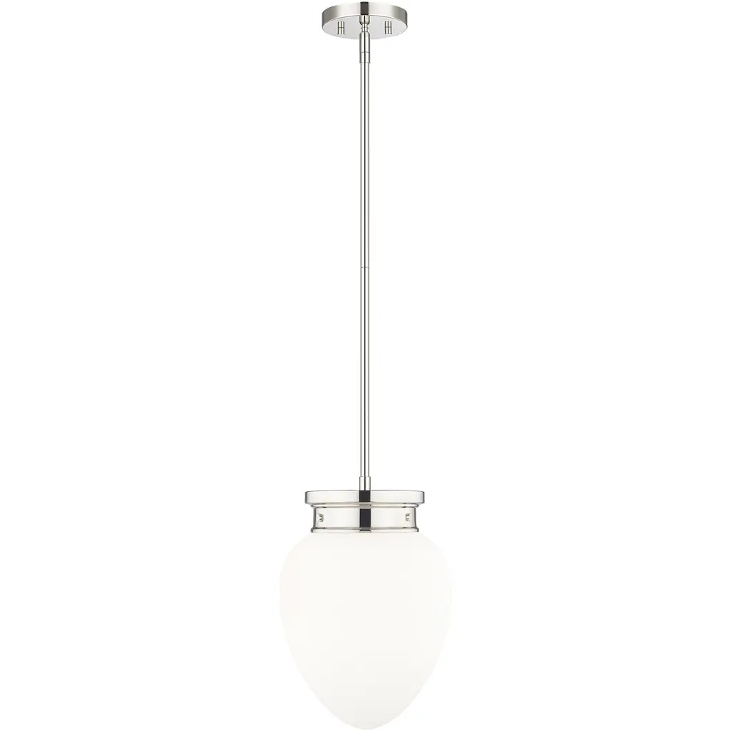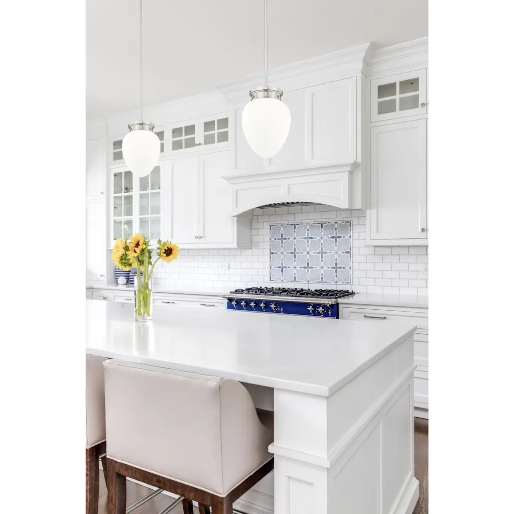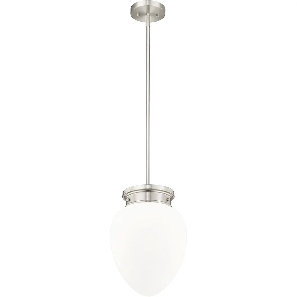 A chic silhouette is crafted with schoolhouse inspirations to bring vintage charm to a modern one-light pendant. Its timeless brushed nickel finish complements in your kitchen or dining room, with the versatility to blend beautifully in a bedroom or den. Its teardrop-style shade is crafted from matte, etched opal glass to deliver soft, diffused illumination in any setting.