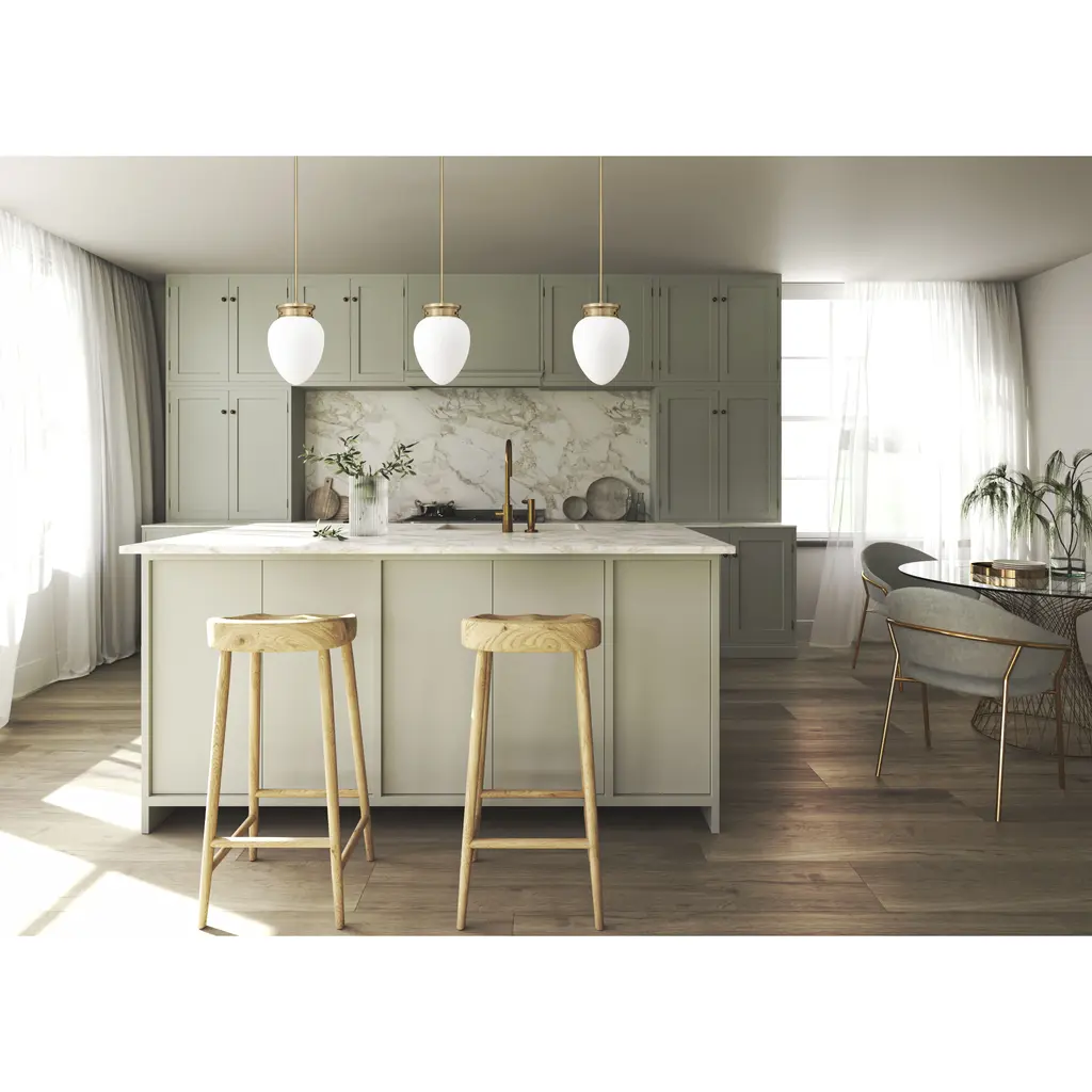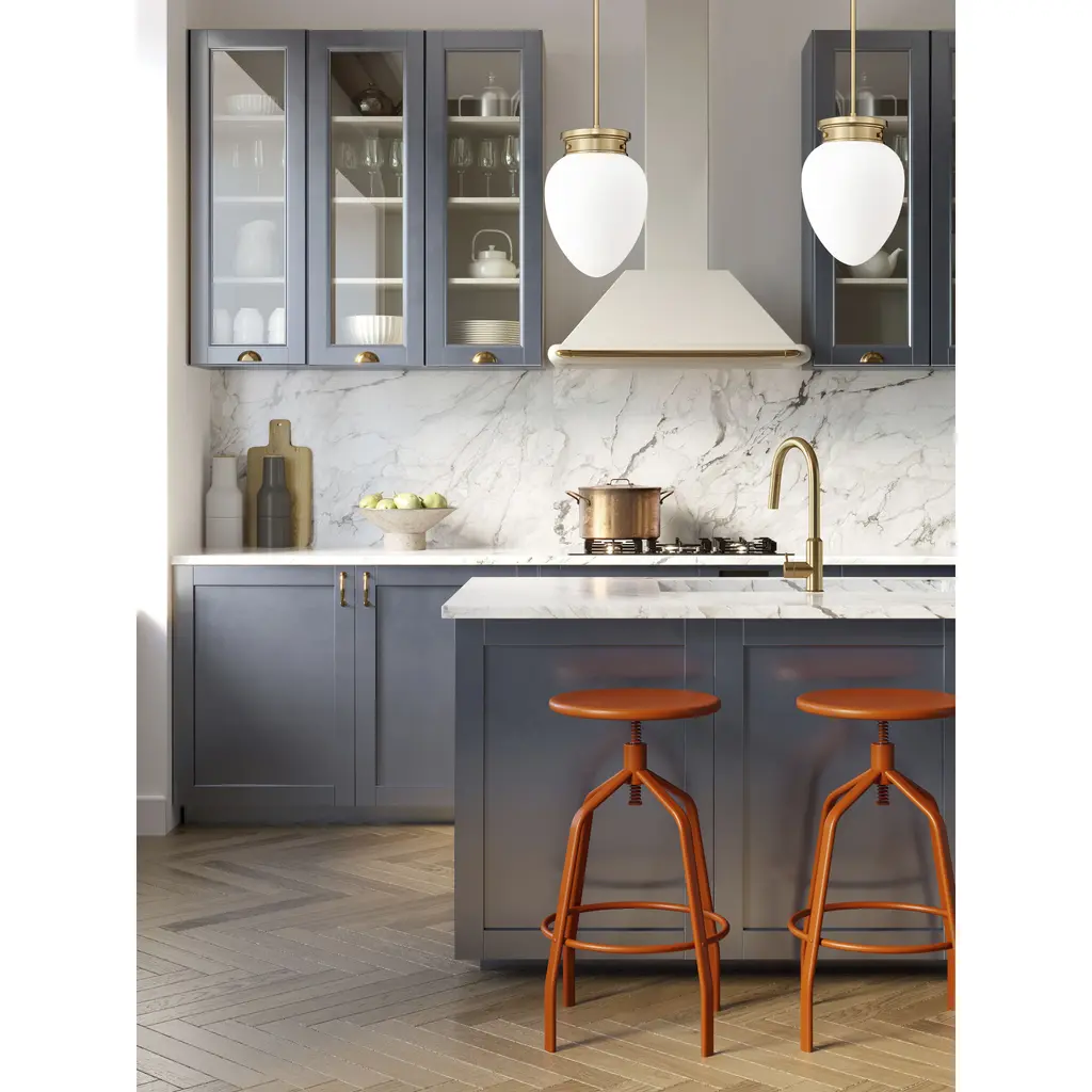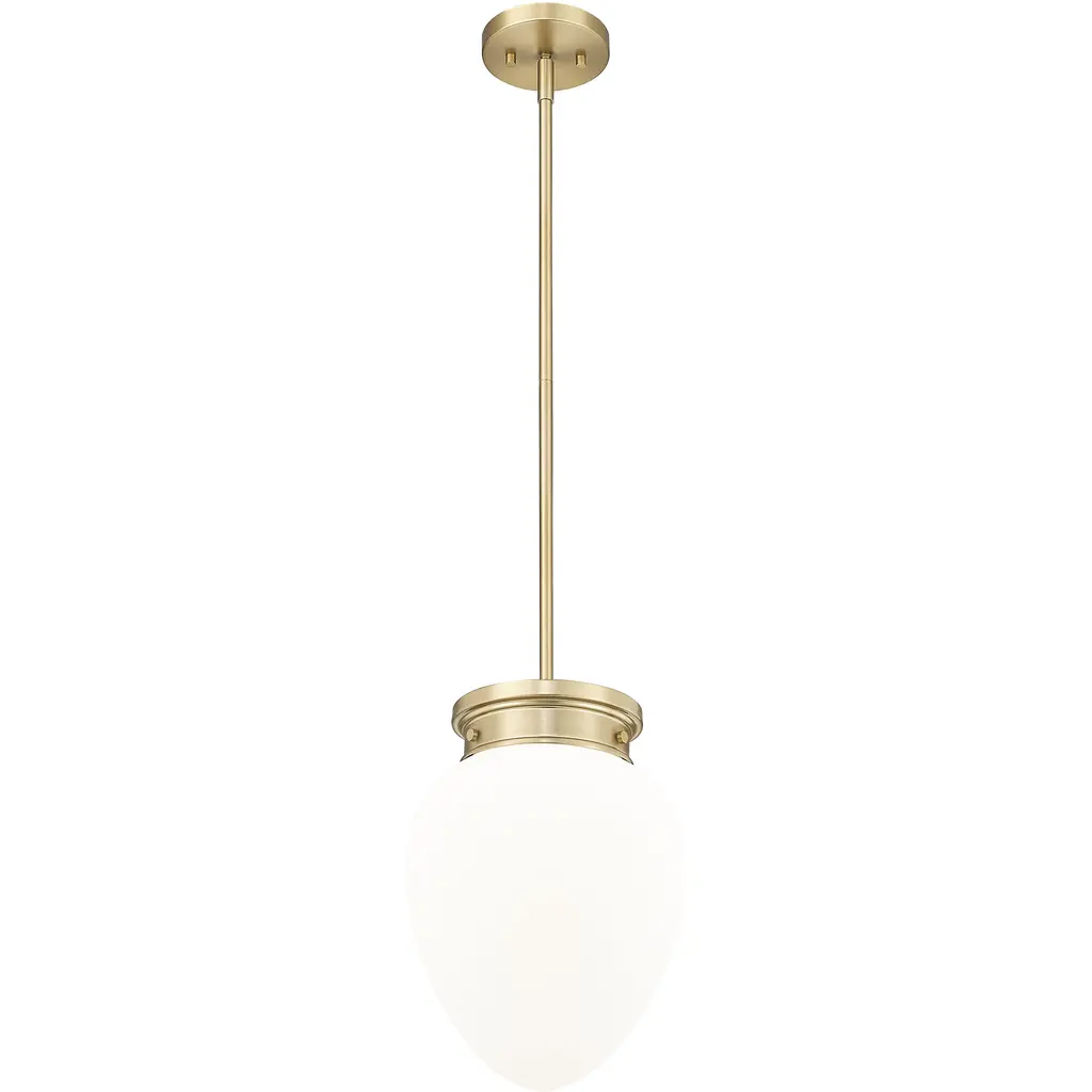 A chic silhouette is crafted with schoolhouse inspirations to bring vintage charm to a modern one-light pendant. Its modern gold finish complements in your kitchen or dining room, with the versatility to blend beautifully in a bedroom or den. Its teardrop-style shade is crafted from matte, etched opal glass to deliver soft, diffused illumination in any setting.