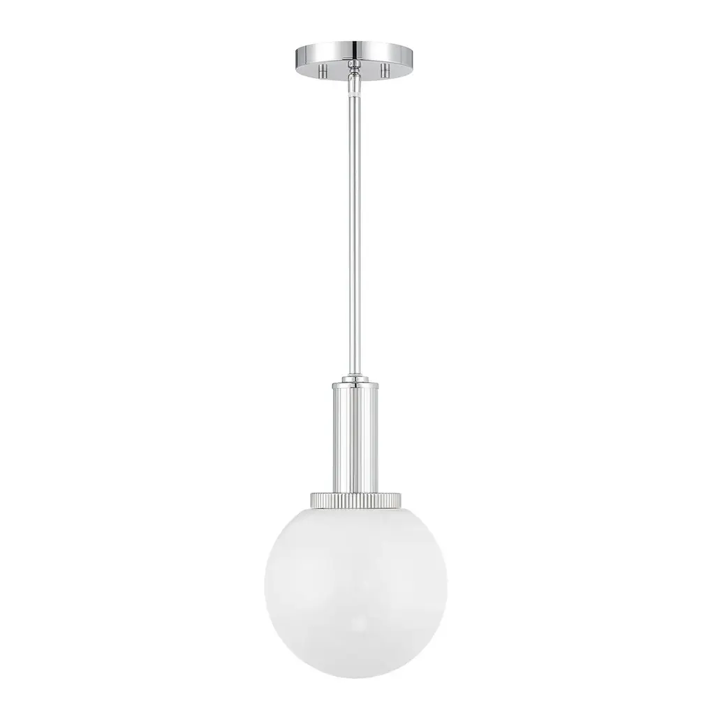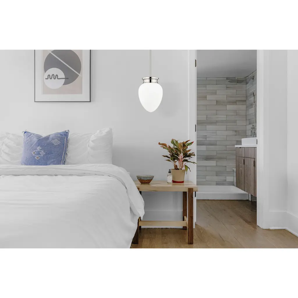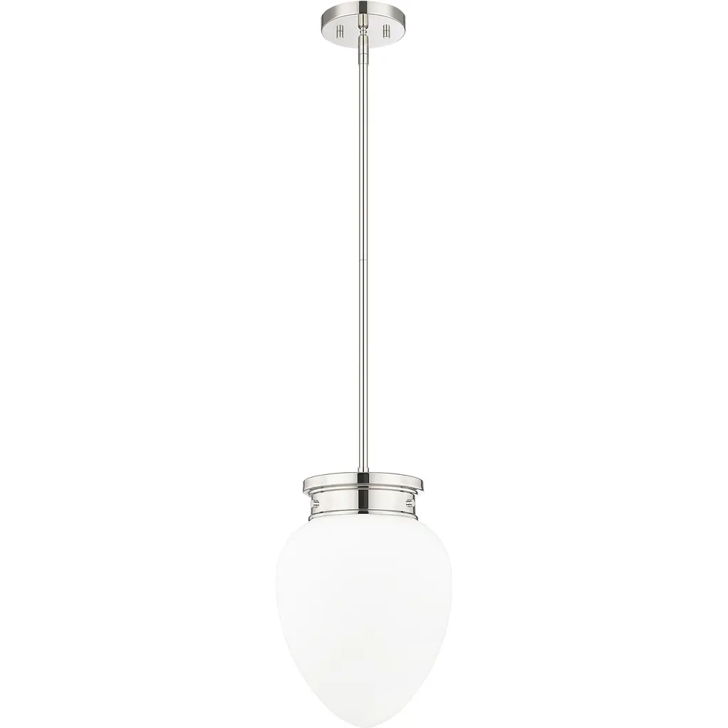 A chic silhouette is crafted with schoolhouse inspirations to bring vintage charm to a modern one-light pendant. Its timeless polished nickel finish complements in your kitchen or dining room, with the versatility to blend beautifully in a bedroom or den. Its teardrop-style shade is crafted from matte, etched opal glass to deliver soft, diffused illumination in any setting.