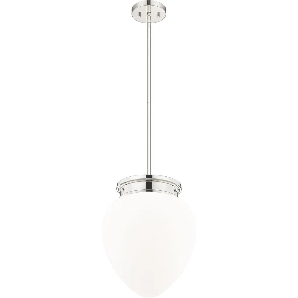 Schoolhouse inspired glass and a chic silhouette highlight a modern one-light pendant. Its timeless polished nickel finish complements in your kitchen or dining room, with the versatility to blend beautifully in a bedroom or den. Its teardrop-style shade is crafted from matte, etched opal glass to deliver soft, diffused illumination in any setting.
