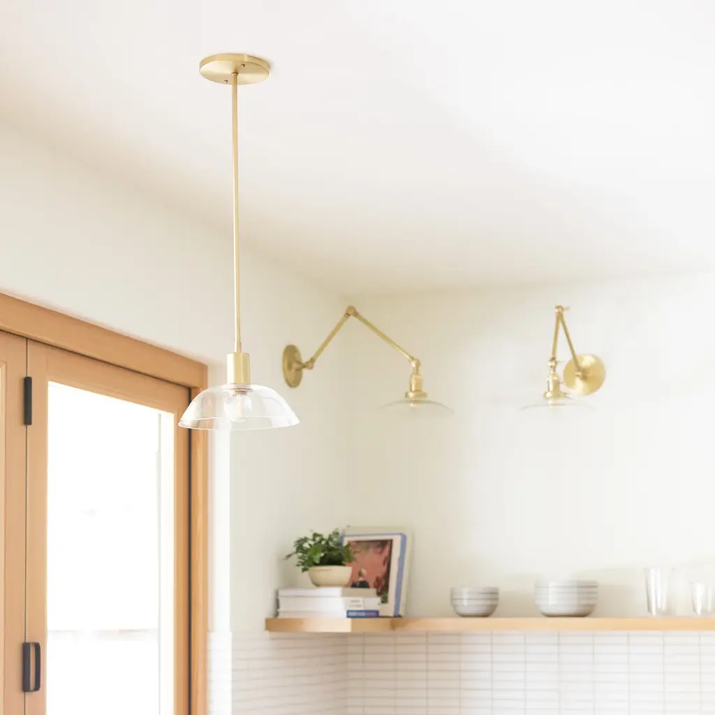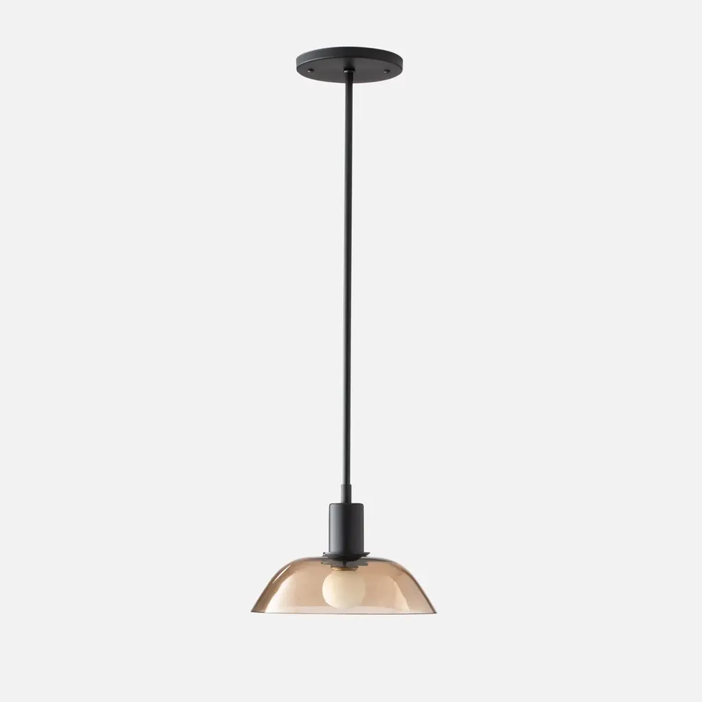A fresh take on a mid-century style, the Gillespie Pendant delivers a modern yet opulent feel while casting a radiant glow. This pendant light is a superb choice as a stand-alone statement fixture in a small dining nook, or install multiple fixtures close together to establish an inviting warmth over a bar or dining table. This unique light source incorporates a custom 8” clear or bronze glass shade with a ⅜” pendant rod and is available in eight different length options. A Schoolhouse Original.