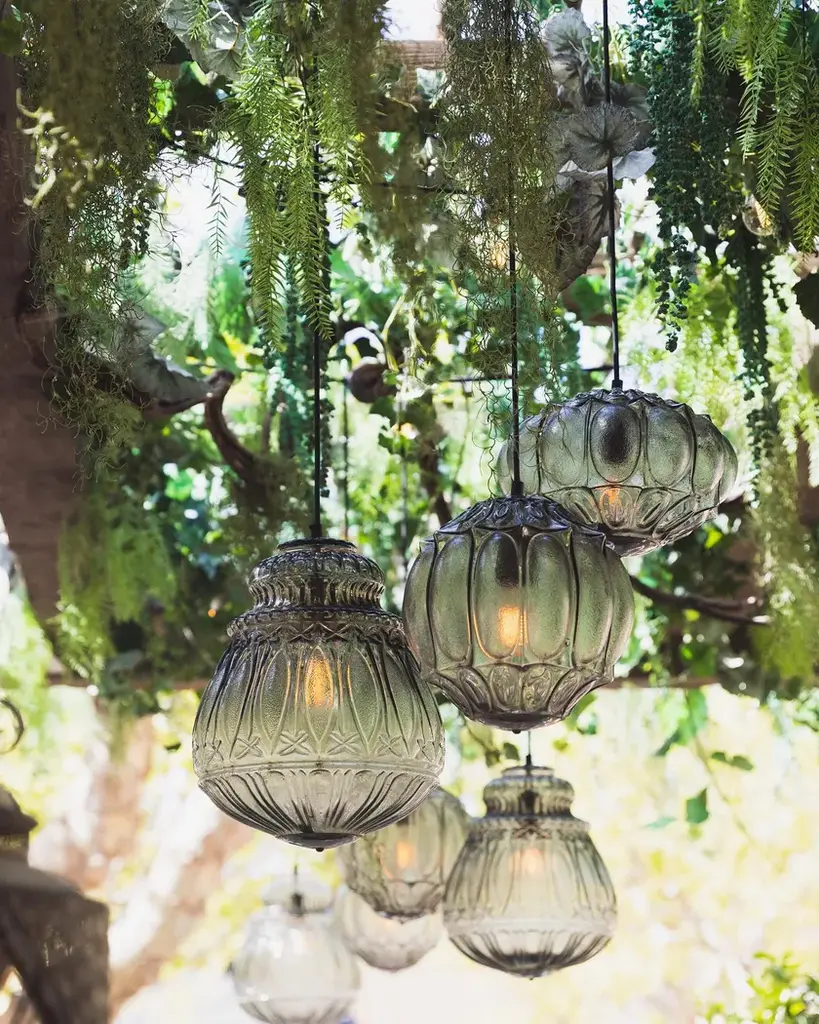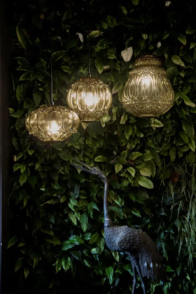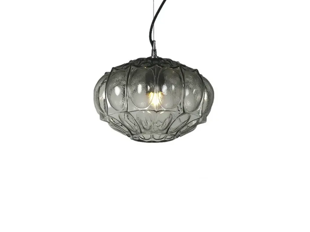 Looking around an old warehouse, three different moulds of the Ginger suspension lamps have been found by the designer.Three round structures, with a vintage charm, in pale yellow or smoked clear glass in triple layer, through which light spreads from vitreous decorations.