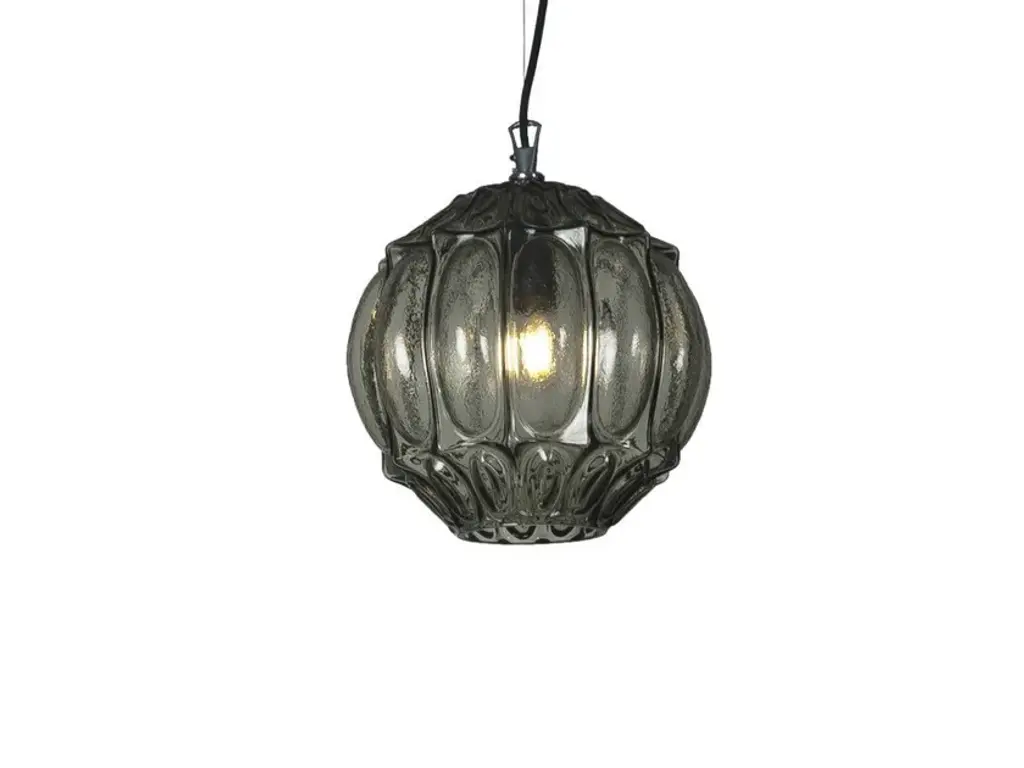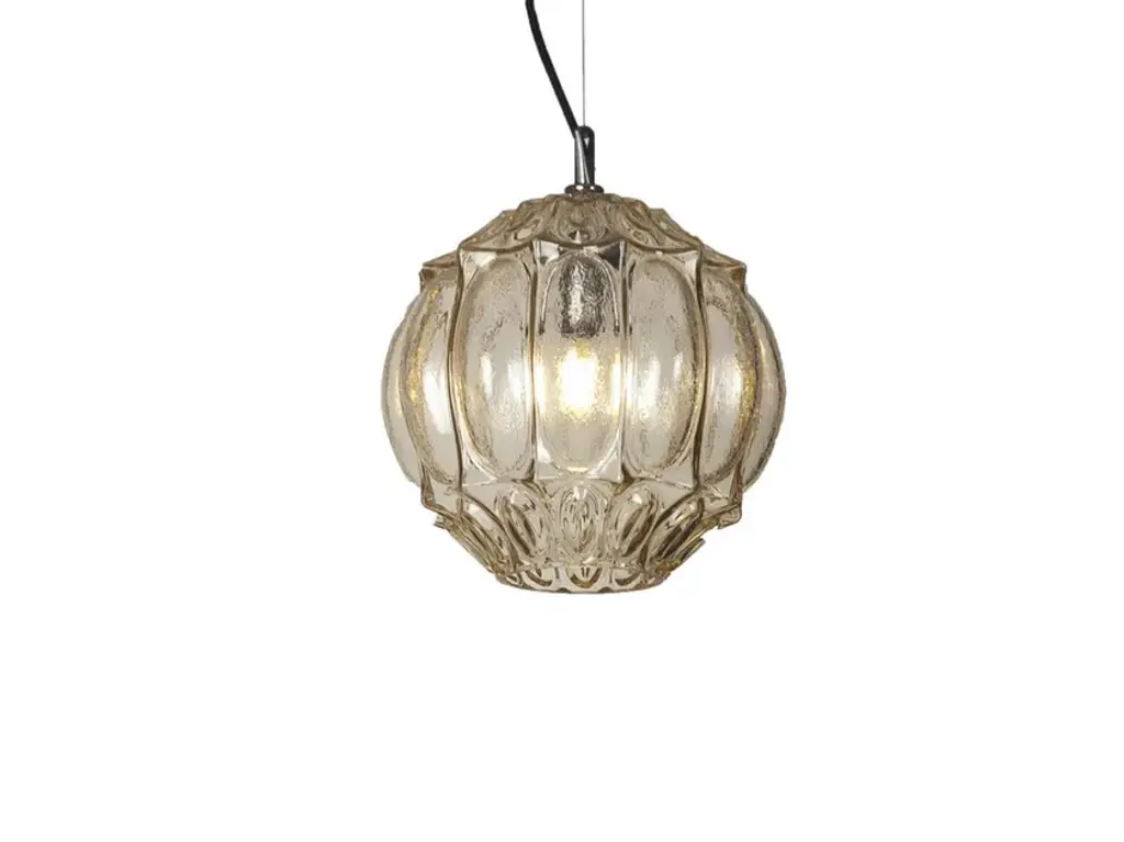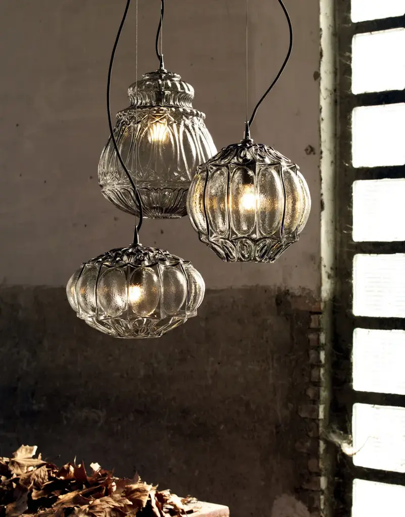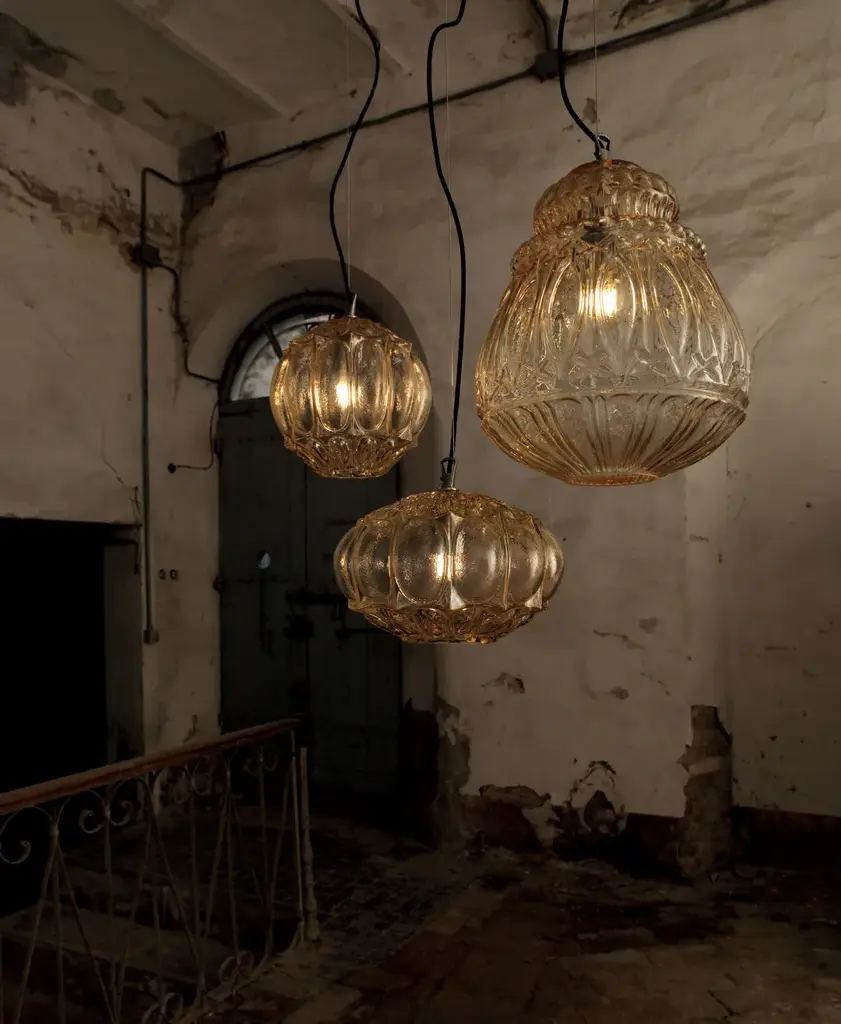 Looking around an old warehouse, three different moulds of the Ginger suspension lamps have been found by the designer.Three round structures, with a vintage charm, in pale yellow or smoked clear glass in triple layer, through which light spreads from vitreous decorations.