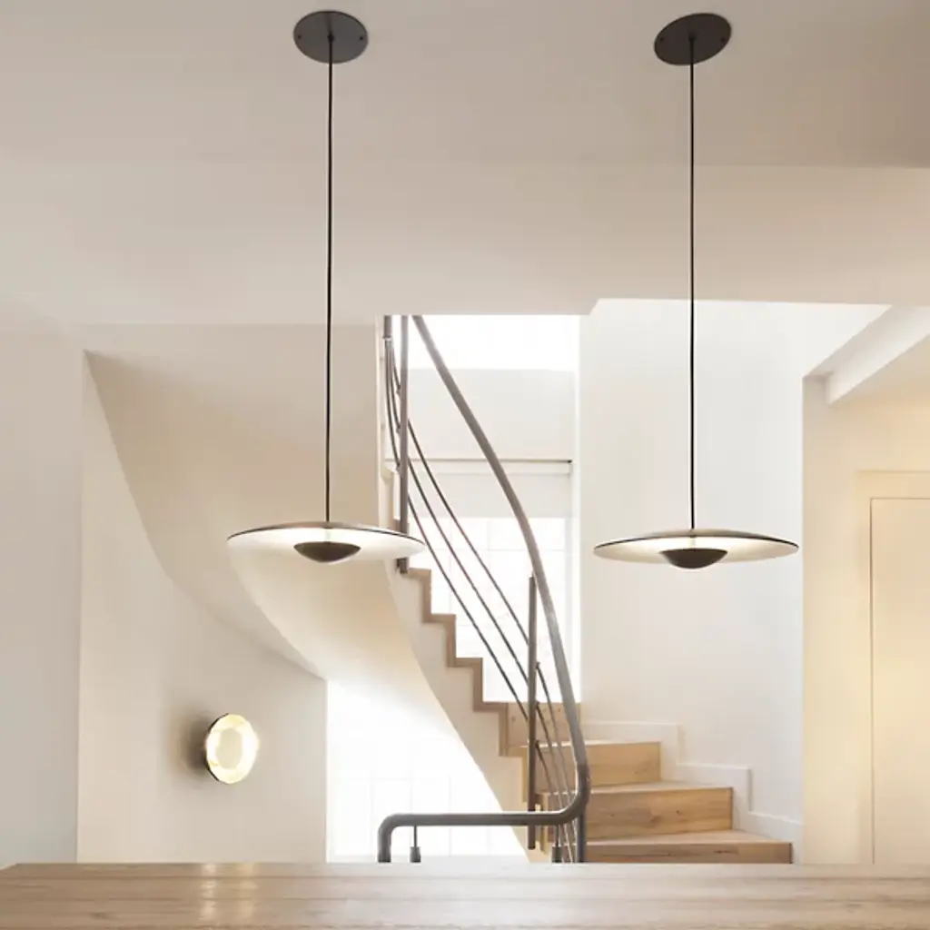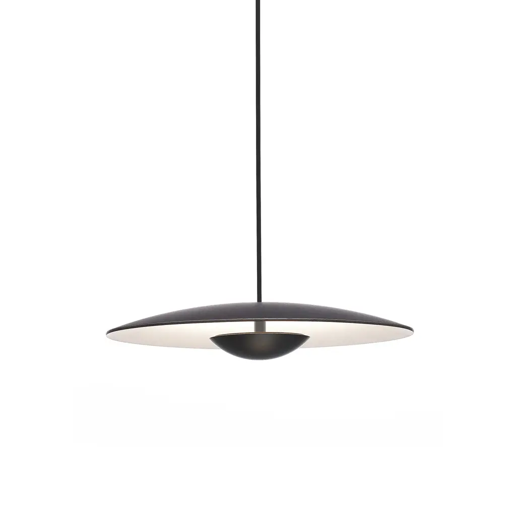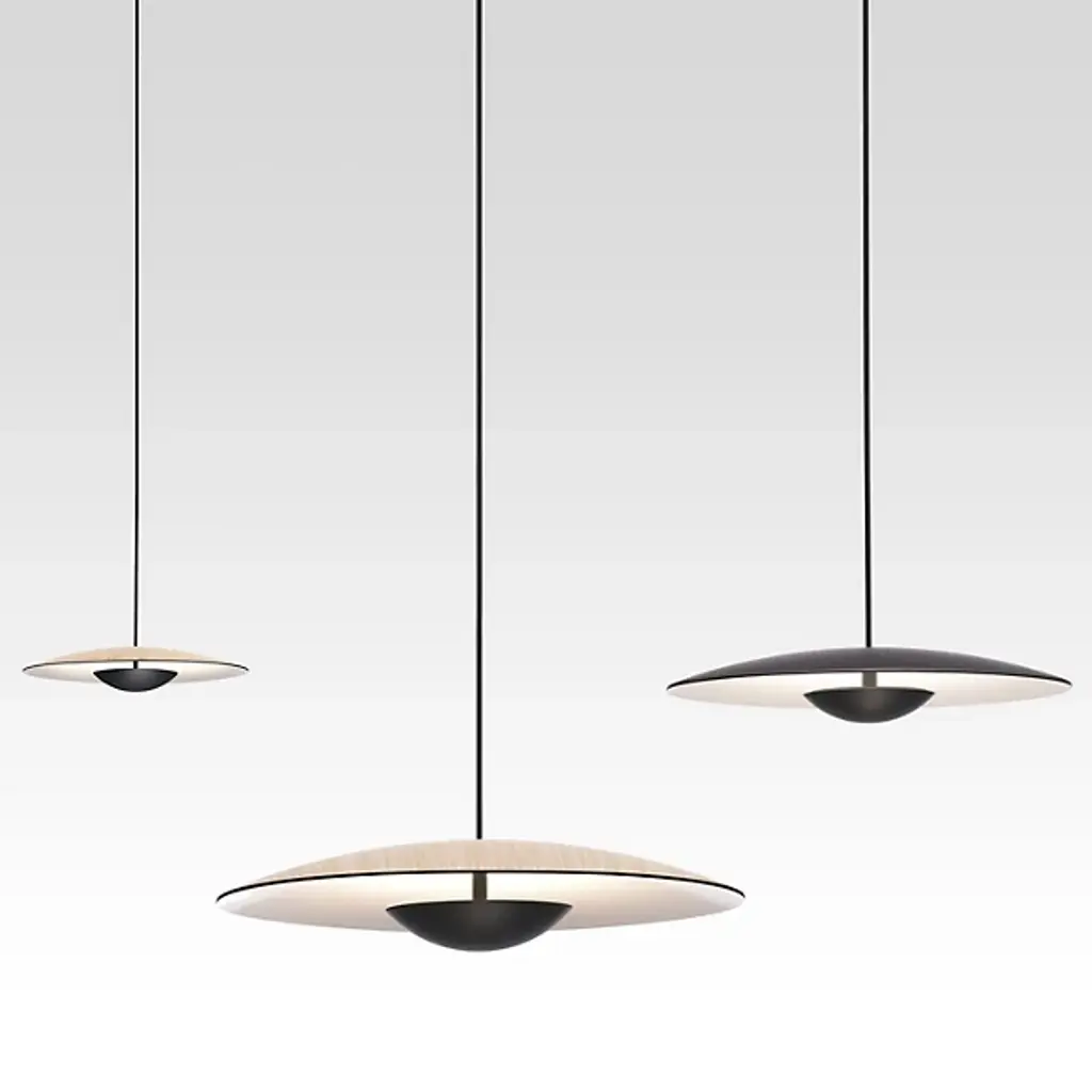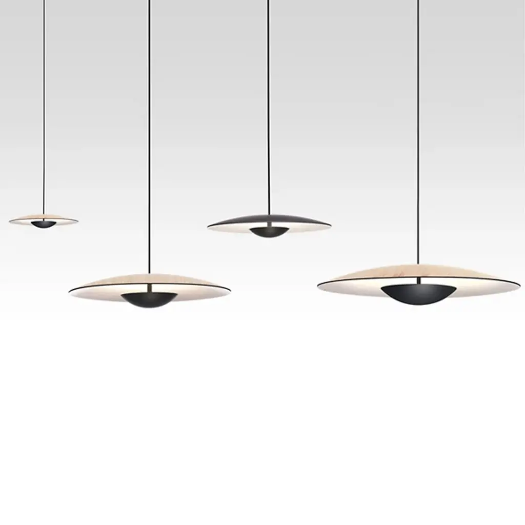 Inspired by the cymbals of famous drummer, Ginger Baker, the Marset Ginger LED Pendant is an exceptionally thin and smooth conductor of light. The high pressure shaping of high-quality wood and paper results in an ultra-thin shade with a white interior, brilliantly amplifying the LED light outward. The aluminum structure holds the warm LED module which is outfitted with special optics to open up the light beam. In an effort to dissipate the LED light temperature, designer Joan Gaspar decided to thicken the aluminum instead of carving out grooves in the metal holder.