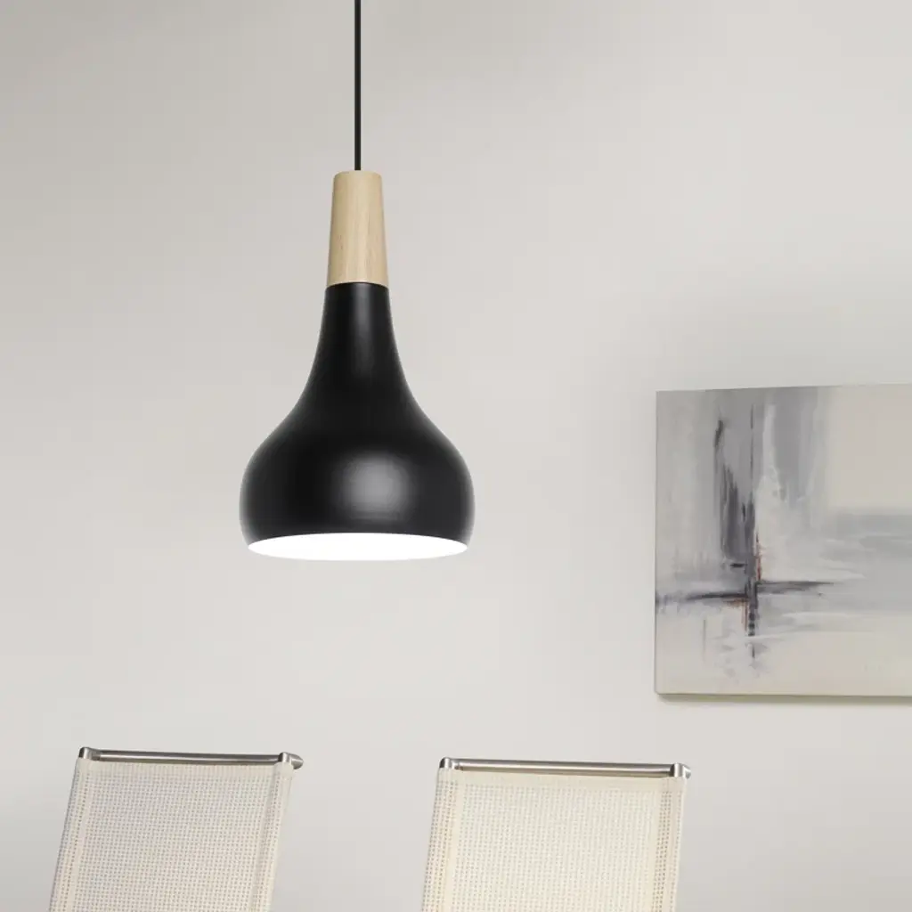 A wooden accent warms up this dimmable pendant light’s sleek teardrop silhouette, for a look inspired by modern Scandi design. Built from steel, it contrasts its black outer finish with a shiny white interior. An adjustable hanging height + sloped-ceiling compatible canopy offer placement options.