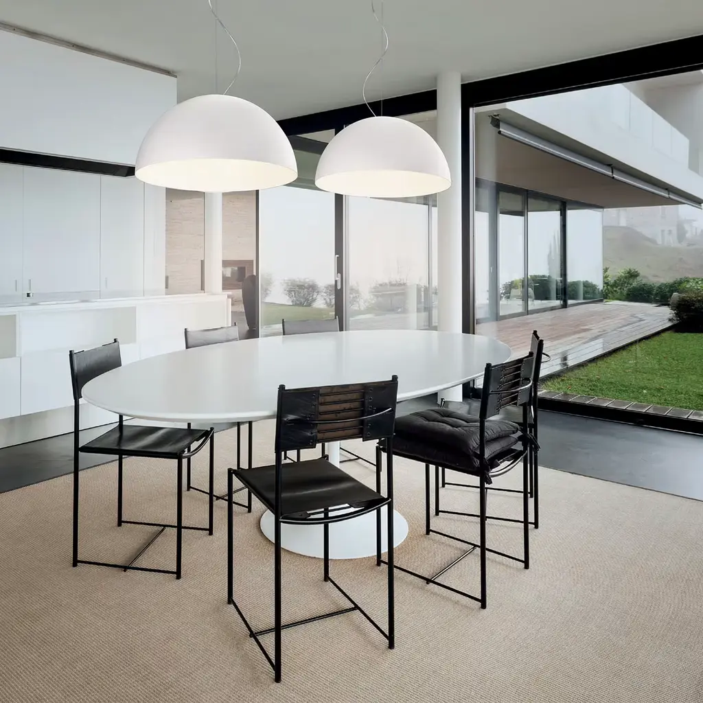 Large suspension lamp providing direct light with turned aluminum structure and lamp holder with E27 fitting. The half-sphere shape and the use of different E27 sources guarantee pleasant ambient light effects. Also available in a black-in-white and black-in-gold leaf finish.