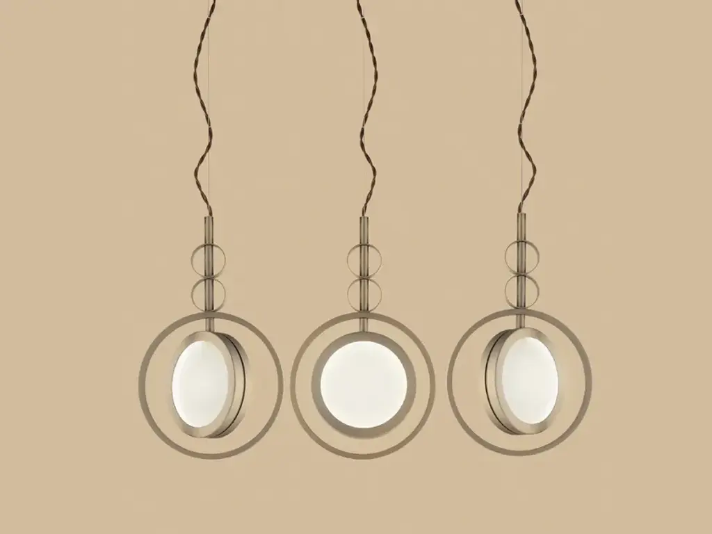 Txxnty Brand Design opens a remarkable window on the future which, thanks to Euroluce's decades of experience and without sacrificing prestigious know-how, looks to new style horizons. The Txxnty Brand Design collections aim to relate objects and energy to people. The reflection on light and on the relationship with materials and shape focuses on the proposition of geometries, colours and effects, creating a "serious" interaction between imagination and reality. Attention to detail is entrusted, as always, to the knowledge and expertise of skilled craftsmen. Finish | RAL champagne gold color, opaque tin brown. Other finishes on request.Color | disks in satin transparent color or satin brown color. Other colors on request.Details | metal structures are produced handmade on our drawing. Glass disks made in Venice