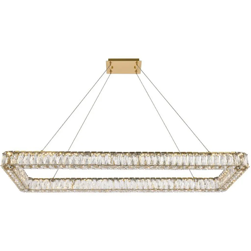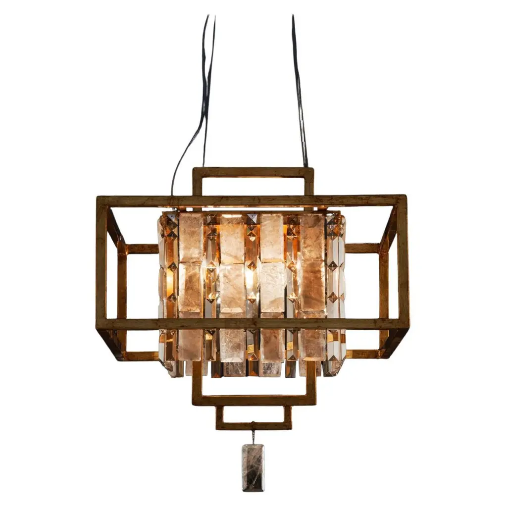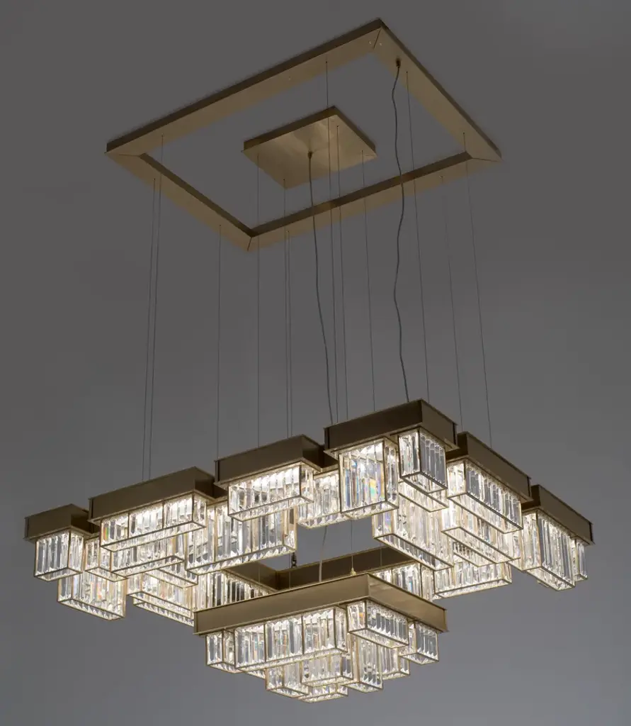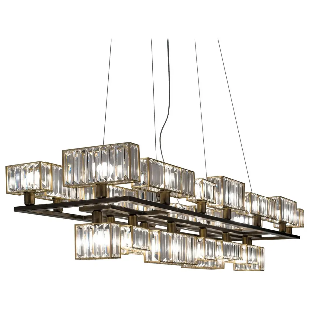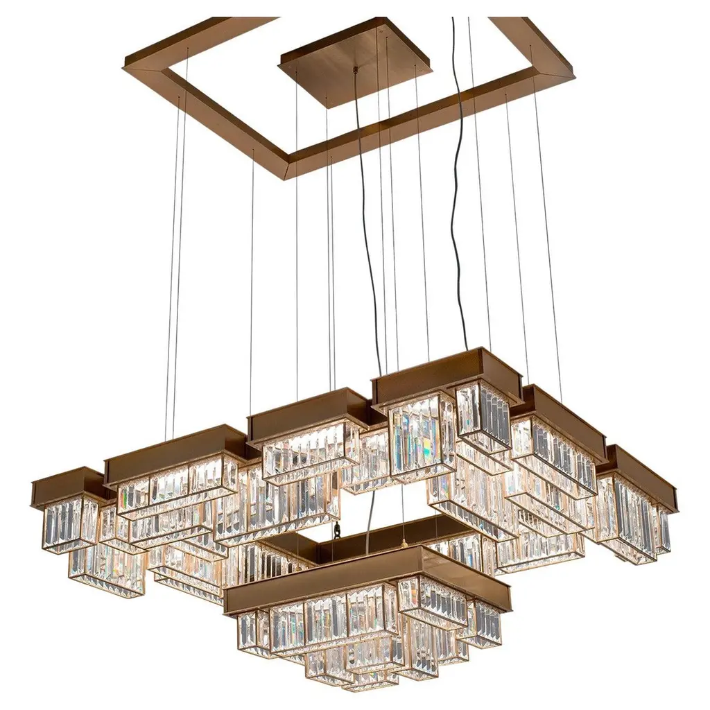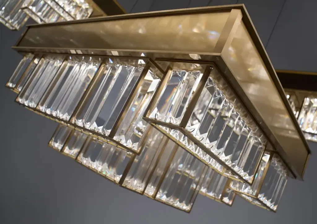 Gisele EX02 is a led pendant lamp, satin brass finish and clear cutted crystals.dimmer wifi includedLed stick 24VDC - 300W supplied28.800 lumenwarm white coloured - 3000°KGisele dances. Gisele doesn't improvises her moves, she studies them, repeats them, perfects them. Even though this is the most linear lamp of the whole collection, this is the one that best exemplifies a classic opulence with a style clearly inspired by art dèco. Crystals and a chrome plating are combined together, to give emphasis to a geometrical and complex system, composed of modular elements; parallelepipeds of different heights and dimensions, made of transparent crystals lozenges, hand-assembled over metallic frames. The main feature of the collection is, indeed, beside the preciousness of its components, the ease to create new shapes and dimensions due to the repetition of the module. Generally thought for a longitudinal development, Gisele offers multiple declinations, like a choreography of bodies in space. Always changing and always intense. An innovative design, despite the appearances, which combines new technology with aesthetic reasons: the entire structure is indeed created in steel with a laser-cut and the lights are dimmable leds. The ceiling attachment itself is organized with steel cables, to allow for customizable heights.