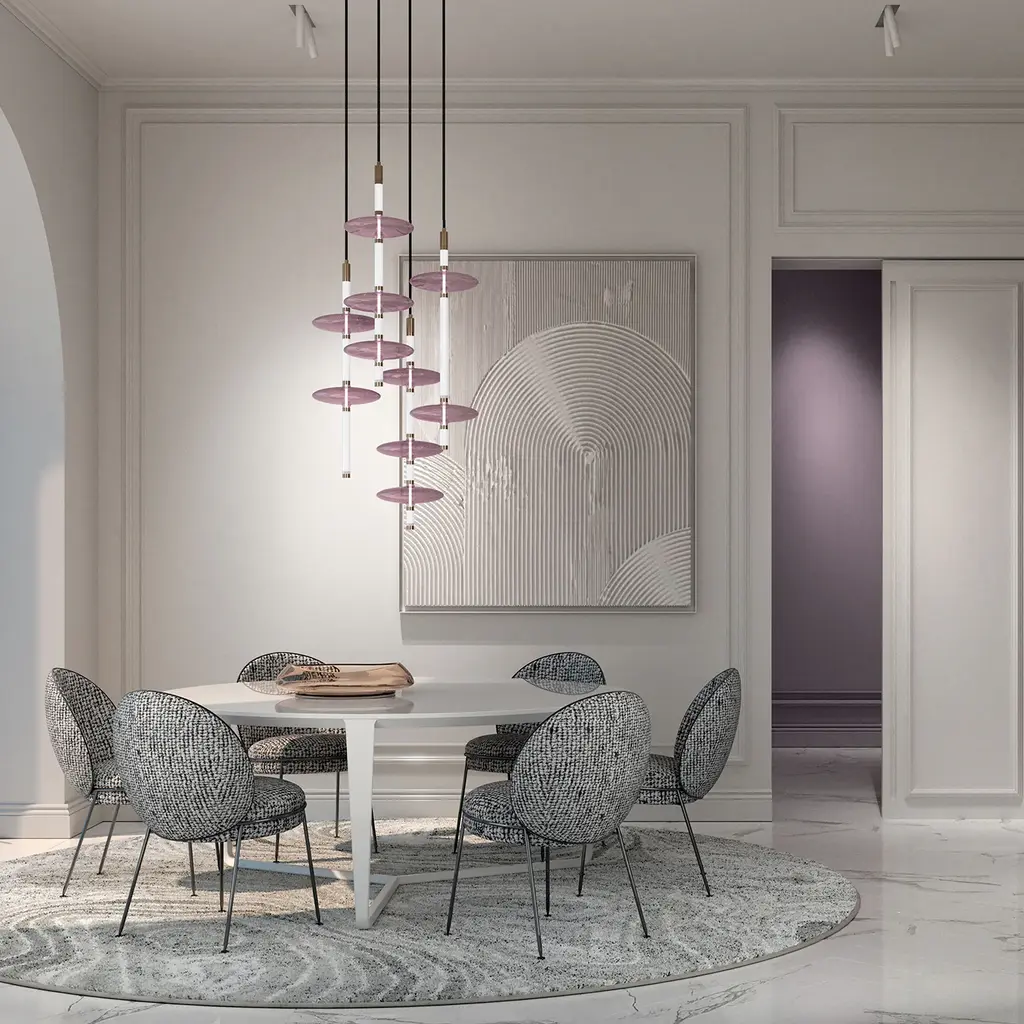 This LED pendant lamp features alternating transparent and pink glass light fixtures, complemented by decorative metal elements in a polished champagne finish. The black fabric cord and ceiling mounting rose, also in polished champagne metal, add a refined touch. The standard cable length is 2.5 meters.