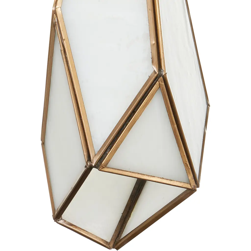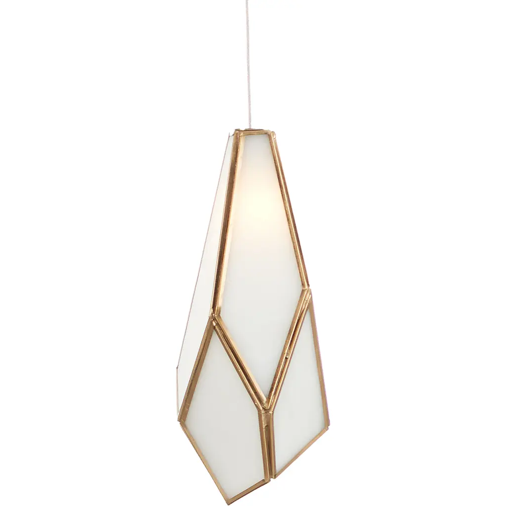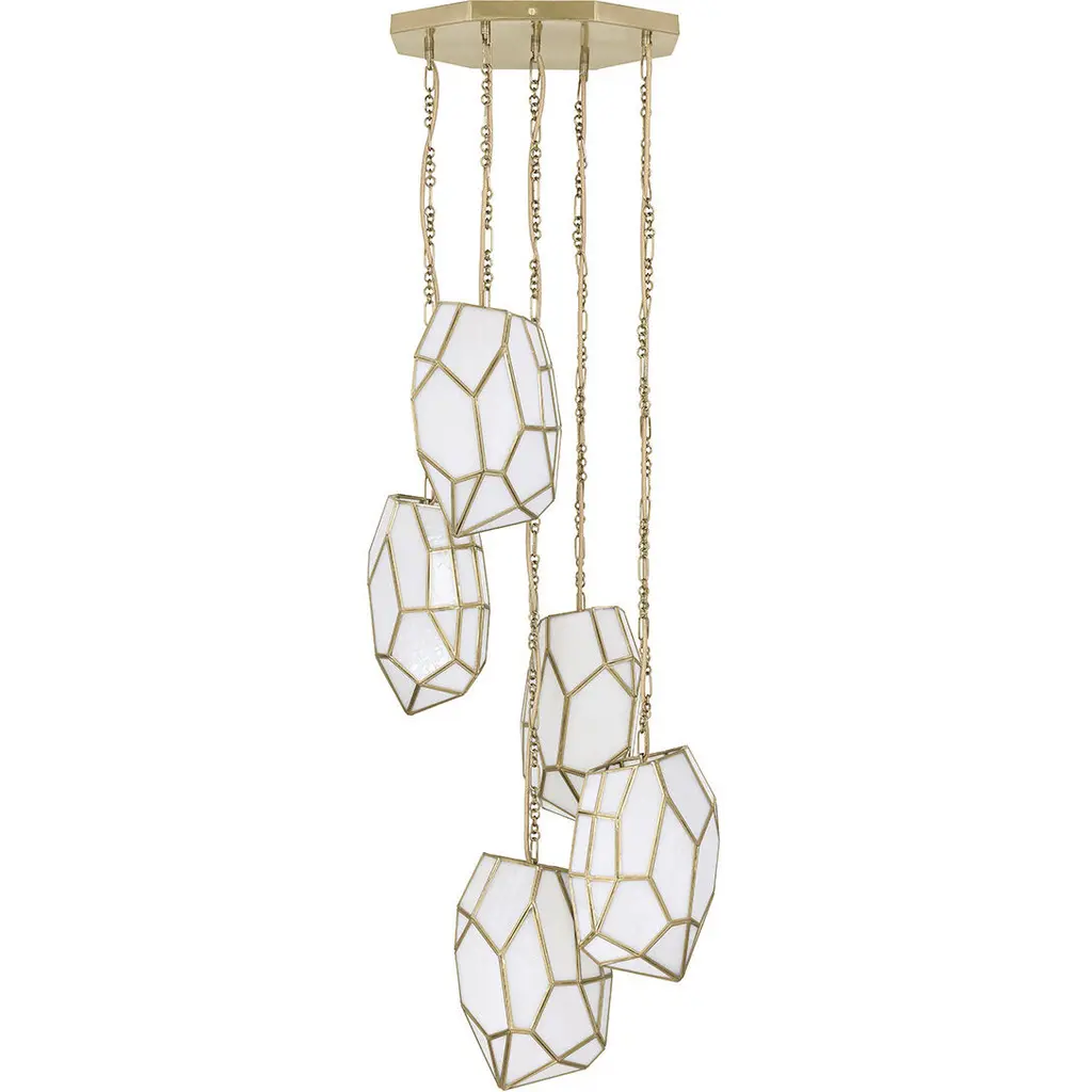 The faceted shades of the Glace White Round 7-Light Multi-Drop Pendant are made of panes of white art glass joined with seams of metal in an antique brass finish. The organic shape of the shades and the fact they hang at differing heights enhance the personality of this white pendant, which will ornament a space like a piece of jewelry. Art glass is one of the most artisanal materials that can be used, as its swirling opaque surface creates a milky glow whether lights are switched on or not. The canopies of the glass pendants in this collection are luminous in a painted silver finish.