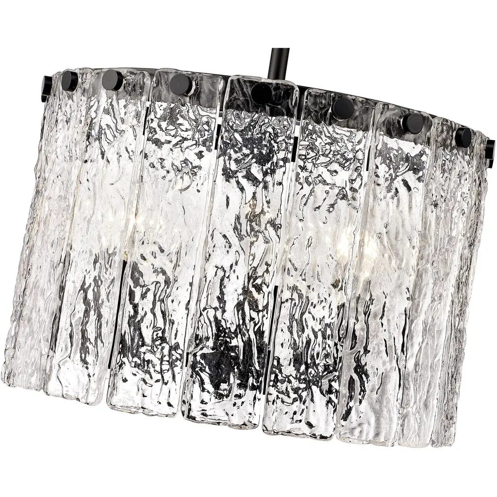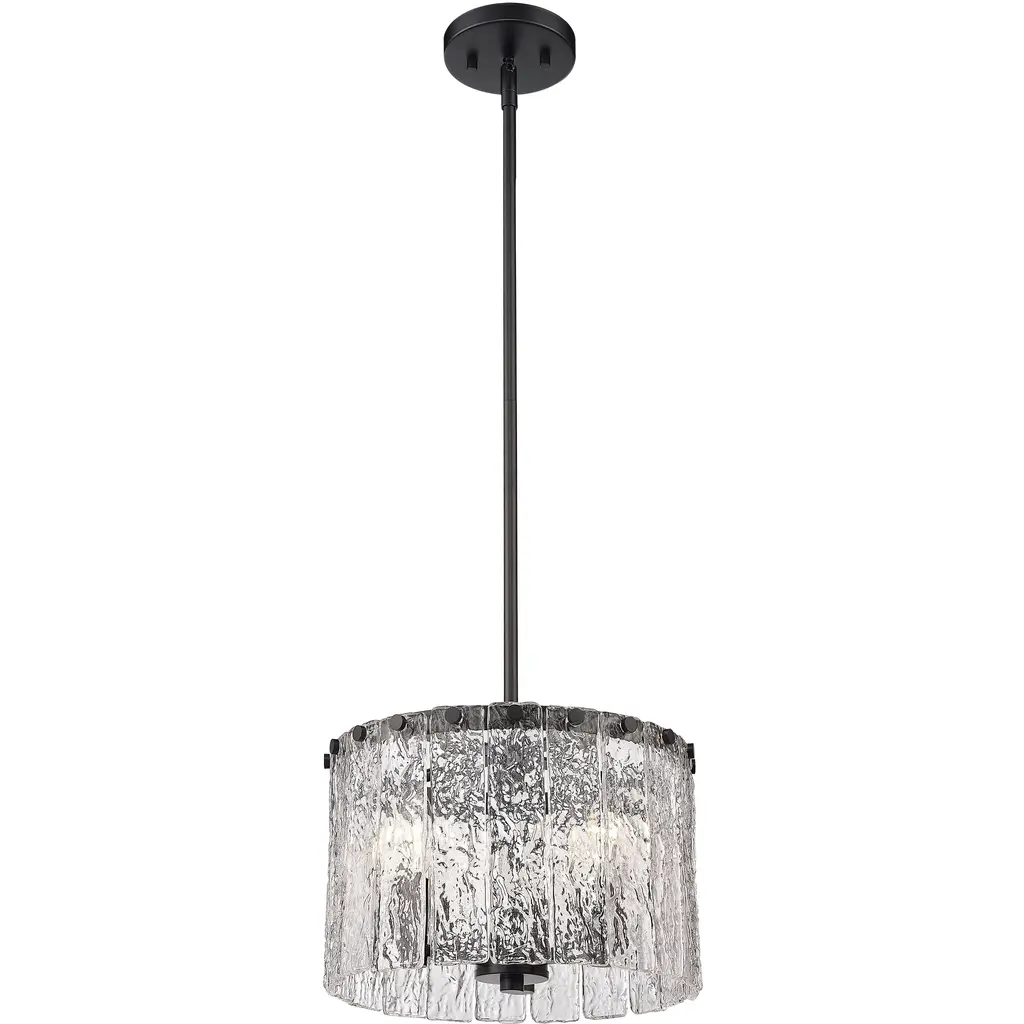 Embellish a custom living space with the industrial version of modern glam, choosing this striking fixture as a reference point and source of glowing illumination. The Glacier three-light pendant delivers a lush aesthetic with individual clear textured glass panels that emulate melting ice, a chic design with dramatic impact. Bold matte black finish steel is placed as a crown fraB208B217me, providing tantalizing contrast and enhancing the gallery feel of a foyer or main living space with both natural and industrial inspiration.