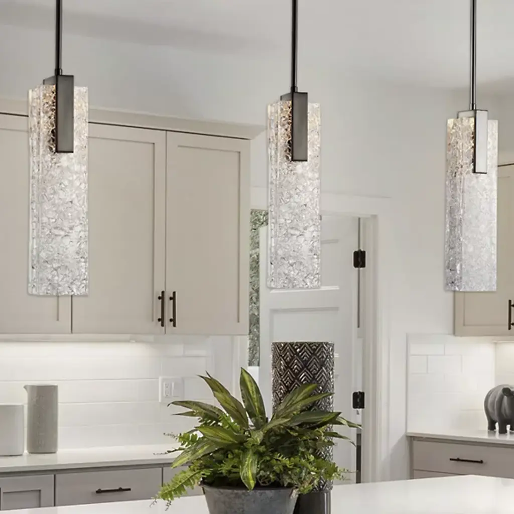 Crisp glass glazed in a seductive light. The handcrafted Glacier LED Pendant from Hammerton Studio drops into your room with an eye-catching warm and cool character. The pendant's slender suspension makes it ideal as a series over a table or a single in intimate space. A sleek metal accent emphasizes the pendant's refined modern aesthetic. The glass diffuser inside is made when artisans combine icy chunks of glass with a molten slurry. With no two being exactly alike, the glass diffuser stuns with texture and shimmering details. Turn it on and watch as light dances in warm reflections across the glass. The glass-filtered light gives the room a comforting ambiance.