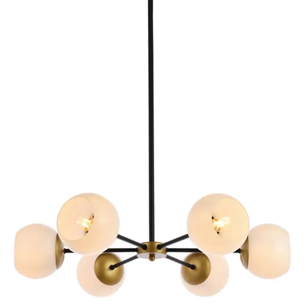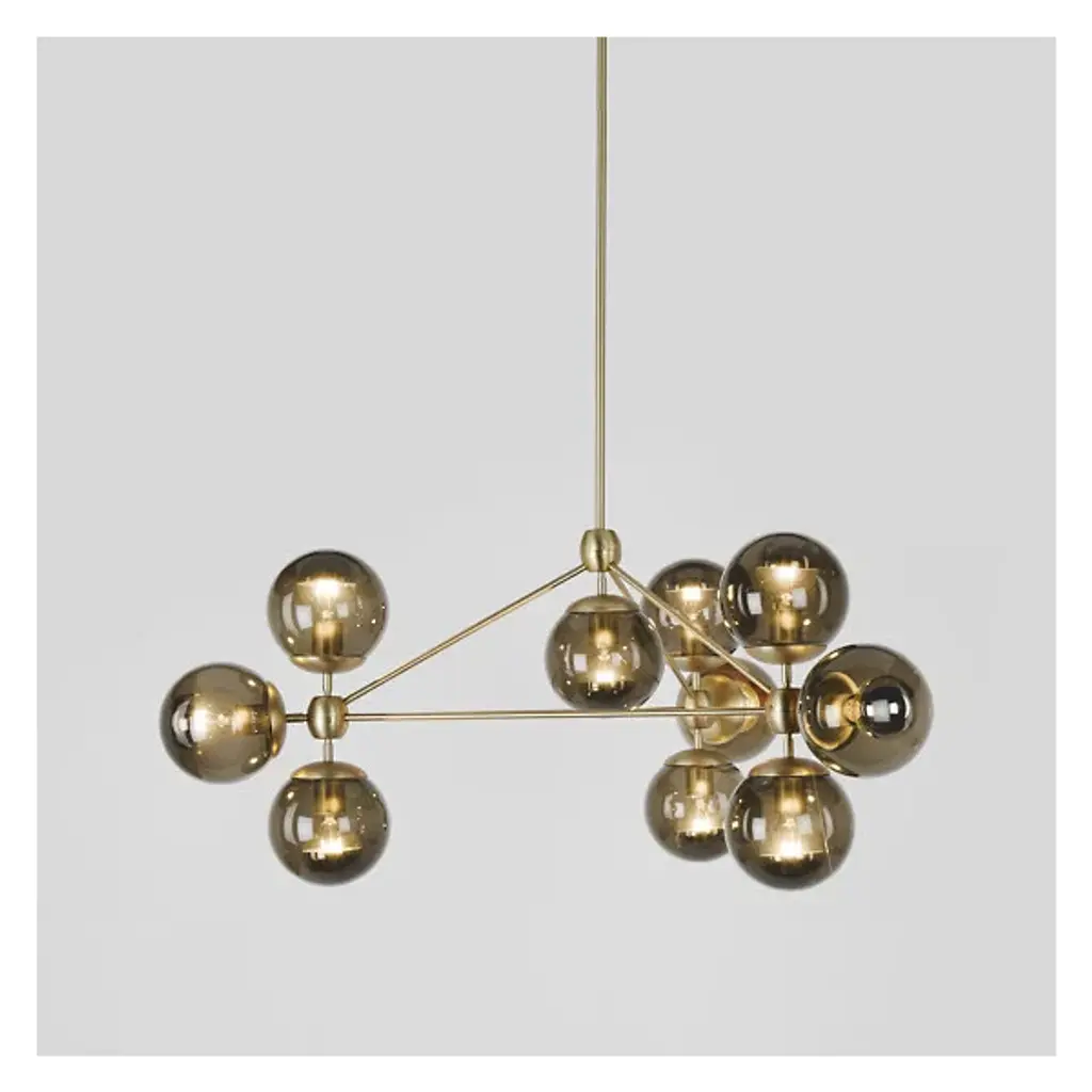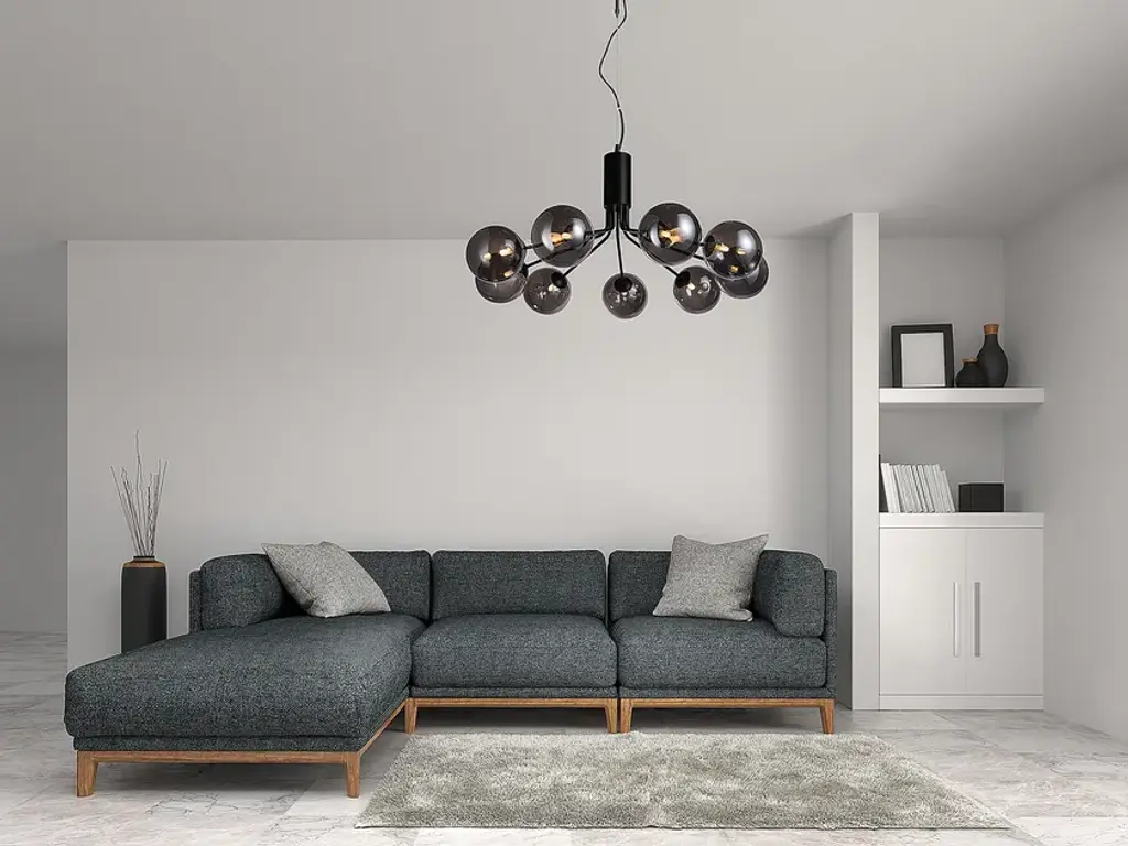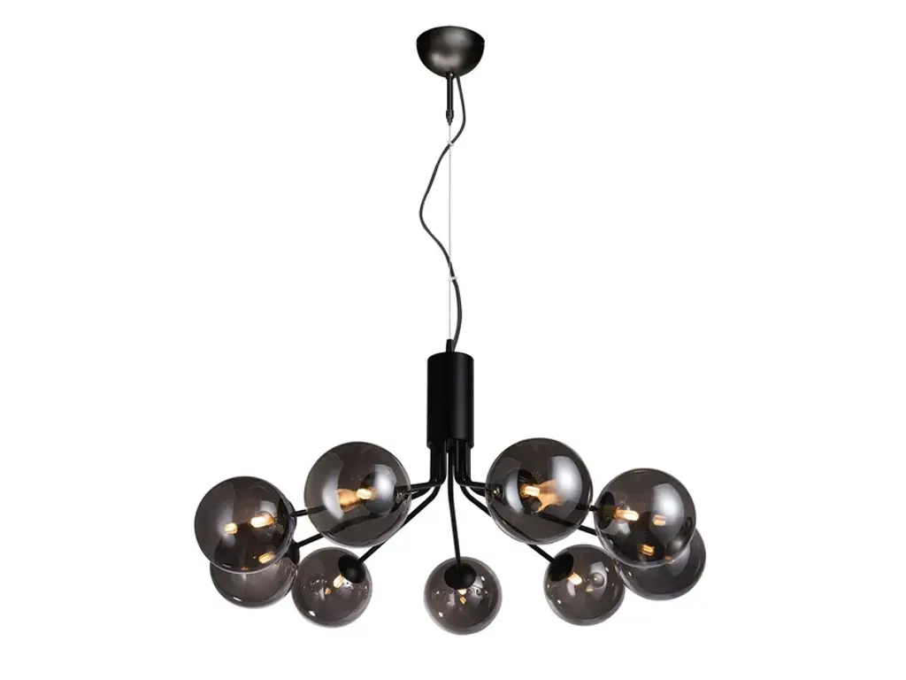 GLASGOW 9 is a metal LED pendant lamp with 9 glass spheres (champagne or dark grey) from the GLASGOW collection.9 x G9 LEDs, max. 5WThe Glasgow light family is distinguished by its captivating spherical glass shades encircling each bulb. The standout Glasgow 9 pendant boasts an impressive nine light points, creating a striking visual impact with its substantial diameter. For a lighter touch, explore the Glasgow 3, featuring three shades, or the Glasgow 5 Vertical, where shades gracefully spiral down the pendant's body. All three models are available in two sophisticated color combinations: brass/champagne and black/smoked glass. Extend your lighting options with the Glasgow product family, now featuring table, floor, and wall lamps to effortlessly fulfill all your lighting needs.