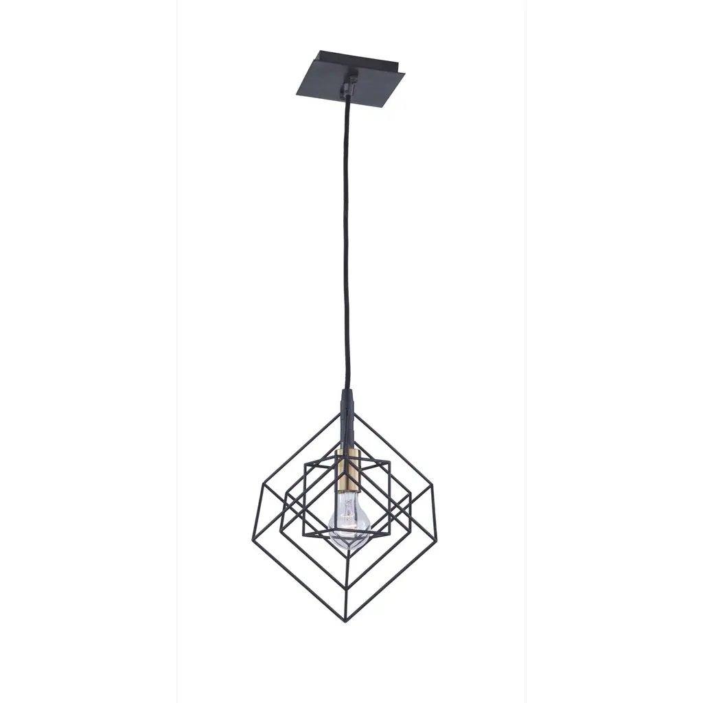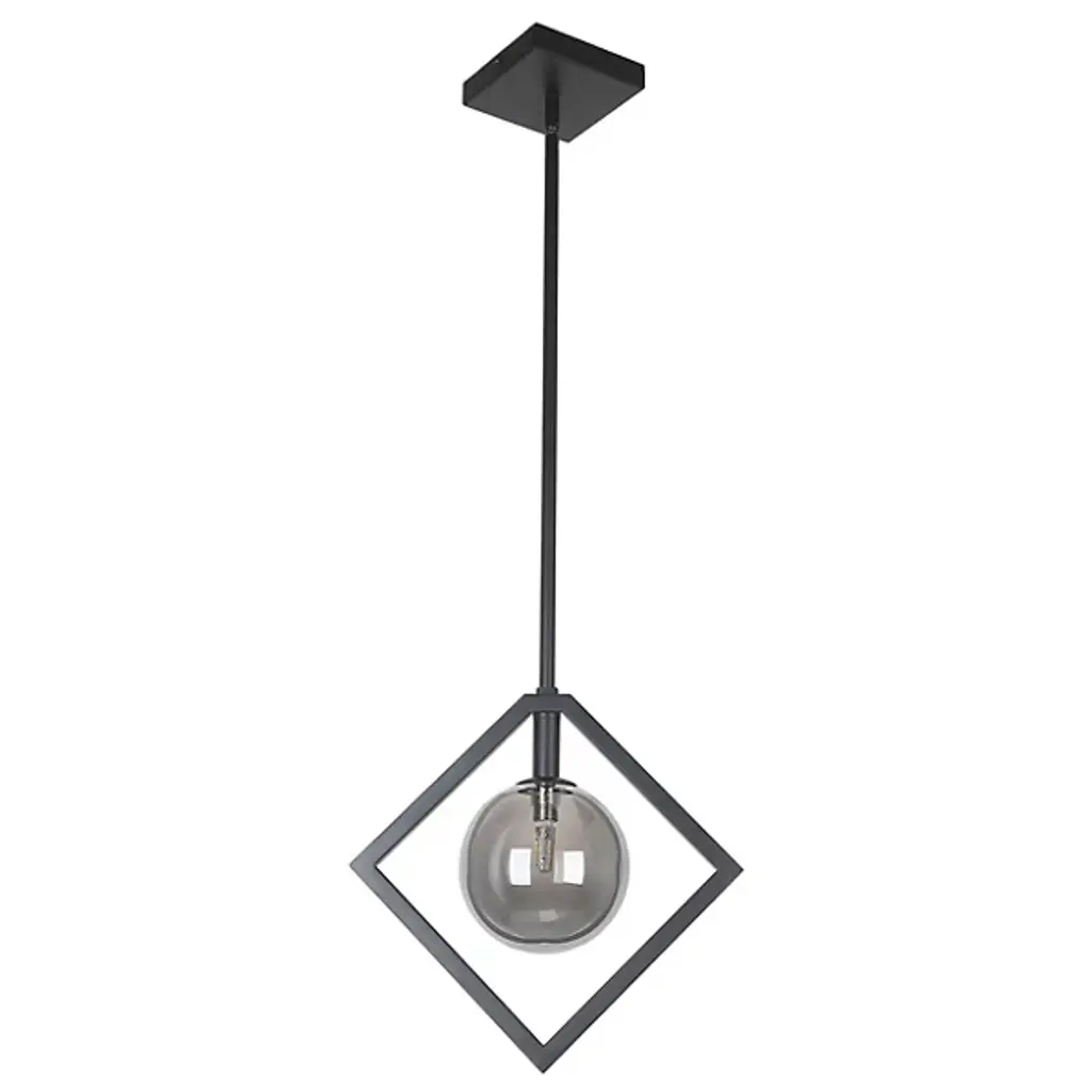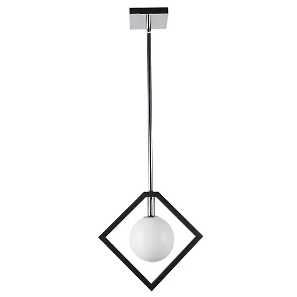 The striking geometric design of the Glasgow Pendant by Dainolite enhances modern spaces as it brightens. A slender downrod drops from a circular canopy to hold a globe-shaped shade made of glass. A square open frame surrounds the shade; its sharp and angular silhouette bringing balance to the softness of the rounded glass. Its warm light provides a delicate ambient light while transforming the ambiance into a more intimate space.
