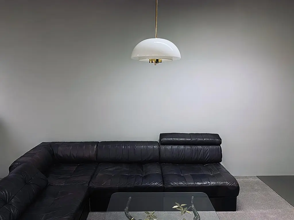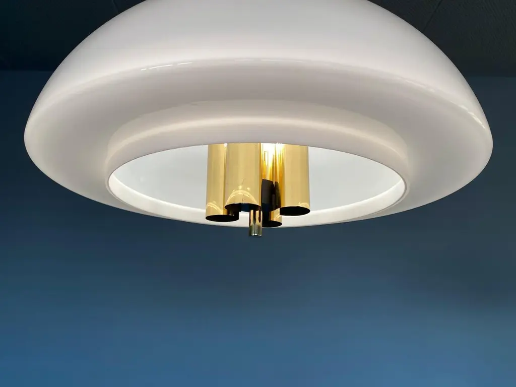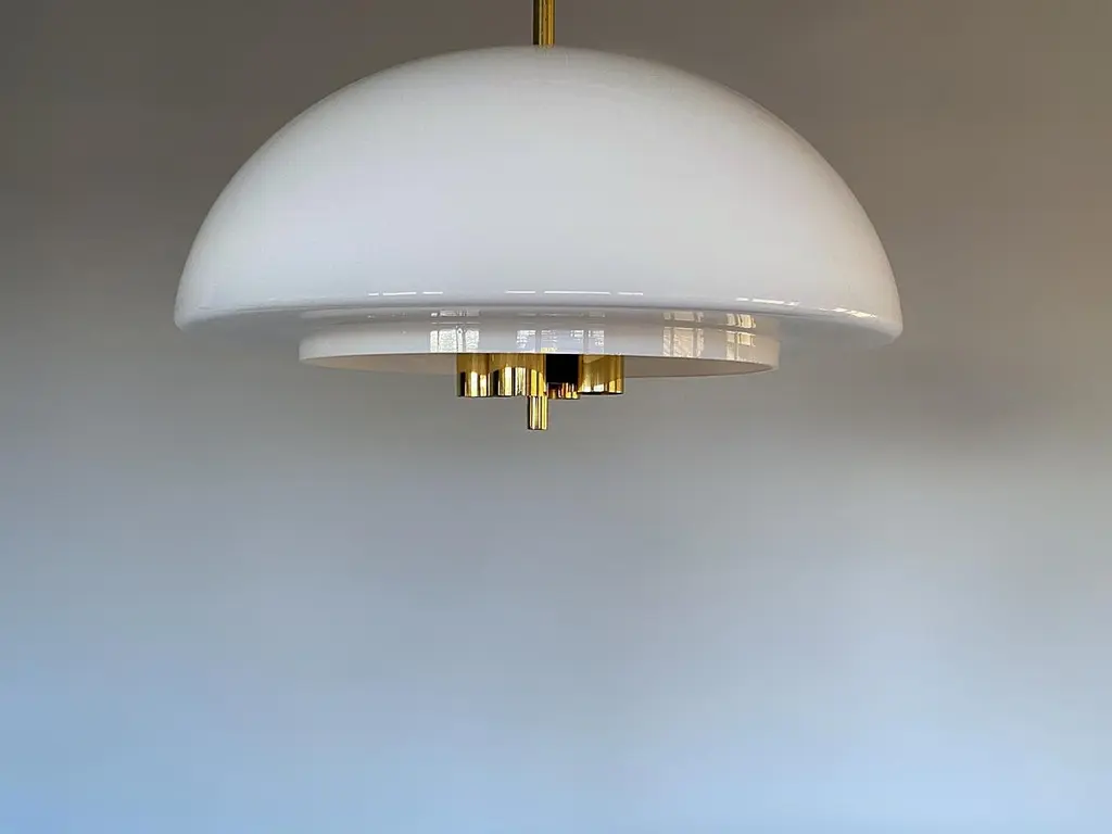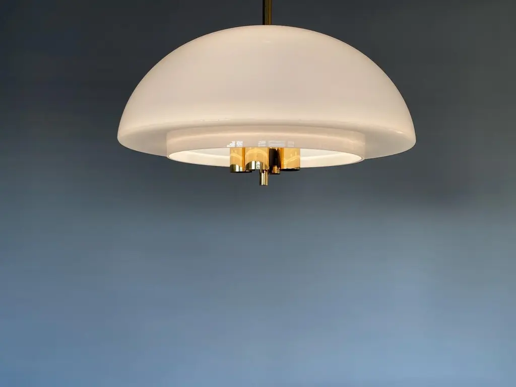Set of five elegant Space Age pendant lamps manufactured by Glashütte Limburg in Germany. The lamp is made of polished brass with a mouth-blown opaline glass lamp shade that provides a smooth and wonderful large area light. The lamps are in good and fully working, tested condition. Four Edison E27 sockets. Works on 110 - 230 Volt. Drop rod can be adjusted as required, free of charge.