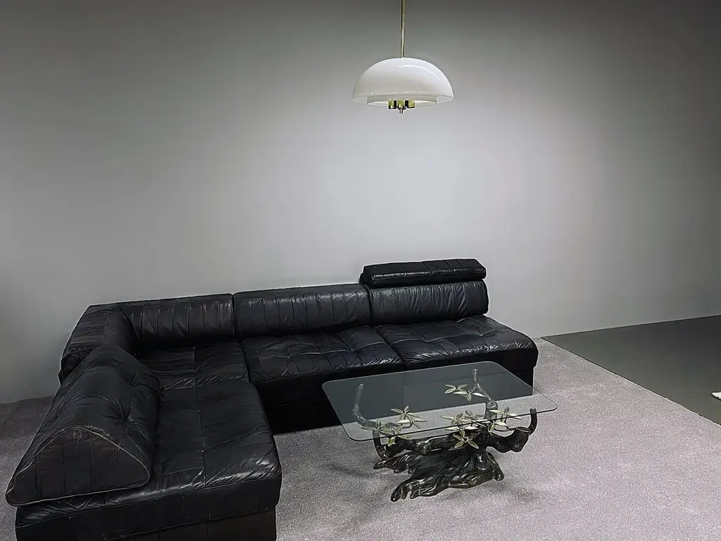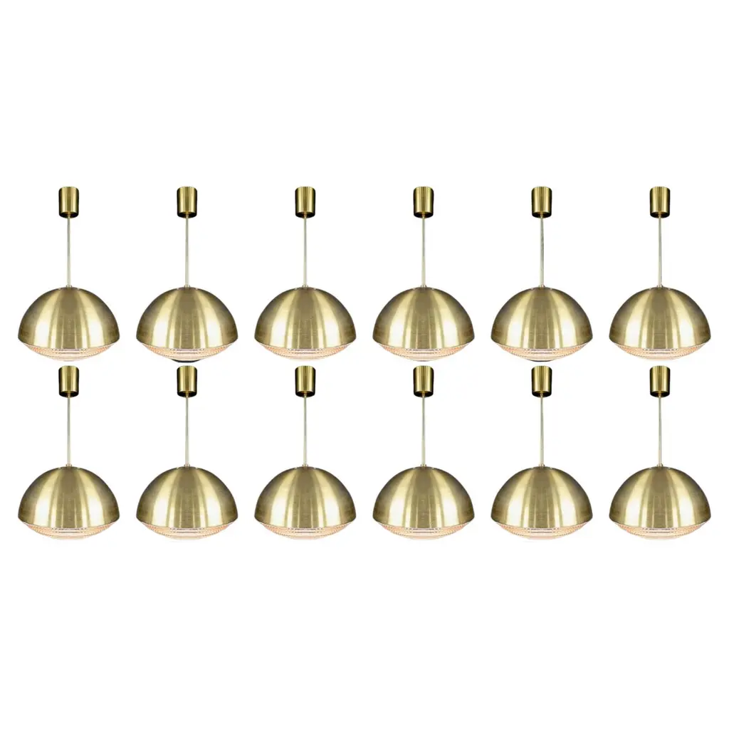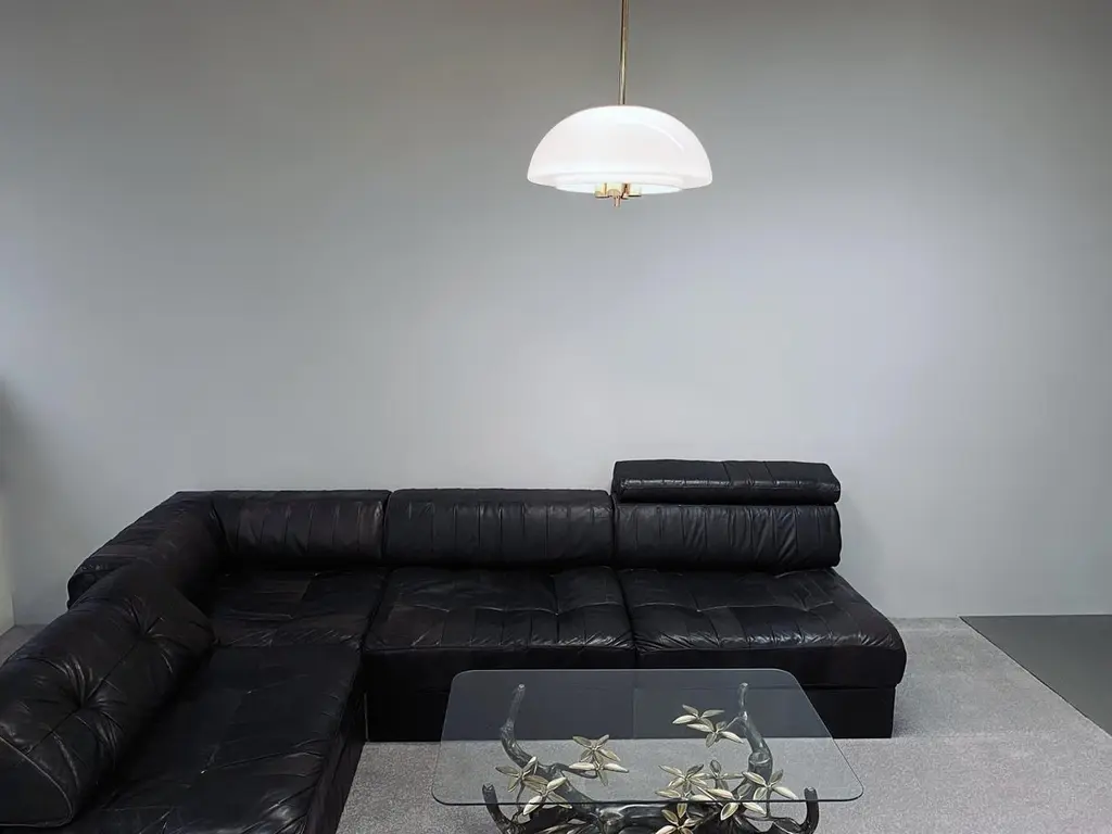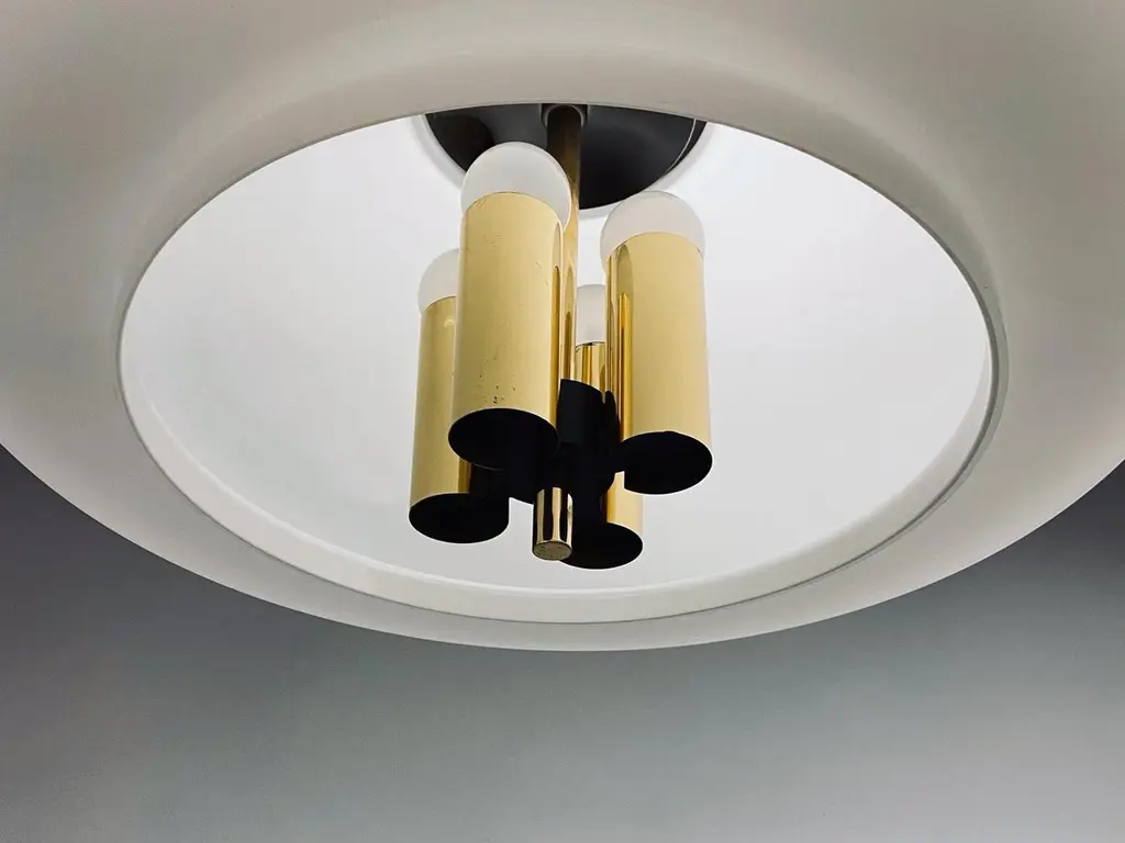 Set of five elegant Space Age pendant lamps manufactured by Glashütte Limburg in Germany. The lamp is made of polished brass with a mouth-blown opaline glass lamp shade that provides a smooth and wonderful large area light. The lamps are in good and fully working, tested condition. Four Edison E27 sockets. Works on 110 - 230 Volt. Drop rod can be adjusted as required, free of charge.