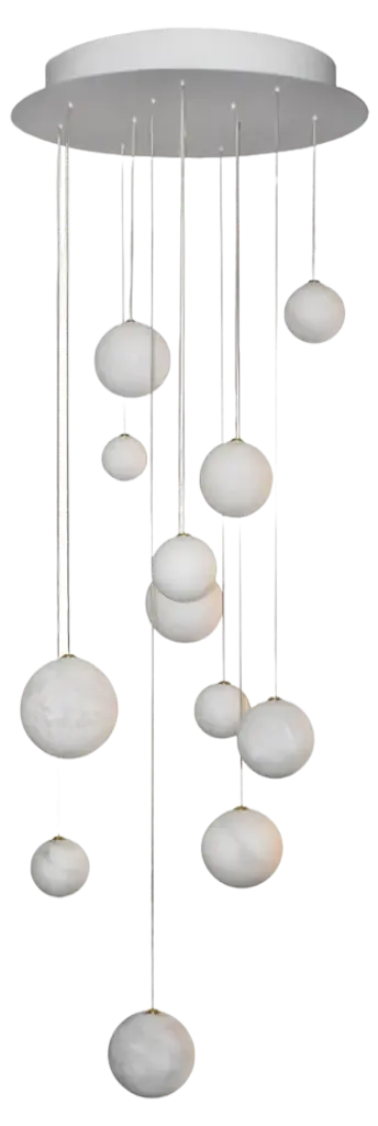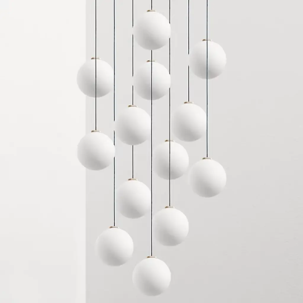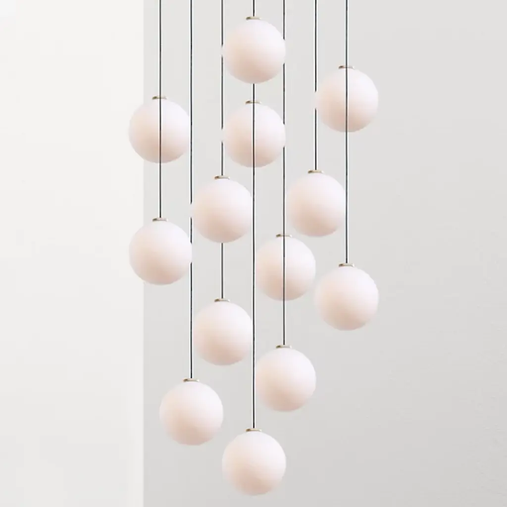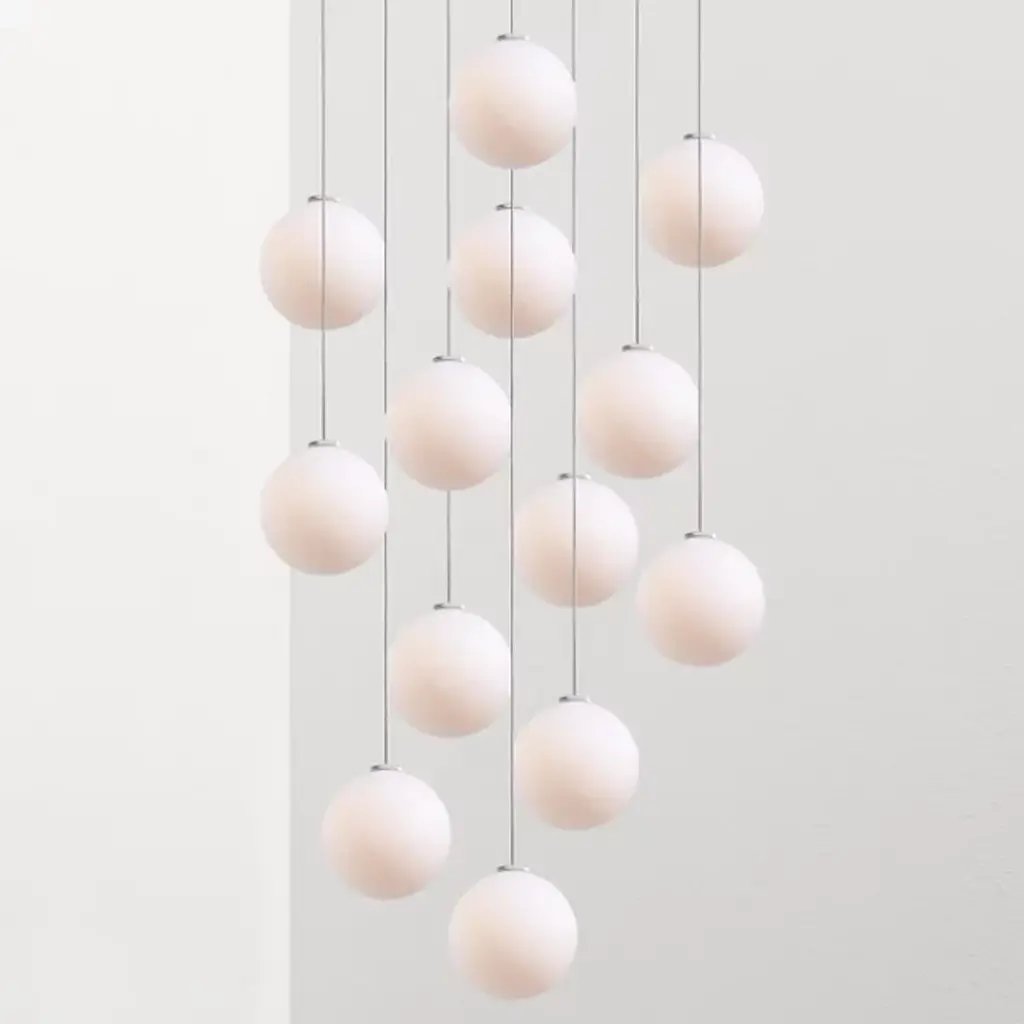 The Glass 120. 13 Multi-Light Pendant by ANONY, seen here in a 13-piece light set, provides brilliant, warm lighting to a variety of applications from lobbies and entryways to more intimate areas like living rooms and bedrooms. Fixture uses integrated LED lamping compatible with electronic-low voltage dimmers. Hanging length reaches a standard of 10 feet but can be customized to 100.