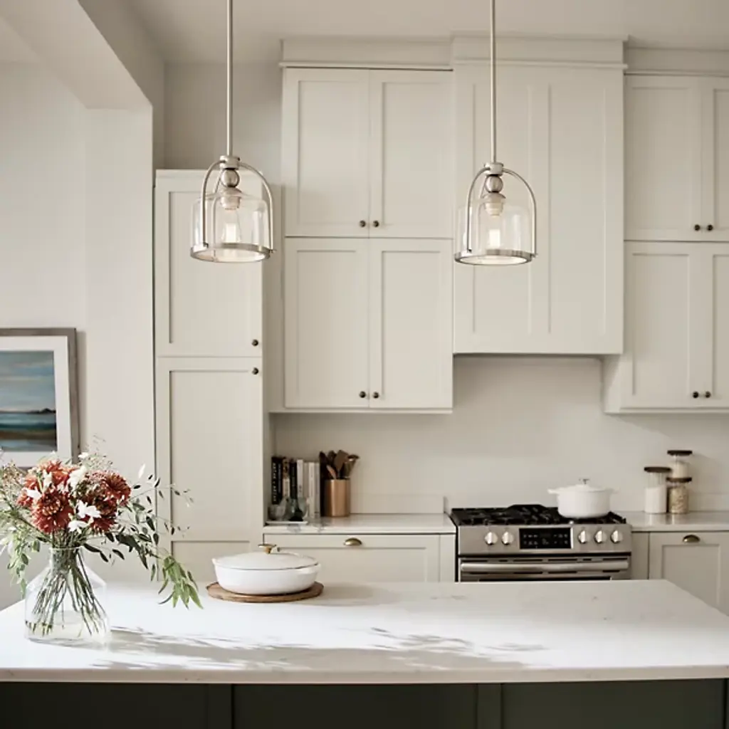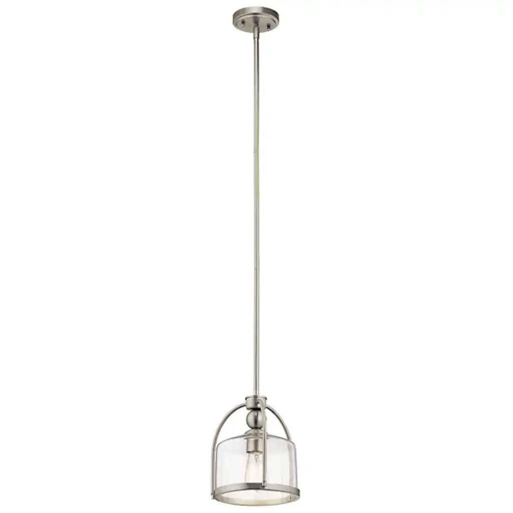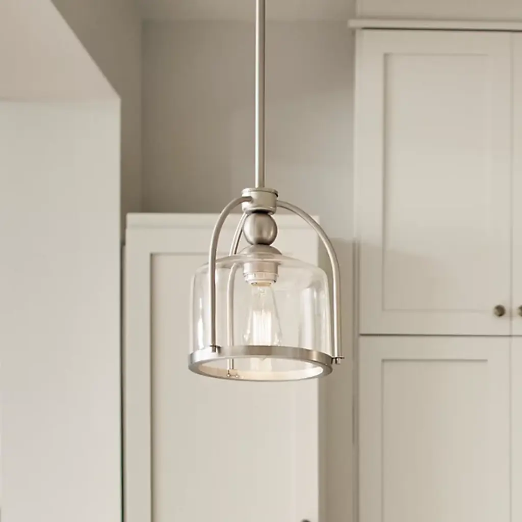 The Glass Mini Pendant from Kichler modernizes traditional bell forms through global design influence. The clear glass shade rests within a steel framework that provides both support and style. An arched top element adds architectural interest while maintaining the fixture's airy appearance. This pendant works especially well in series over kitchen islands or dining areas. The transparent enclosure allows unobstructed light flow while the metalwork adds definition to the overall form. Its adaptable design complements various interior approaches, from minimalist to eclectic.