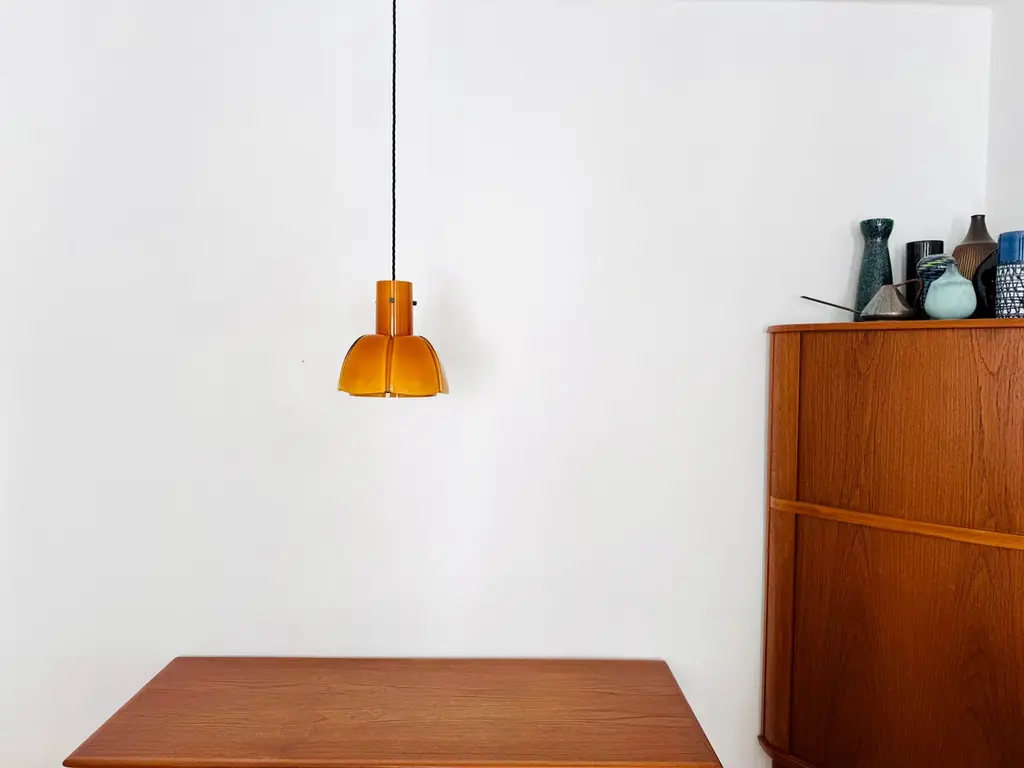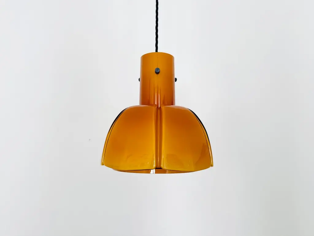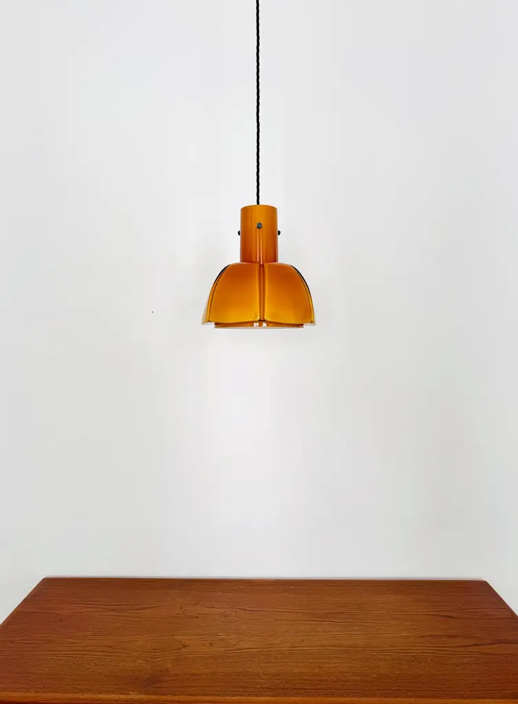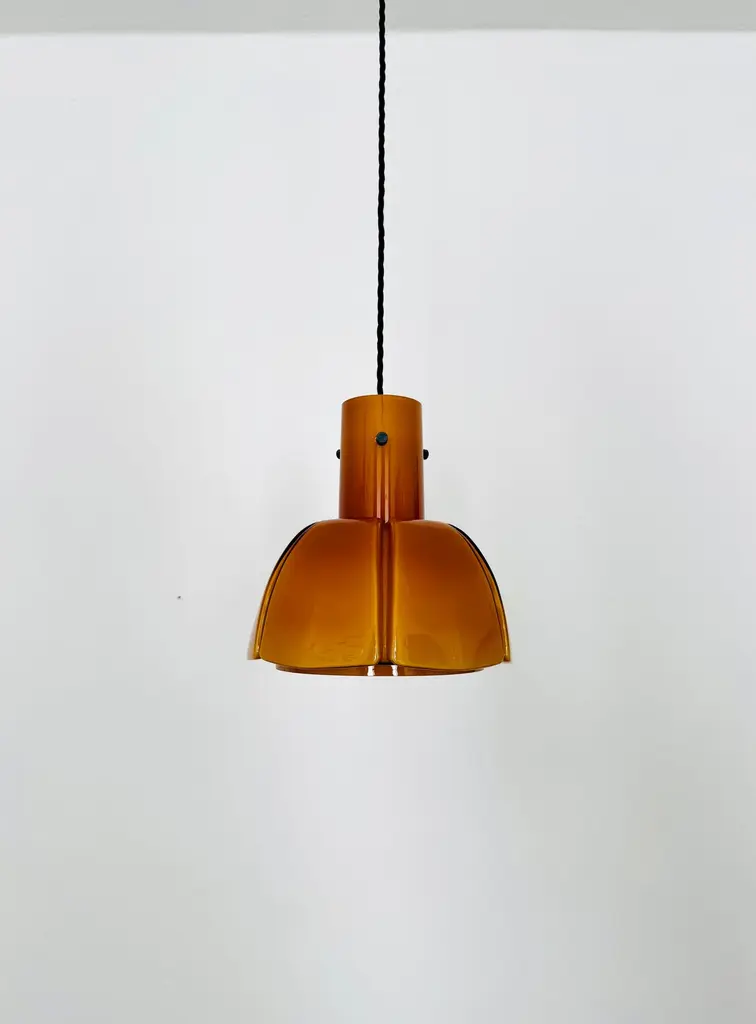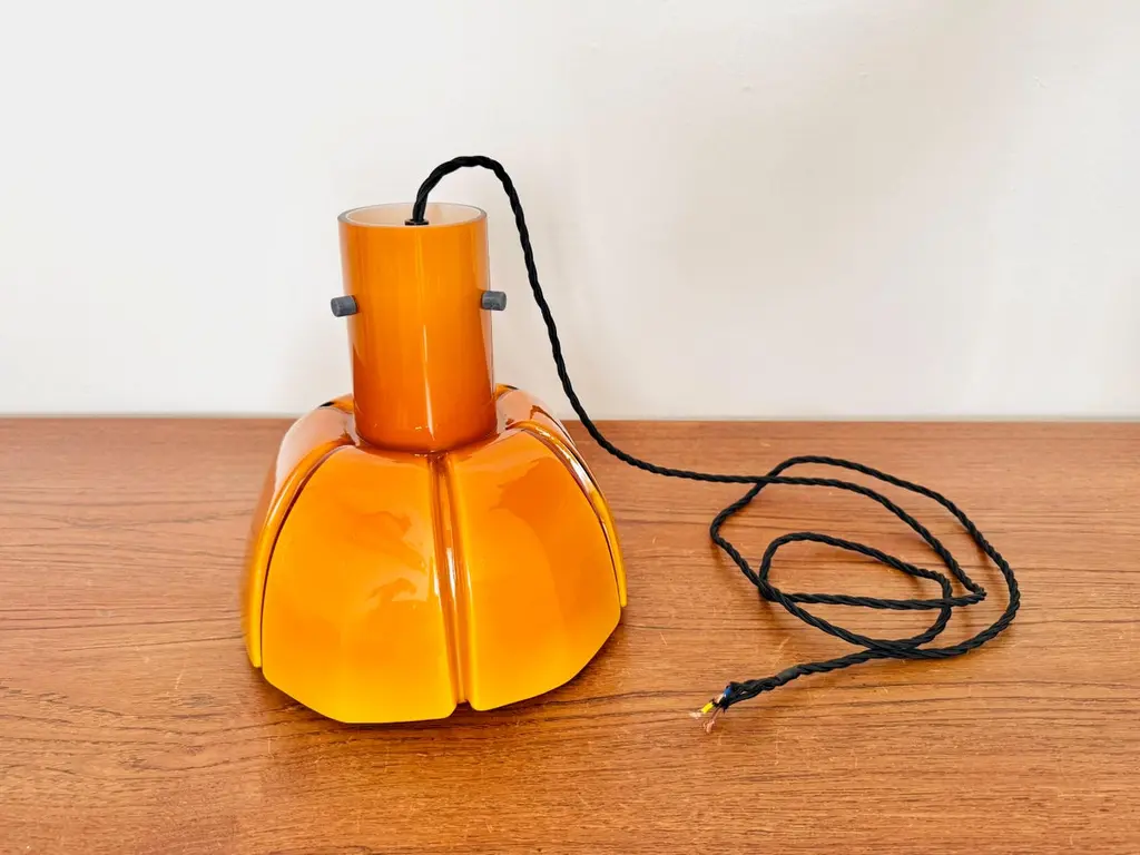 Very beautiful and rare pendant lamp from the 1960s.The hand-blown glass in an amber tone is a real eye-catcher and impressively designed.The lamp creates a cozy atmosphere and enchants with its charisma.Manufacturer: Glashütte Limburg1960sCondition:Very good vintage condition with slight signs of wear consistent with age.The glass is very well preserved with slight signs of age.The pictures are part of the description.I'm happy to help with any further questions.Dimensions:Diameter: 25 cm/ 9.84 in.Height of glass: 25 cm/ 9.84 in.Cable length: 130 cm/ 51.18 in.1x E27/ E26 socketBulb and canopy is not included.