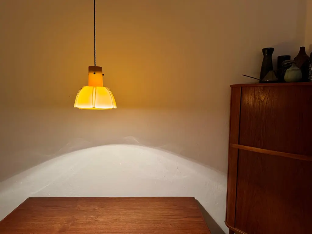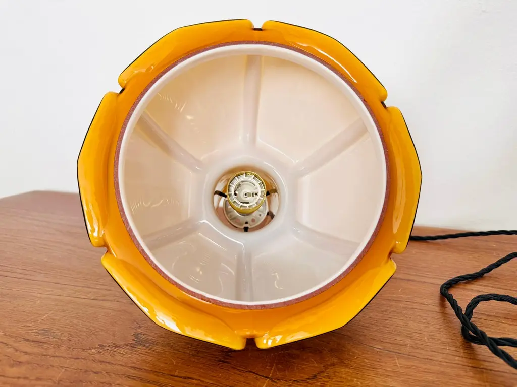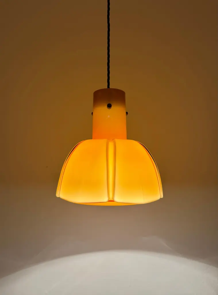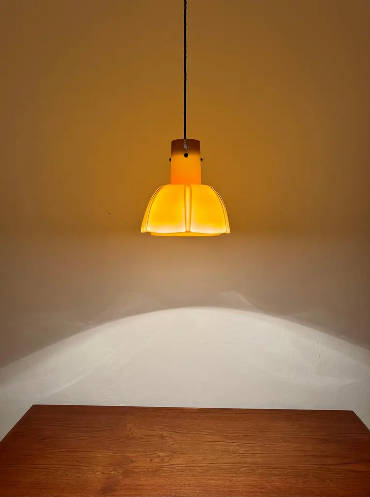 Very beautiful and rare pendant lamp from the 1960s.The hand-blown glass in an amber tone is a real eye-catcher and impressively designed.The lamp creates a cozy atmosphere and enchants with its charisma.Manufacturer: Glashütte Limburg1960sCondition:Very good vintage condition with slight signs of wear consistent with age.The glass is very well preserved with slight signs of age.The pictures are part of the description.I'm happy to help with any further questions.Dimensions:Diameter: 25 cm/ 9.84 in.Height of glass: 25 cm/ 9.84 in.Cable length: 130 cm/ 51.18 in.1x E27/ E26 socketBulb and canopy is not included.