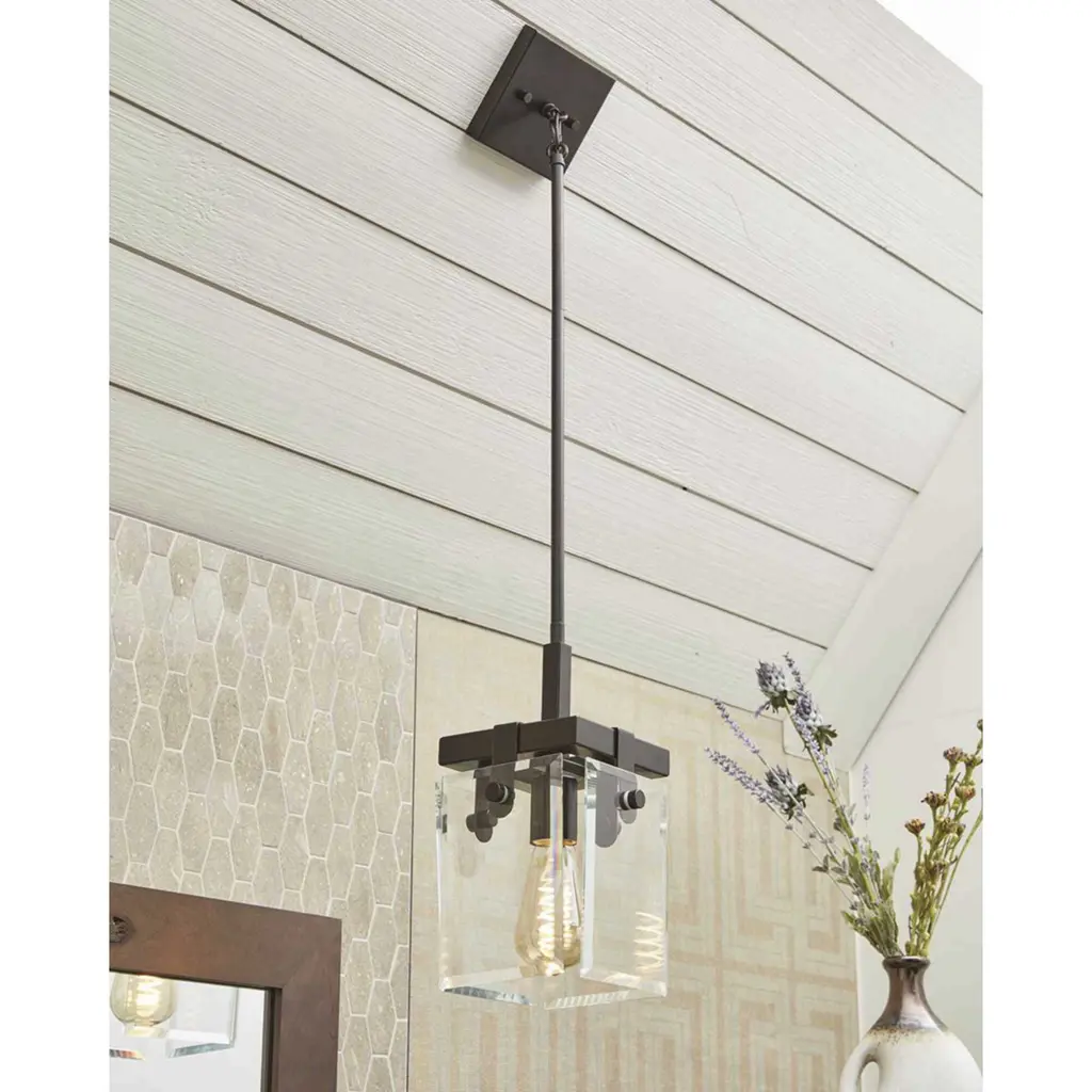 Inspired by modern architecture. Glayse features handsome details for variety of interior design styles. The frameless unbounded beveled glass creates beautiful light and reflection. The structure of Glayse is the focal point of the design, where form follows function. The one-light mini-pendant is complimented by an Antique Bronze finish.