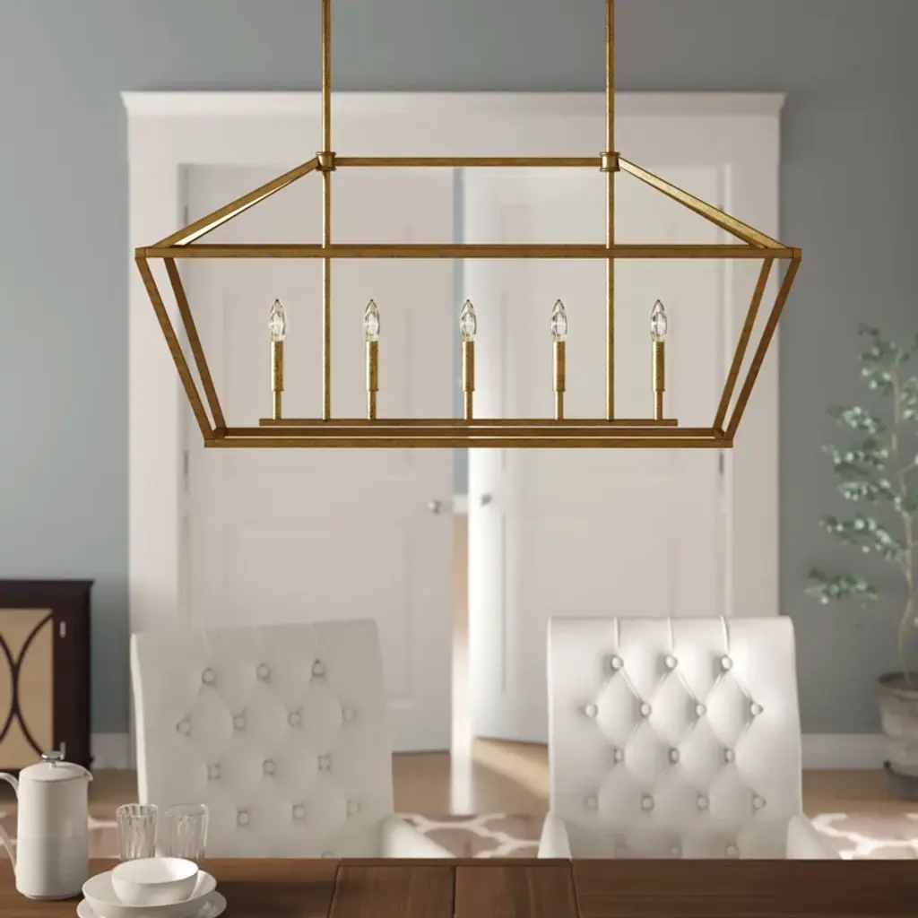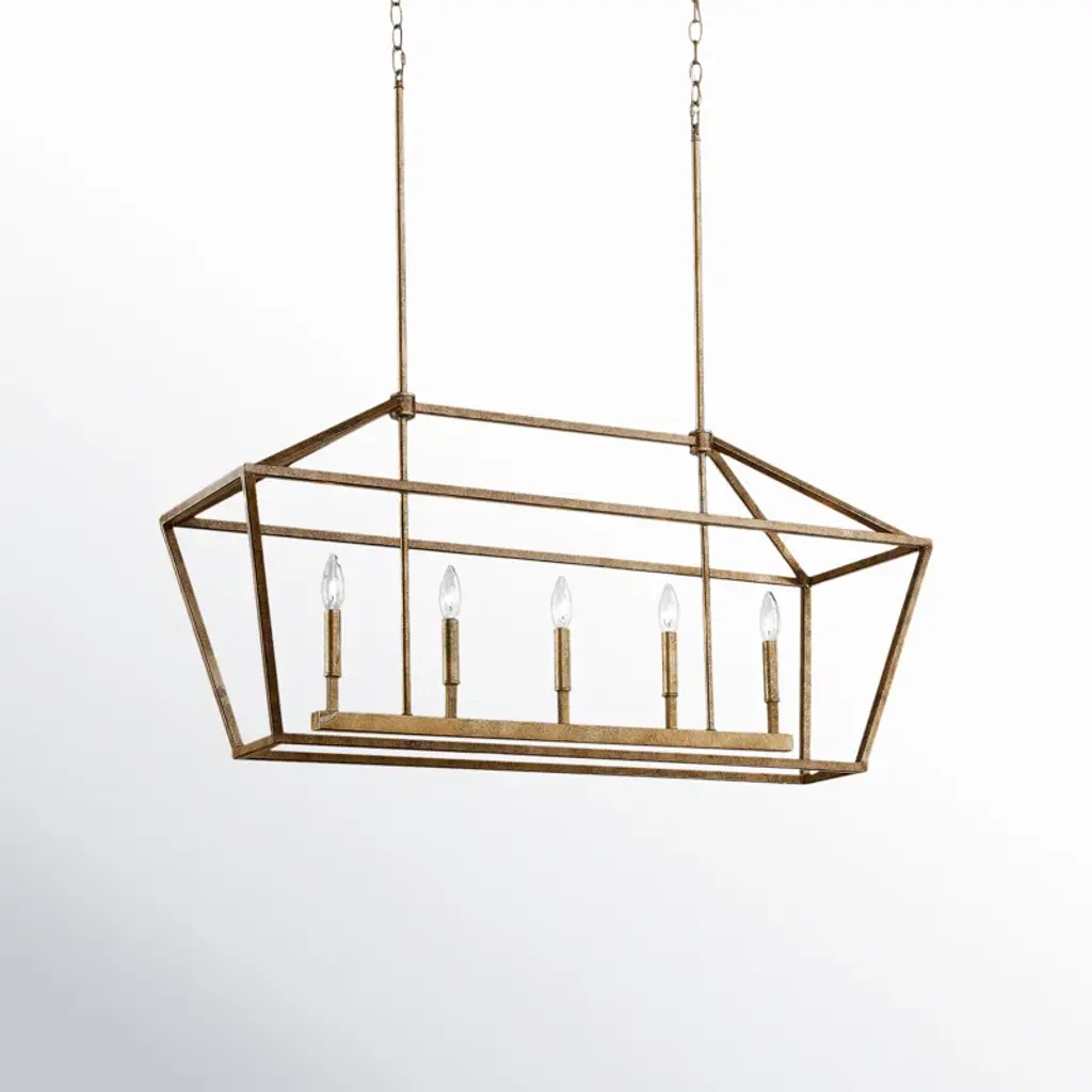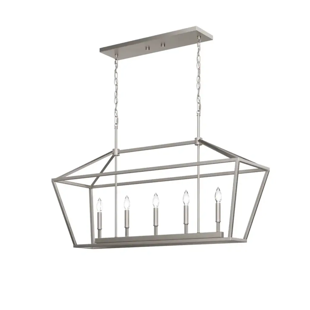 This 5-light linear pendant brings home all the farmhouse charm you need. It's made from metal with an open, caged design that's available in your choice of a neutral finish. Inside, this pendant has slim candle holders that each accommodate a 60W bulb, which is sold separately. It's suspended from two slim downrods and a matching canopy that's compatible with sloped ceilings. We love how this pendant looks hanging over your kitchen island while you chop veggies, or brightening up family dinner.