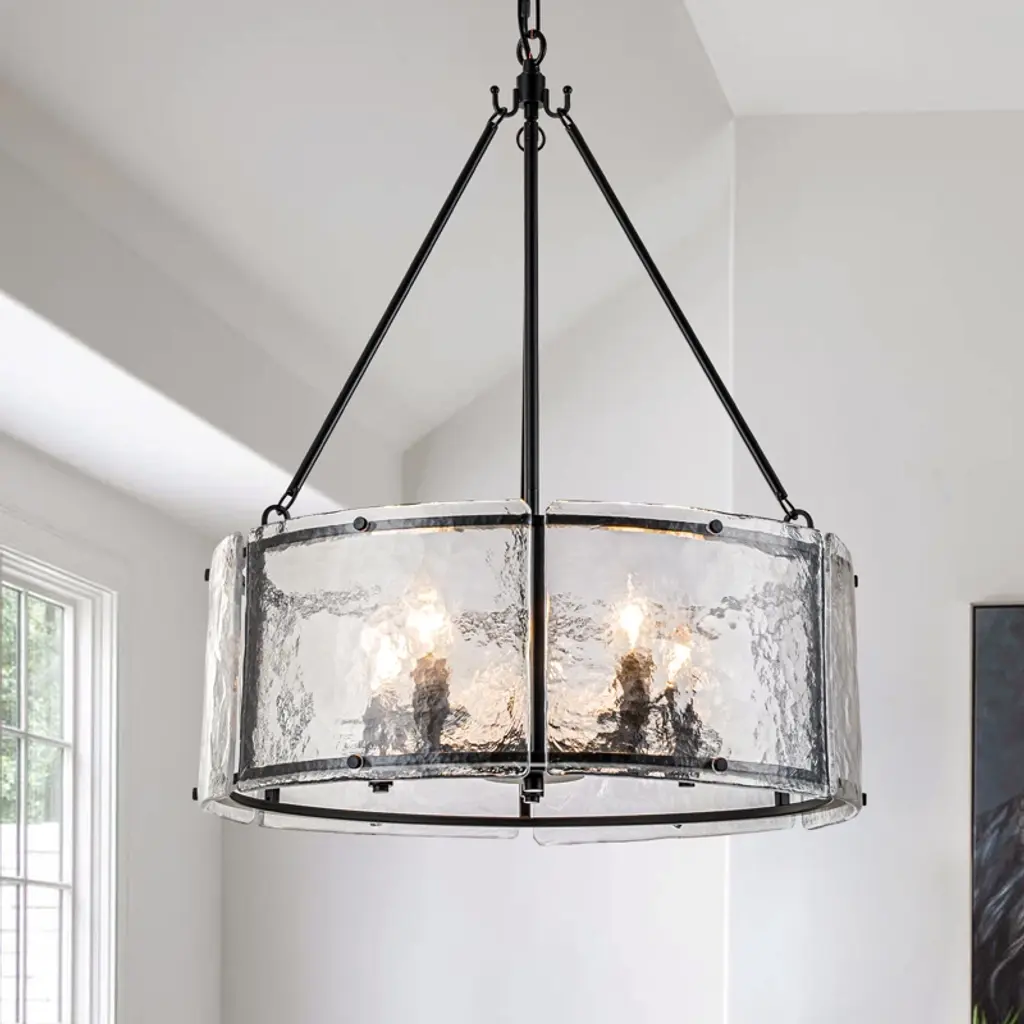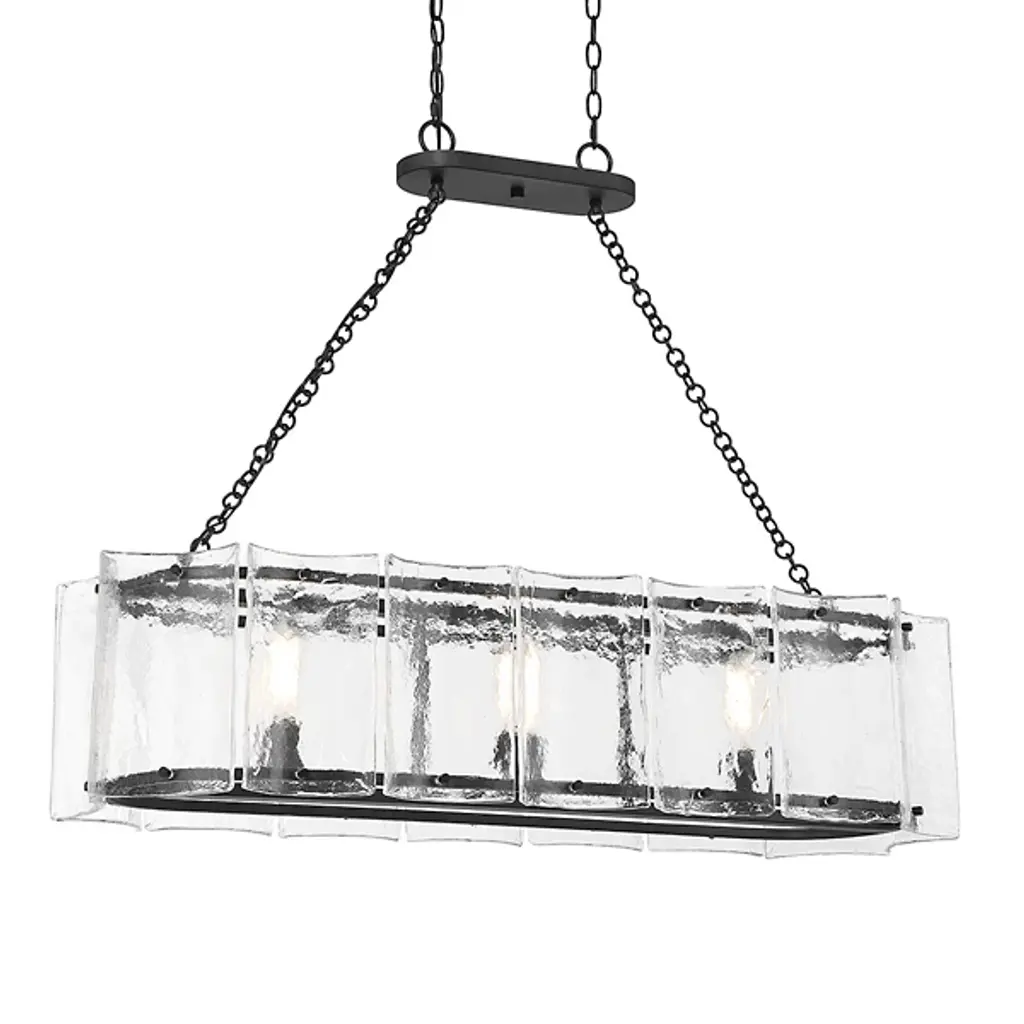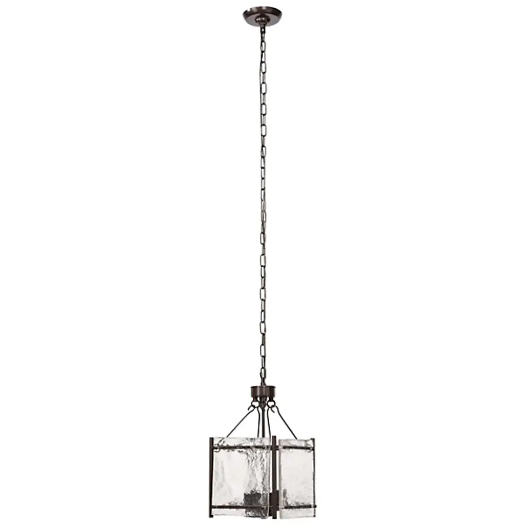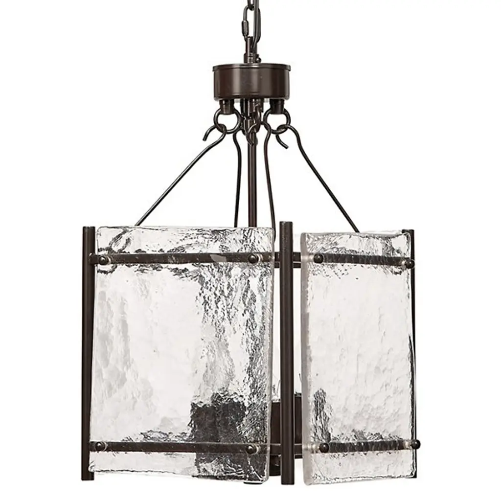 Exemplifying a refined interplay of contrasts, the Glenn Pendant from Jamie Young Co. showcases a gracefully curved slice of icelike glass, delicately softening and diffusing the radiant "flame" of the bulbs nestled behind it. Enhanced by a sleek oil-rubbed bronze canopy and chain, the richly textured glass exudes an air of sophistication and simplicity. Ideal for above a dining table or as a dramatic focal point in an entryway, it adds timeless elegance and allure to any space.