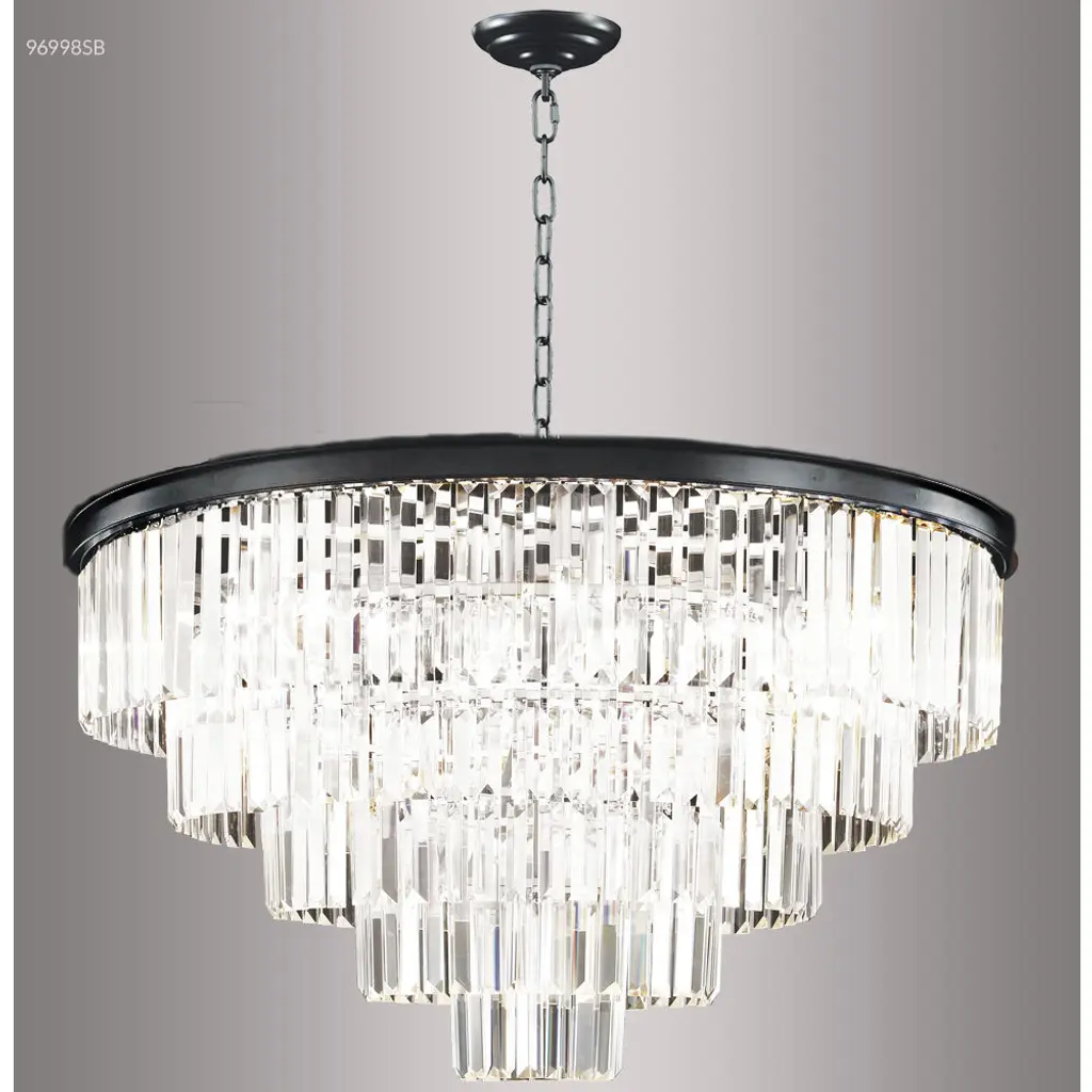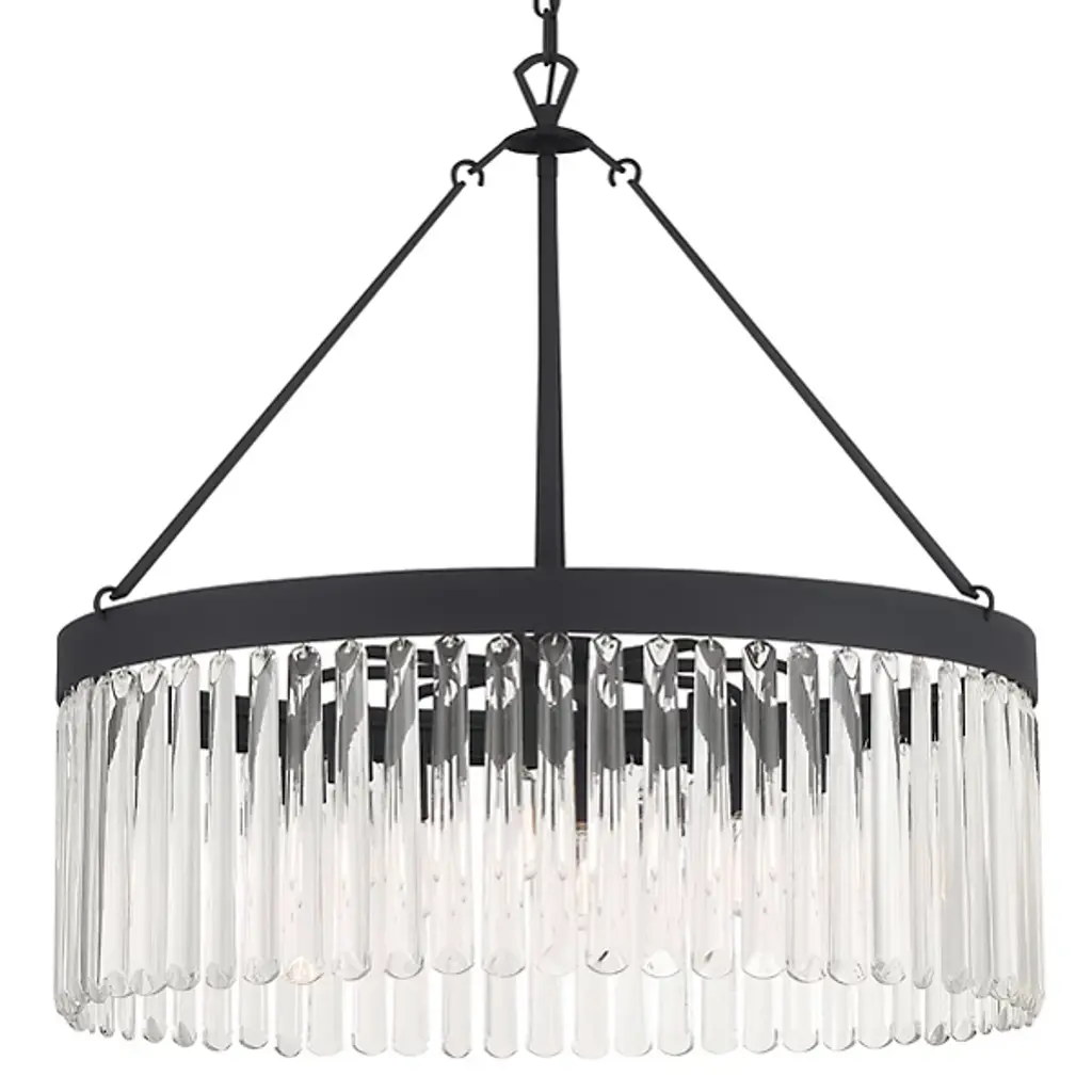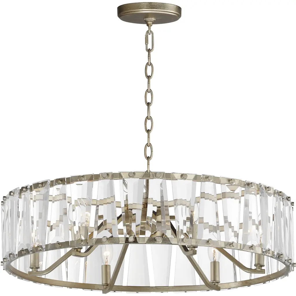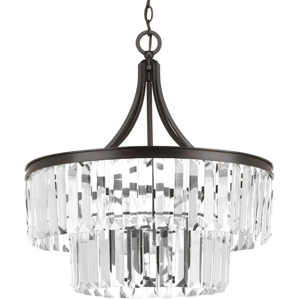Glimmer fits the definition of livable luxury with elements that sparkle to create an instant statement within the home. Prismatic glass five-light pendants are supported by an architecturally- styled frame in Antique Bronze finish. The cascade of faceted linear glass deliver a sleek silhouette to any room.