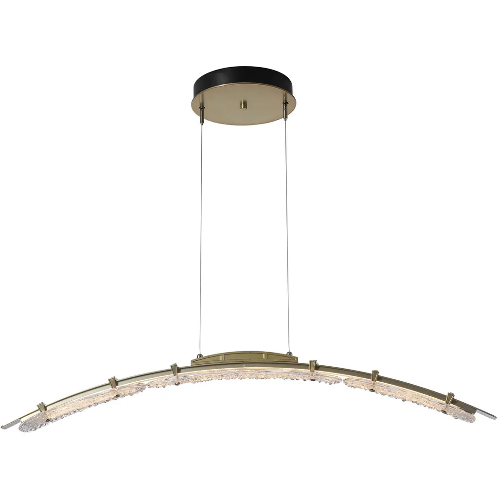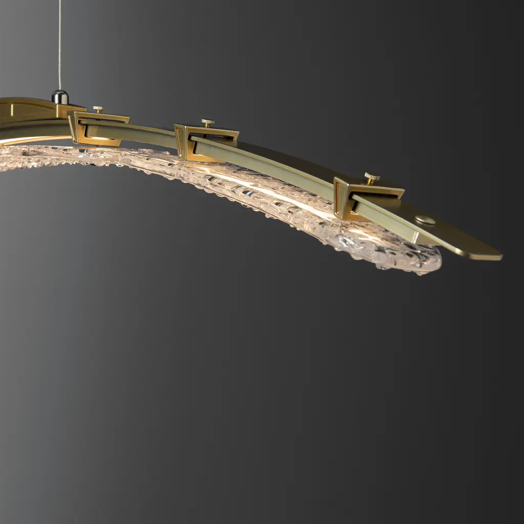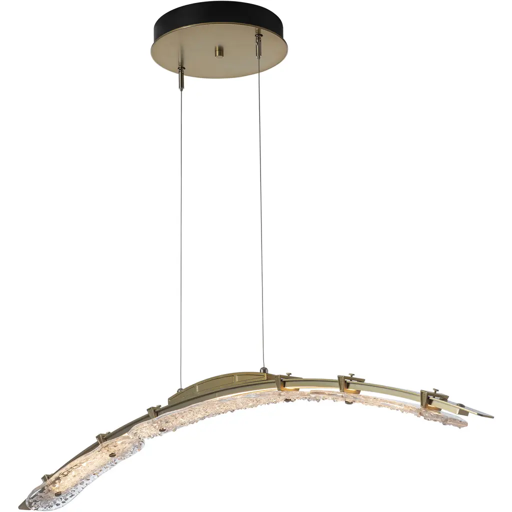The Glissade Large Pendant features a large, hand-poured, hand-shaped glass that is heavily fritted for a one-of-a-kind, contemporary elegance. This pendant, a full 43.5” in width, is suspended by two cables from a small, round canopy. Perfect for dining or entertainment spaces, or over a large kitchen island or bar, the Glissade is as functional as it is beautiful.