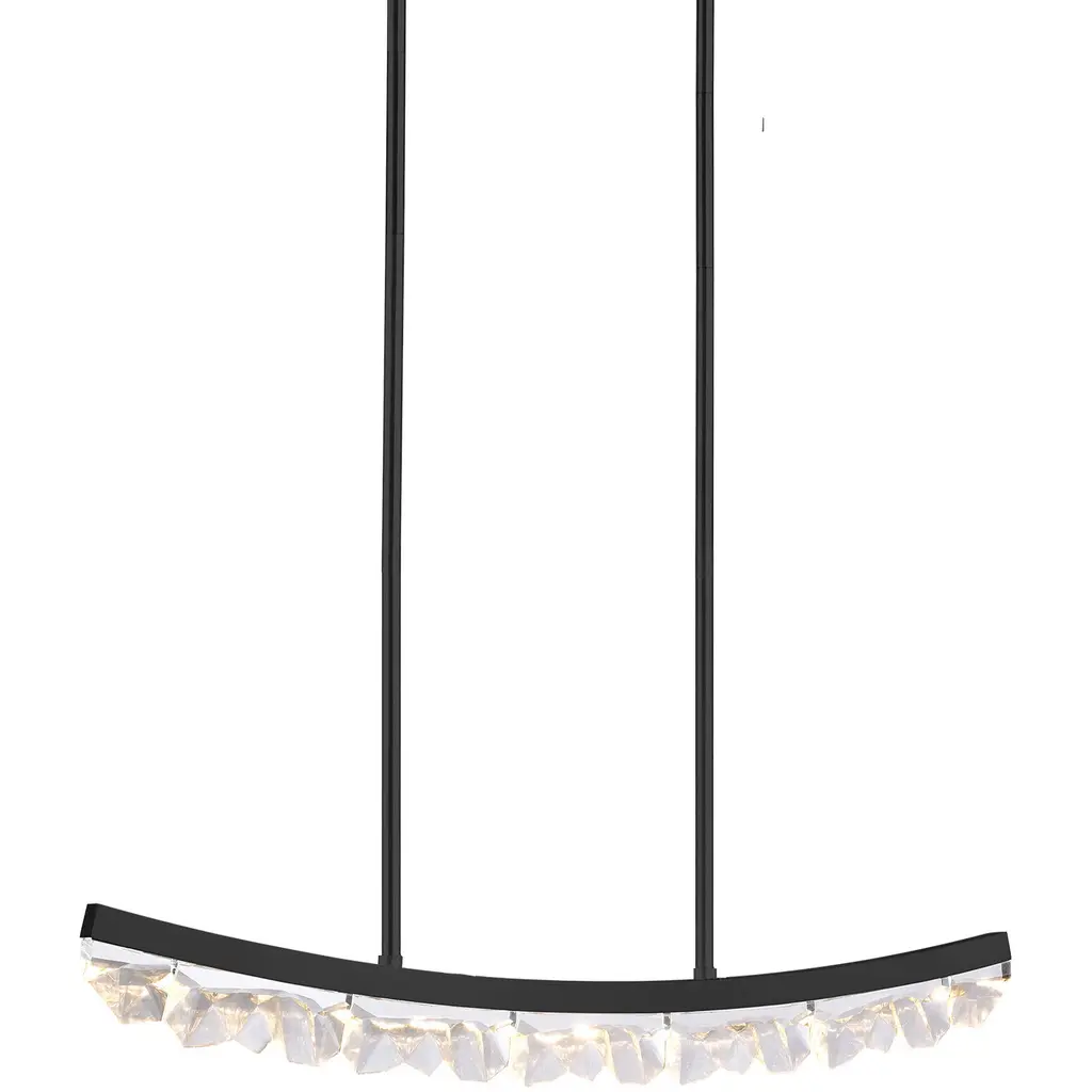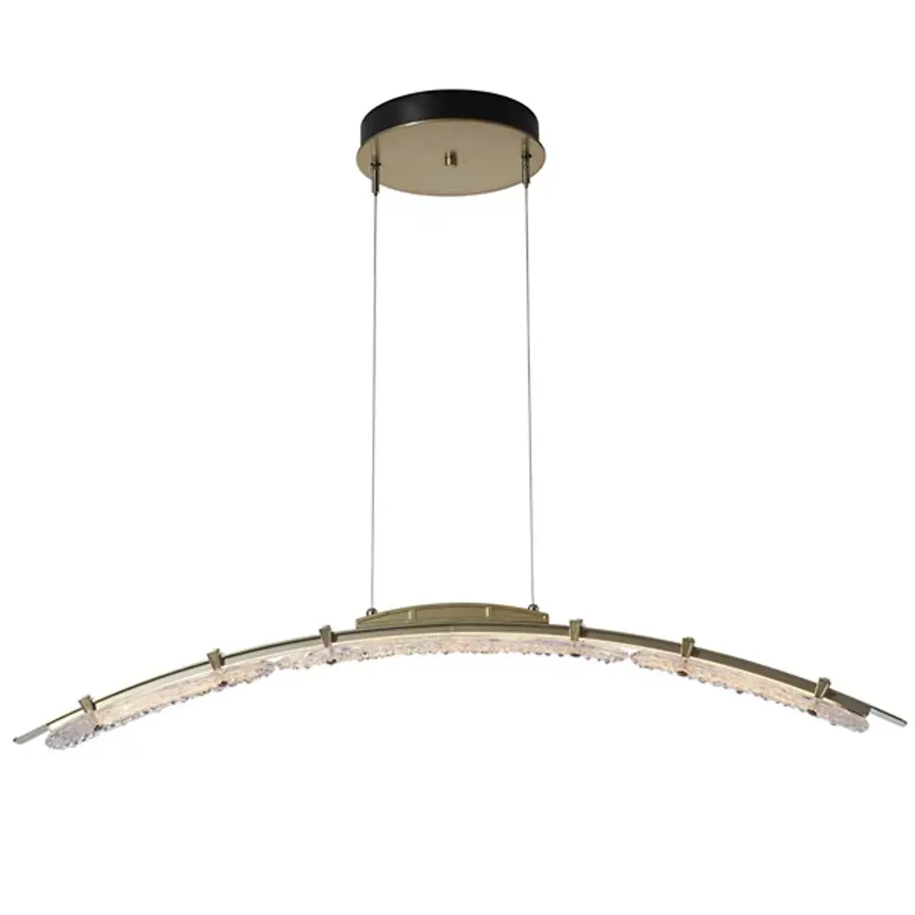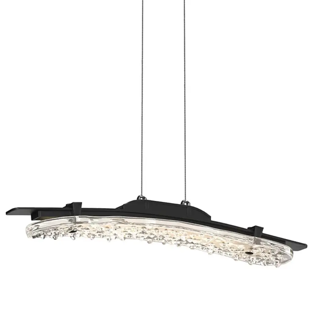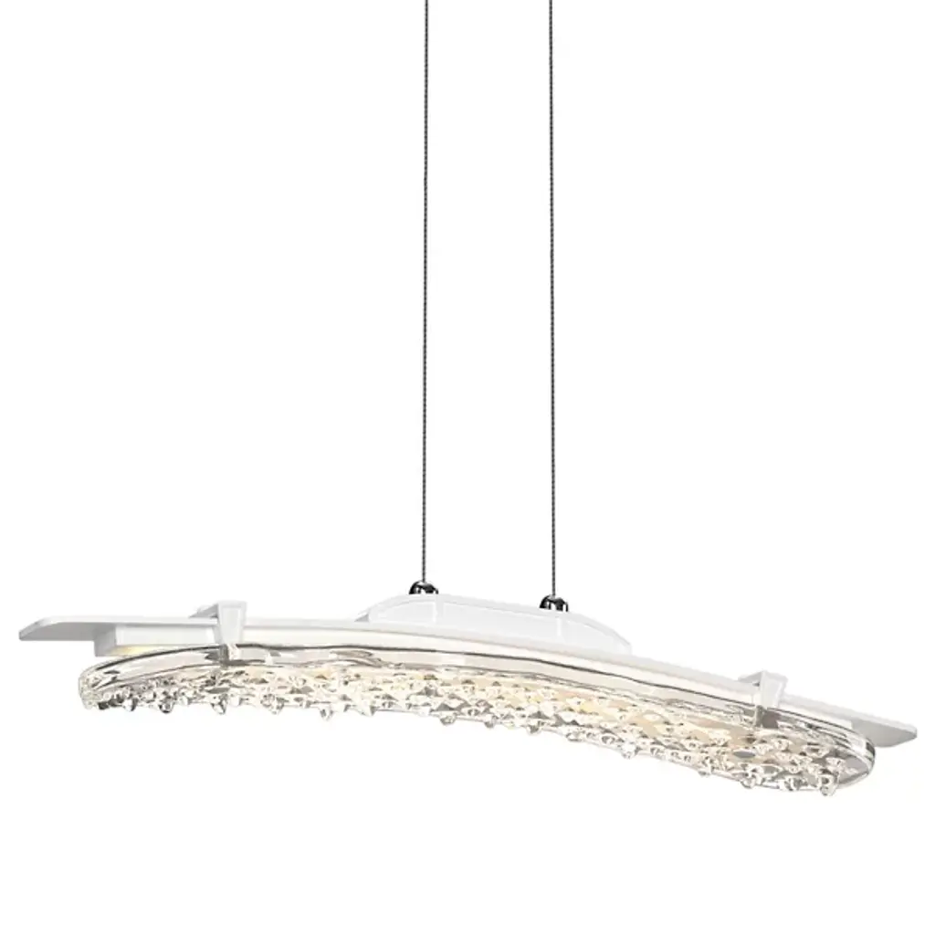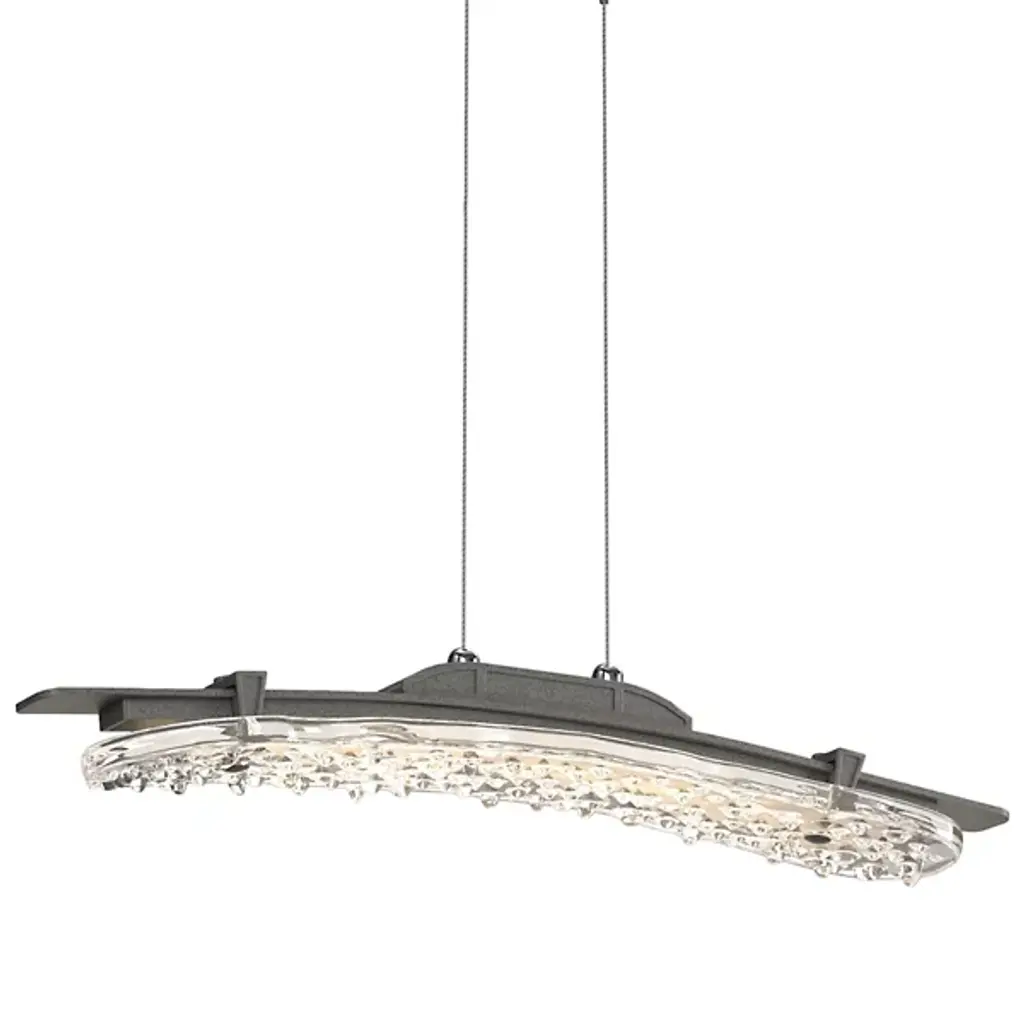 A distinctive lighting design inspired by the idea of light shining through lake ice. The Glissade LED Pendant by Hubbardton Forge also suggests movement in its gentle curve, embodying the act of glissade, or sliding down an icy hill. The glass shade is hand-poured and finished with a generous layer of glass frit to give it a glacial texture. In place within the curved metal frame, the glass sparkles warmly with the sun-like light of the LEDs housed within. Designed by Andy Morter.