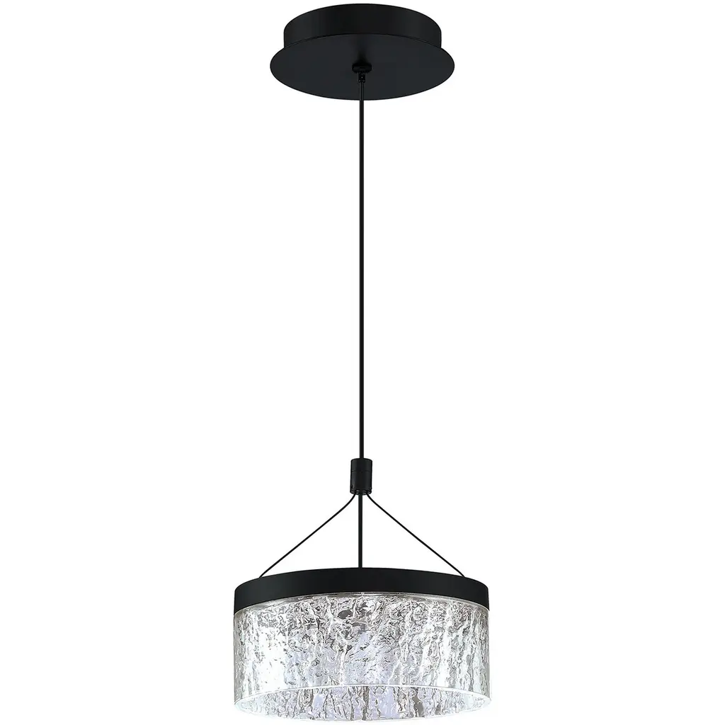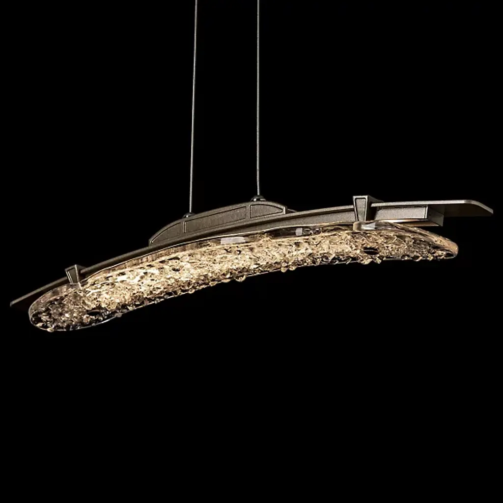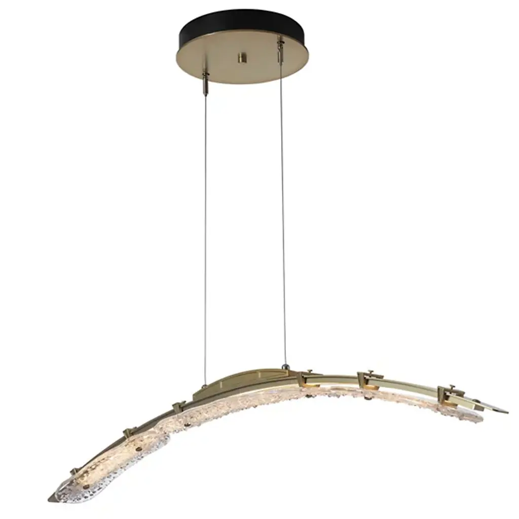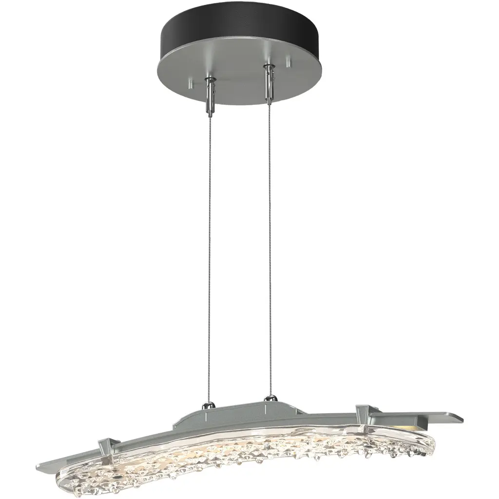 A distinctive lighting design inspired by the idea of light shining through lake ice. The Glissade LED Pendant by Hubbardton Forge also suggests movement in its gentle curve, embodying the act of glissade, or sliding down an icy hill. The glass shade is hand-poured and finished with a generous layer of glass frit to give it a glacial texture. In place within the curved metal frame, the glass sparkles warmly with the sun-like light of the LEDs housed within. Designed by Andy Morter.