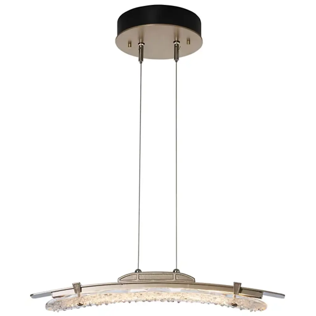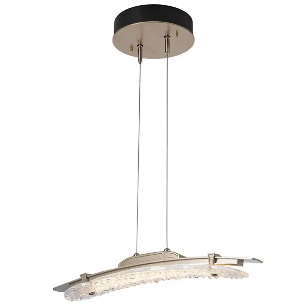 A distinctive lighting design inspired by the idea of light shining through lake ice. The Glissade LED Pendant by Hubbardton Forge also suggests movement in its gentle curve, embodying the act of glissade, or sliding down an icy hill. The glass shade is hand-poured and finished with a generous layer of glass frit to give it a glacial texture. In place within the curved metal frame, the glass sparkles warmly with the sun-like light of the LEDs housed within. Designed by Andy Morter.