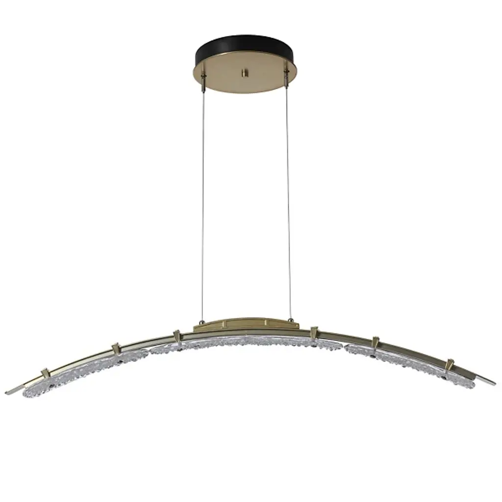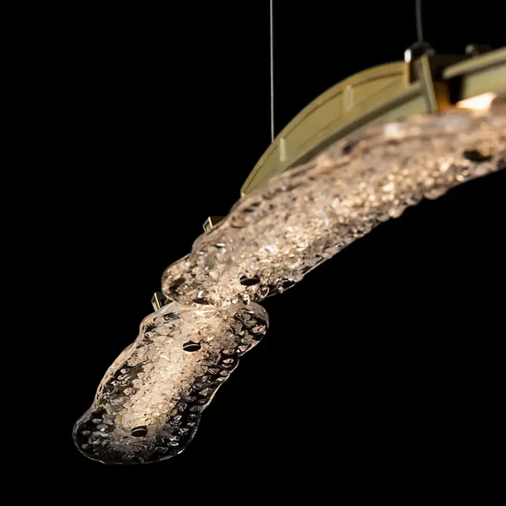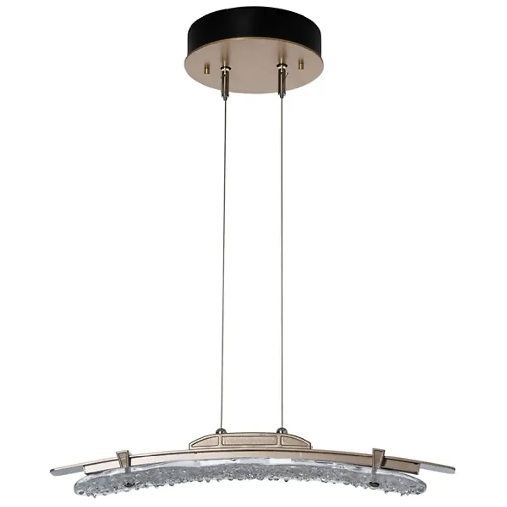 A distinctive lighting design inspired by the idea of light shining through lake ice. The Glissade LED Pendant by Hubbardton Forge also suggests movement in its gentle curve, embodying the act of glissade, or sliding down an icy hill. The glass shade is hand-poured and finished with a generous layer of glass frit to give it a glacial texture. In place within the curved metal frame, the glass sparkles warmly with the sun-like light of the LEDs housed within. Designed by Andy Morter.