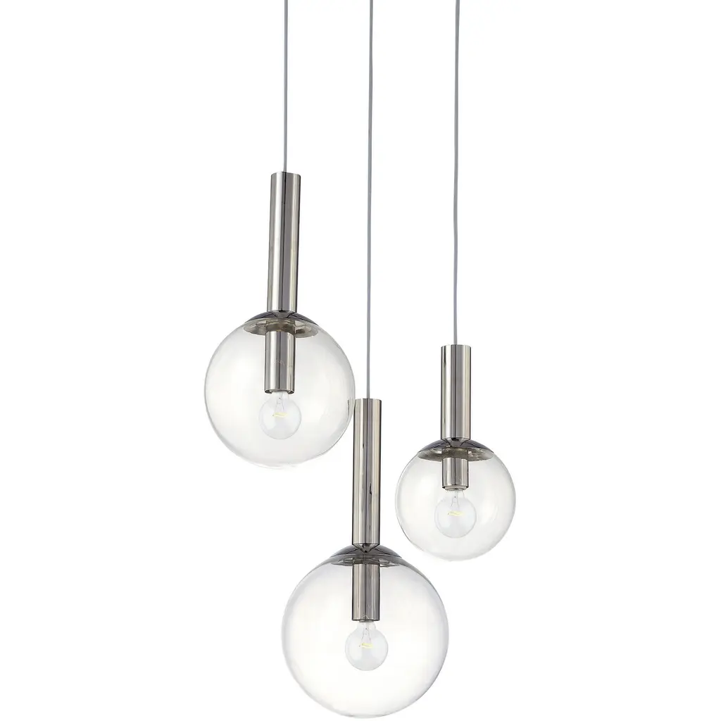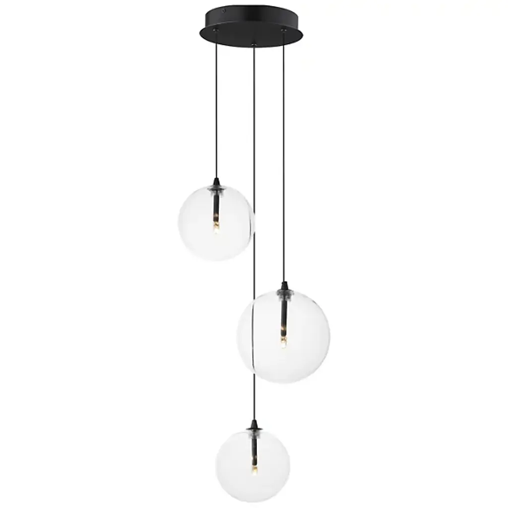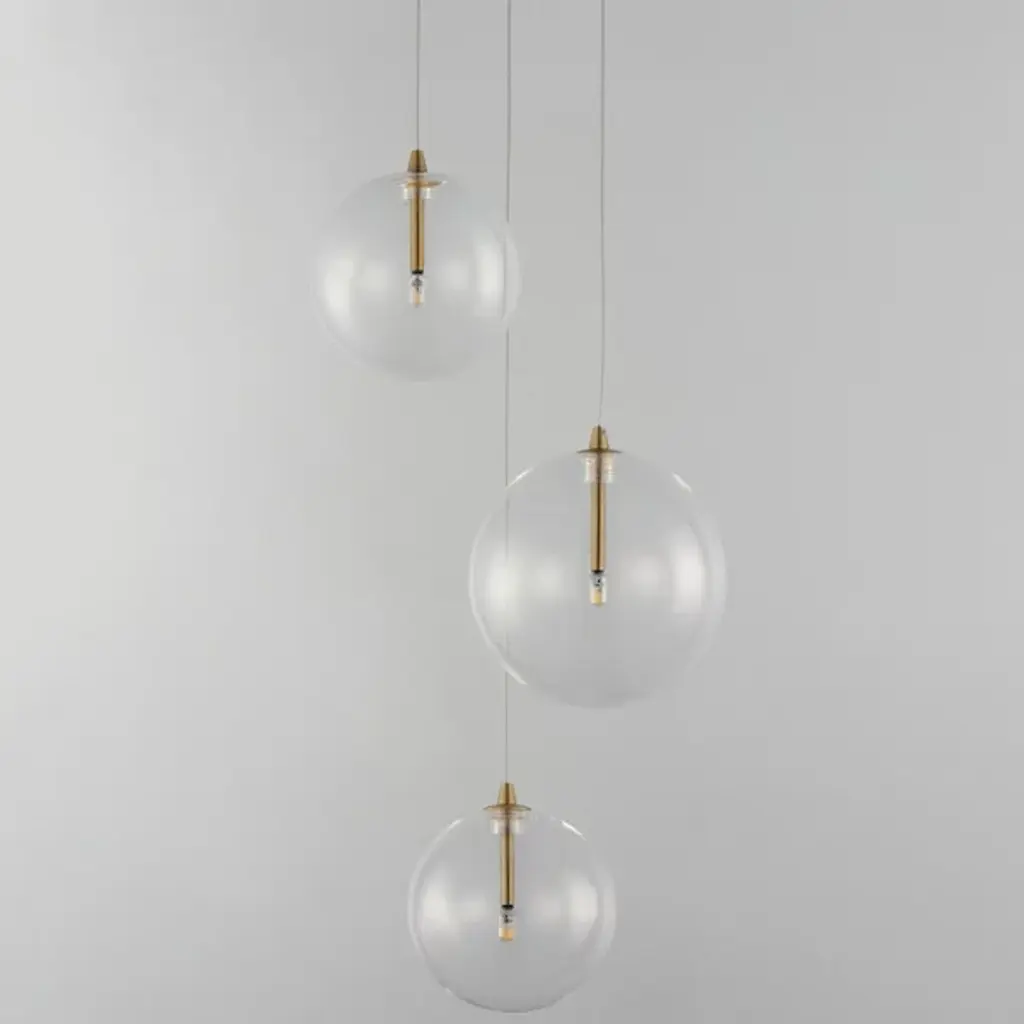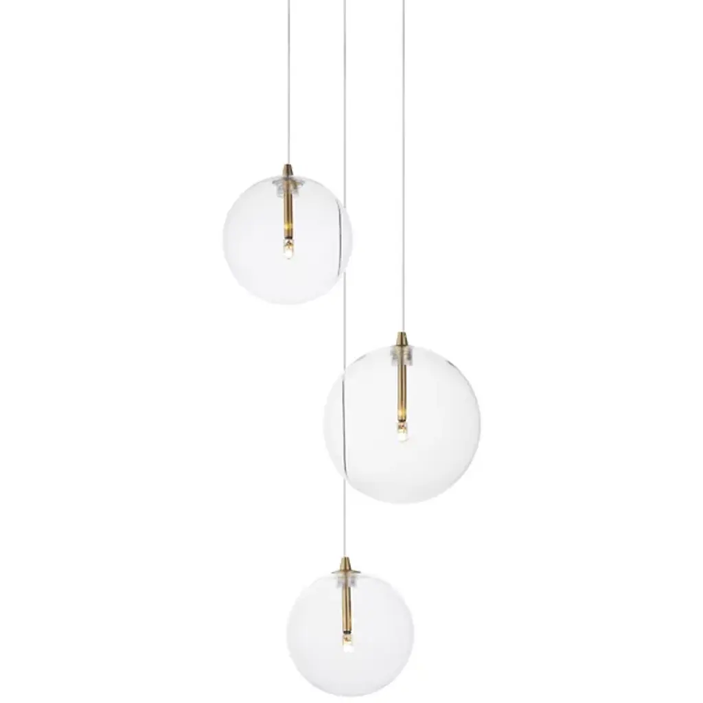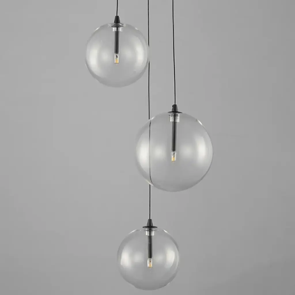 The Global Multi Light Pendant from ET2 Lighting presents a minimalist yet remarkable design. Three clear glass globes of varying sizes hang from thin cords, creating an asymmetrical, entrancing arrangement. Each sphere houses a single bulb, its light unobstructed by the transparent enclosure. The fixture's sleek disc canopy provides a subtle anchor point for the suspended orbs. This pendant is perfect for modern interiors seeking some understated drama.