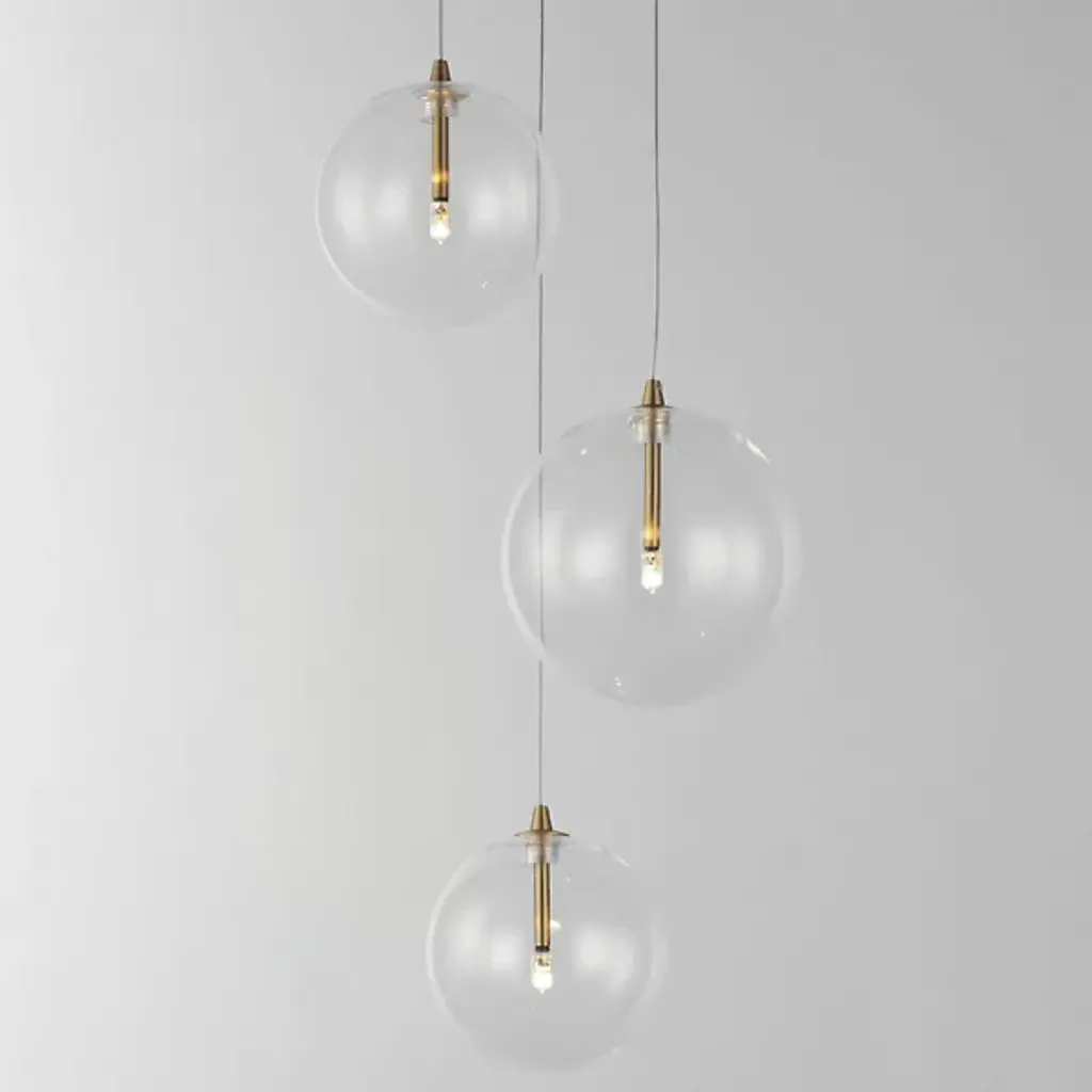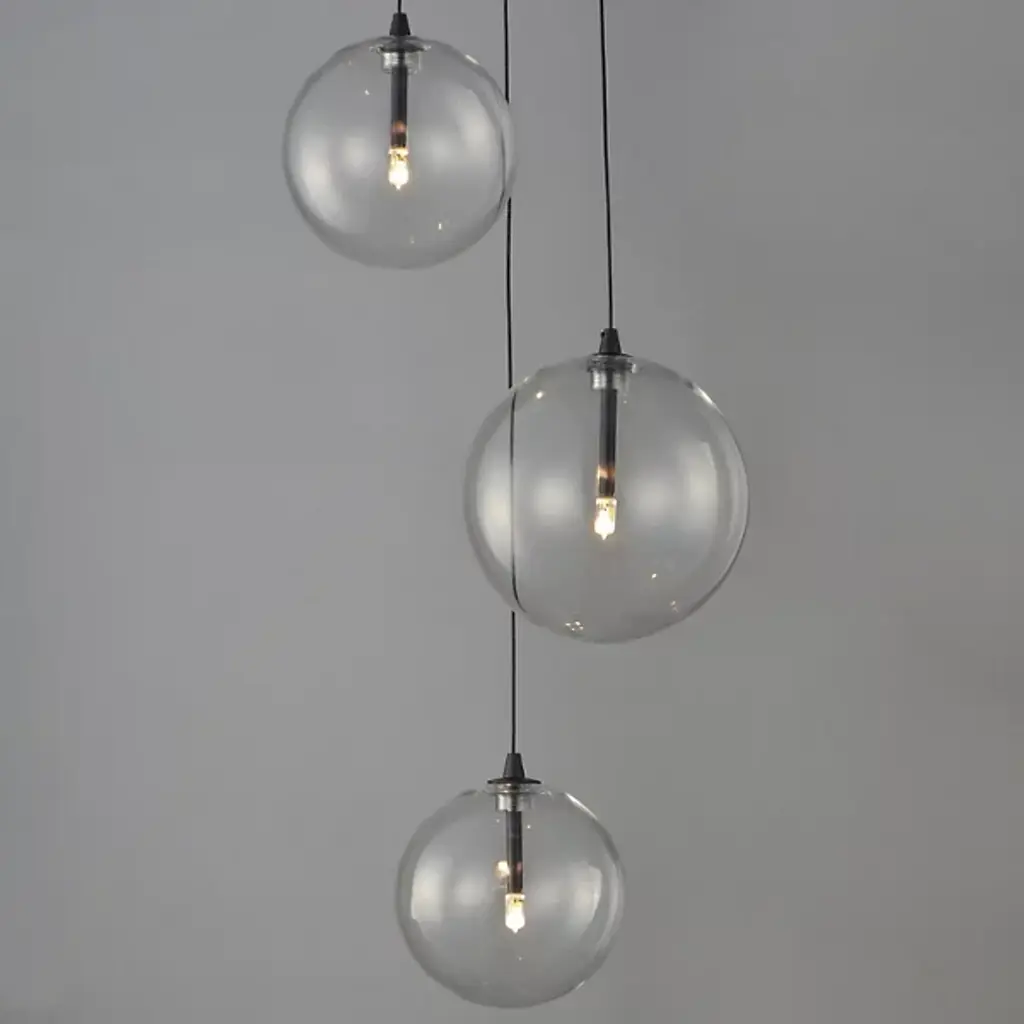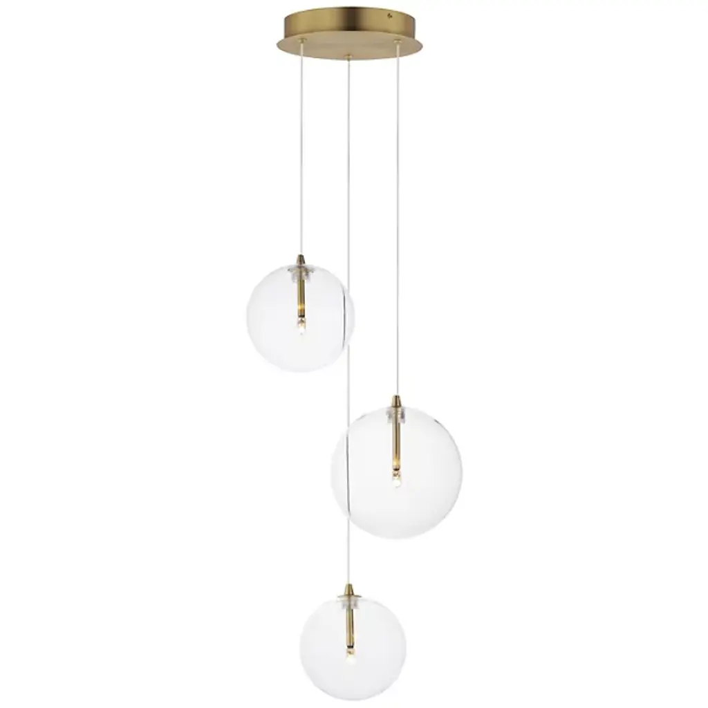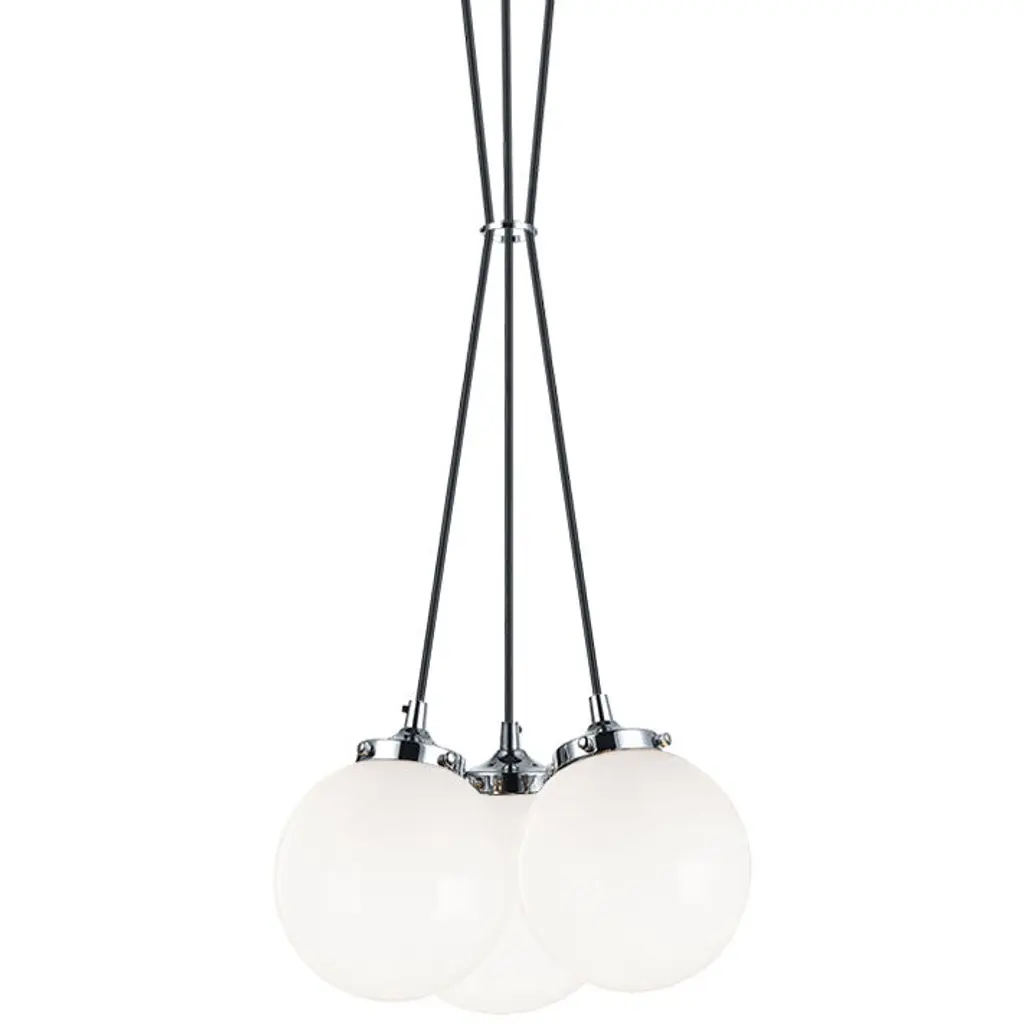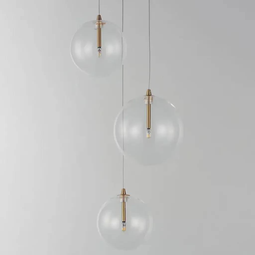 The Global Multi Light Pendant from ET2 Lighting presents a minimalist yet remarkable design. Three clear glass globes of varying sizes hang from thin cords, creating an asymmetrical, entrancing arrangement. Each sphere houses a single bulb, its light unobstructed by the transparent enclosure. The fixture's sleek disc canopy provides a subtle anchor point for the suspended orbs. This pendant is perfect for modern interiors seeking some understated drama.