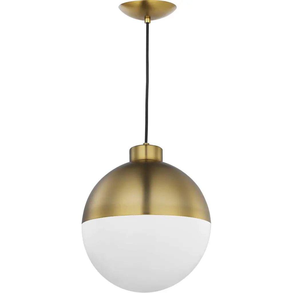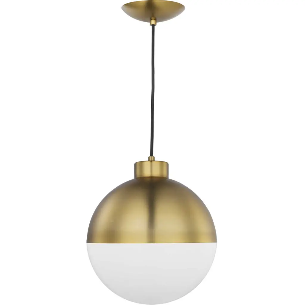 A distinctive classic globe pendant is accented by a striking metal brushed bronze cap. The cap holds a beautiful opal glass shade ready to emit gentle illumination. This versatile pendant can be displayed as a single fixture or in groups of two or more to create a custom lighting design for your home.