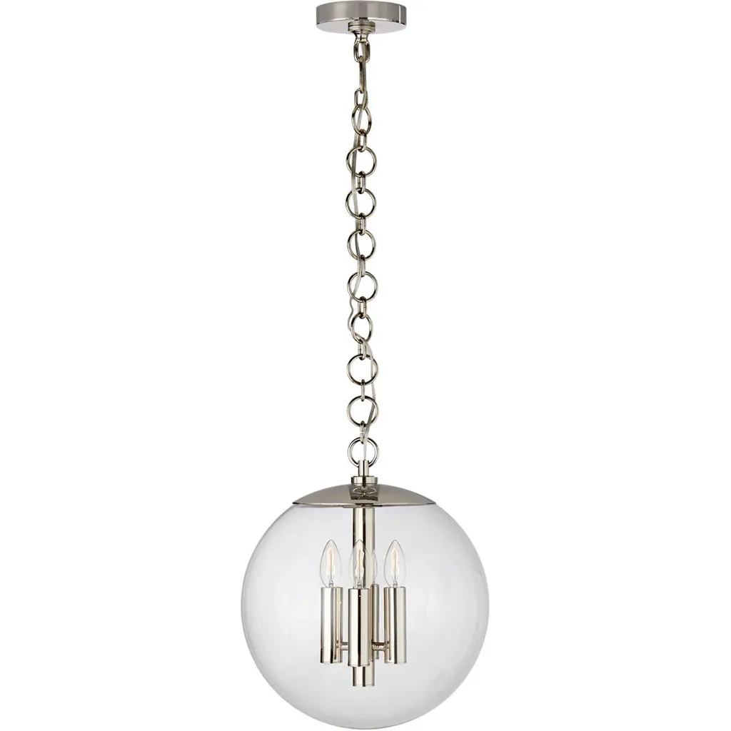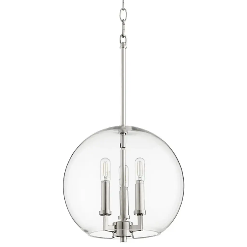 Rule all angles of a room with the Globe Pendant, an elegant contemporary fixture from Quorum International. Elegant and eye-catching, a smooth aluminum disc canopy drops a central chain and stem that travels through a globe shade before angling up from the shade’s base as candelabra-style lamping. The clear glass mellows glare from the lamping on all sides while staying open at the bottom for both access to swap out lightbulbs and a more direct splash of illumination from above.