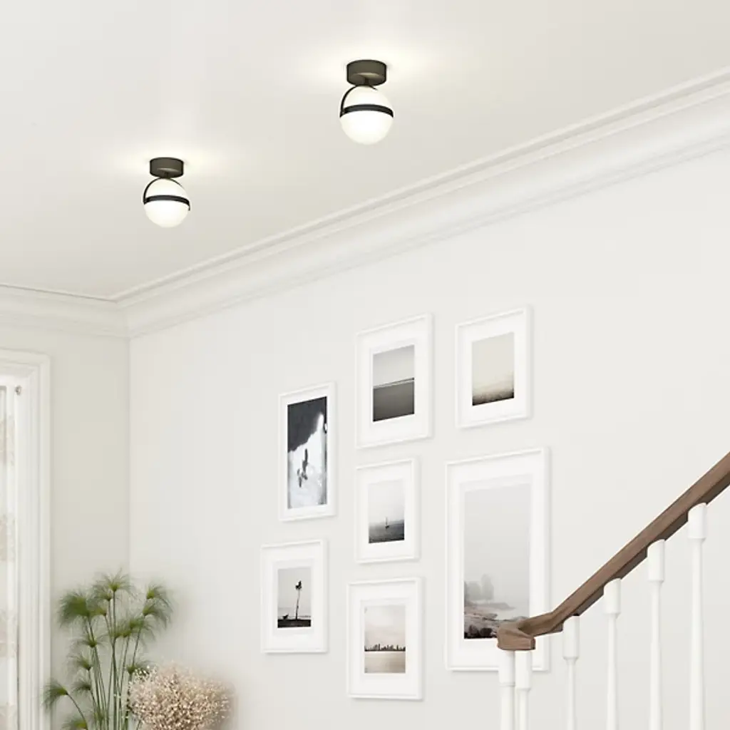 The Globo LED Semi-Flushmount from Alora is a mid-century modern piece that captures the essence of a timeless scale model of the Earth. Like a classic globe, it sparks a feeling of wonder and sheer curiosity, beginning with a silhouette comprised of an instantly recognizable cylindrical base, sphere, and banded metal. The banded metal segment can be adjusted like the longitudinal lines on a globe. A clean, encompassing glow radiates out of its clear Acrylic shade thanks to a sleek LED lighting setup.