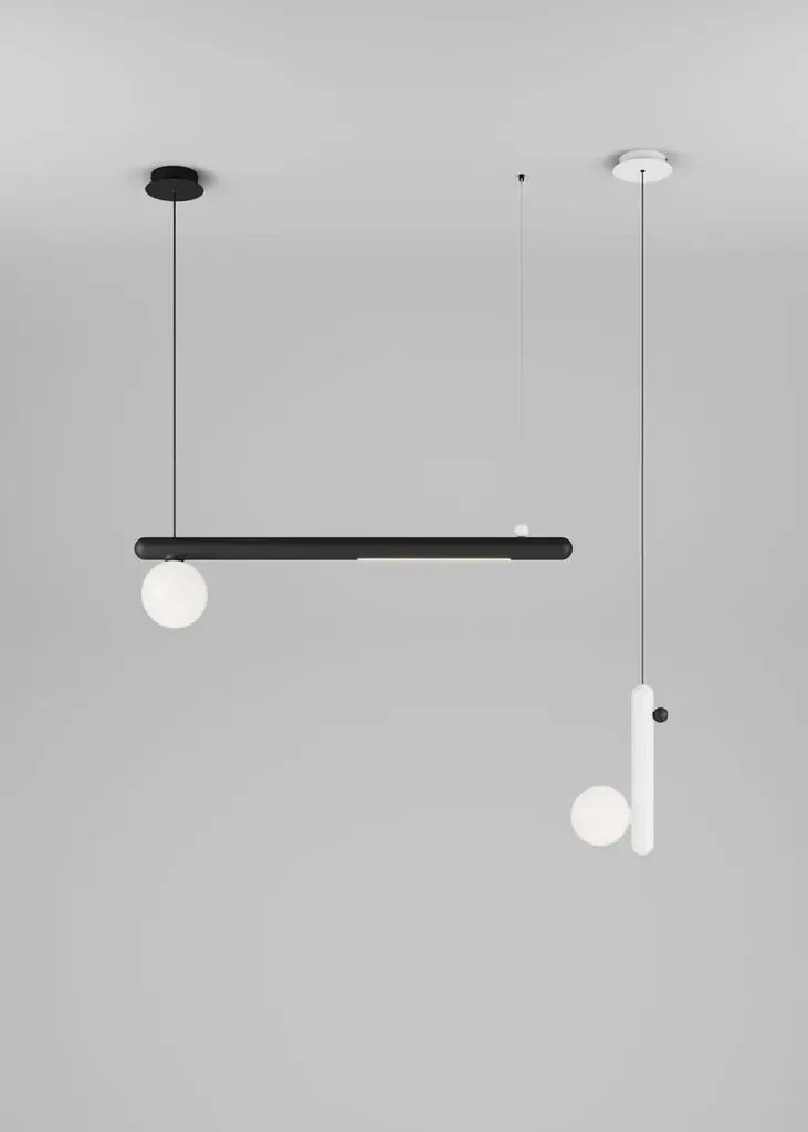 Gocce is a pendant lamp featuring a structure in glossy lava red polymer, matte midnight grey, or glossy white. It includes a white glass diffuser and a decorative metal sphere with a finish matching the structure.Electrical Specifications:14.2W LED – 1196 lm – 3000K – CRI>90 – IP20