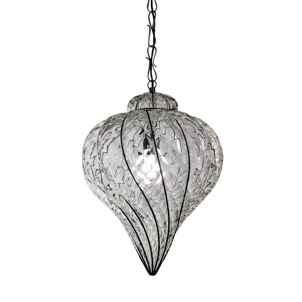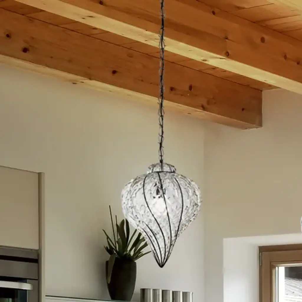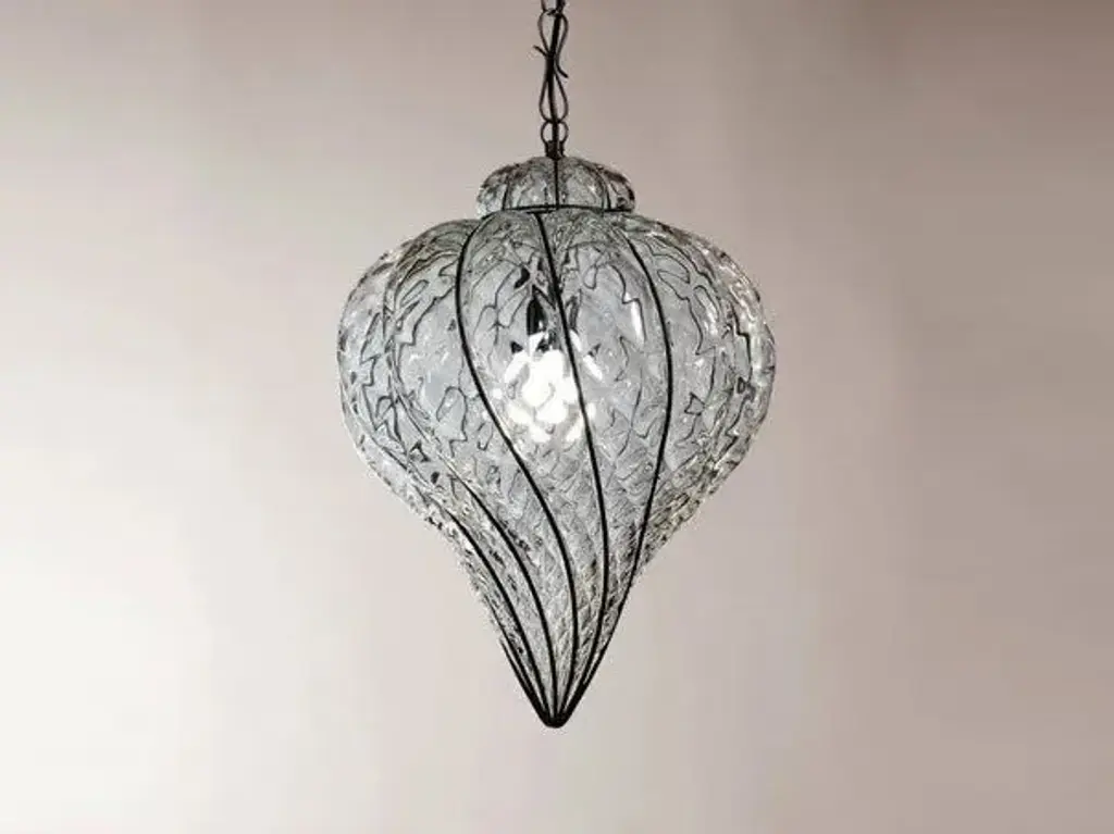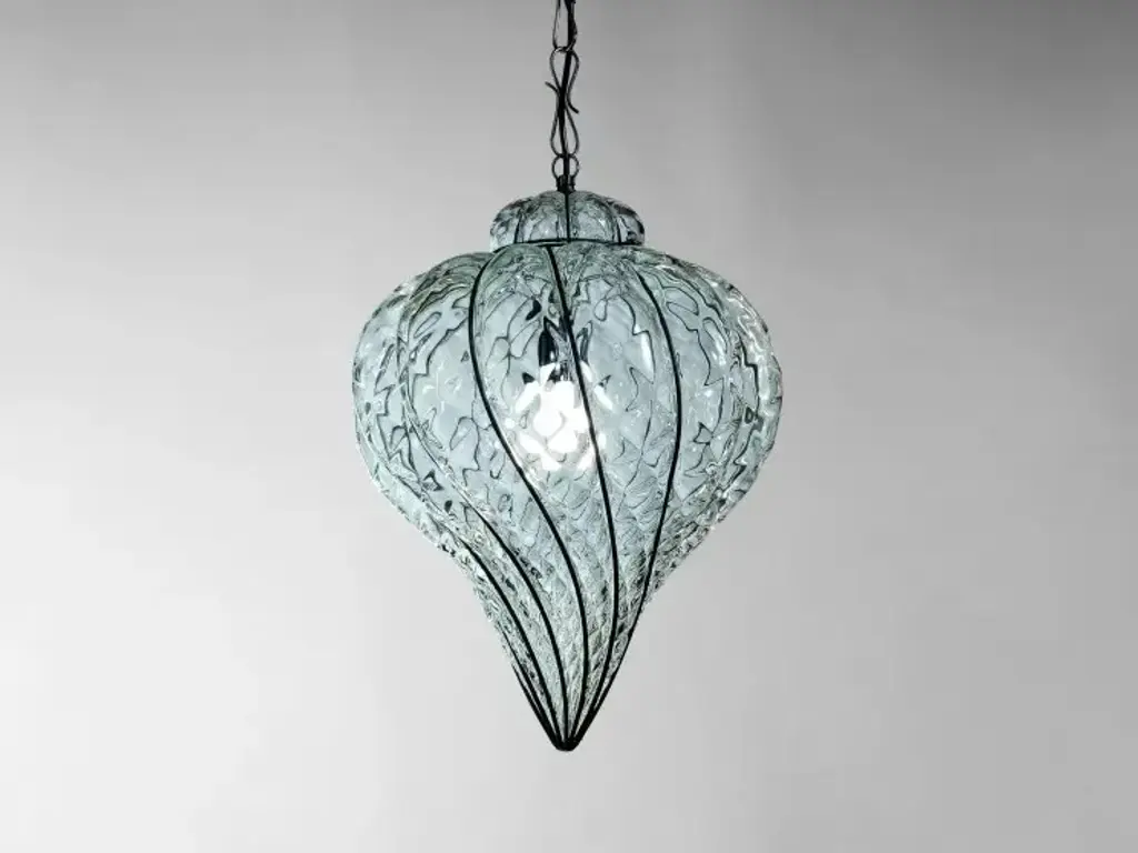 Drop evokes the natural simplicity of water.A fluid shape, the soft colors that transpire from the reliefs of blown glass with balotton technique, the cage in slight torsion almost to suggest a configuration of unstable balance.Lightness and infinite flashes.Technical data250VMS111-025, 1X E14 max 40W ~MS111-035, 1X E27 max 60W ~MS111-050, 1X E27 max 60W ~IP20The drop, a shape as difficult to obtain for glass masters as it is famous; it is available as a pendant light, applique, table lamp, floor lamp and ceiling lamp.
